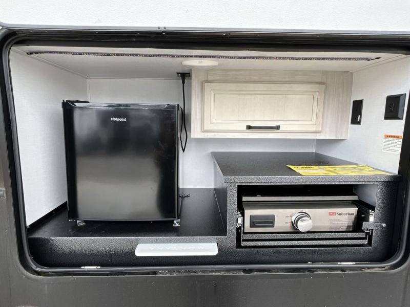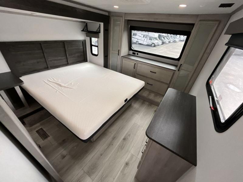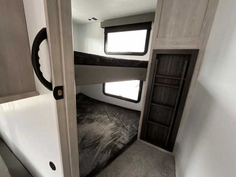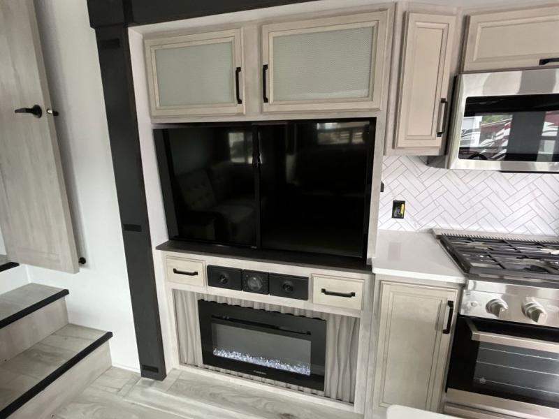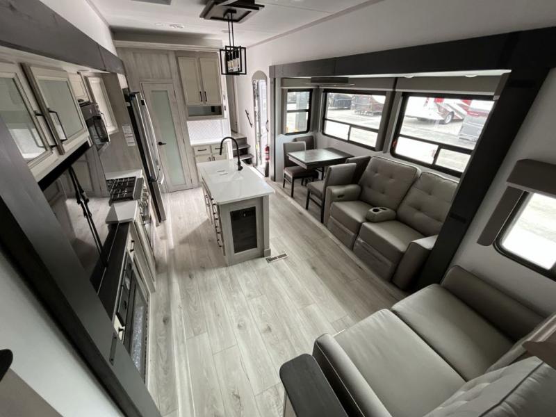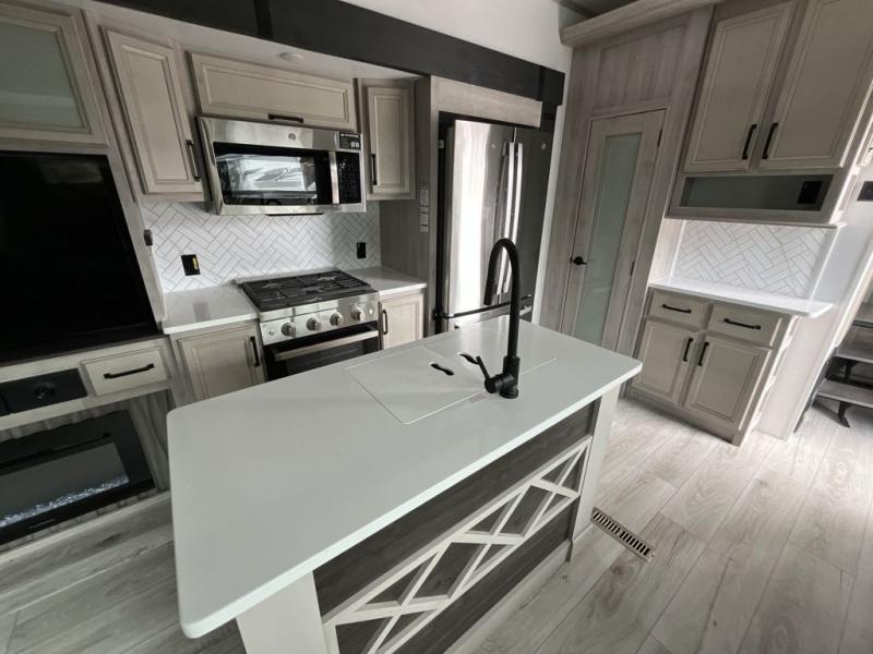You will be living in true luxury with this Montana High Country fifth wheel! First of all, you'll have your own master suite up at the front which happens to have a Lippert duo memory foam mattress for great comfort. The bedroom also has great storage space for your clothes with the two dressers and two wardrobes. Second, there is a great sleeping area in the back for the extra travelers you have with you. The RV queen-size bunks allow four adults to sleep comfortably each night in this area, and there is even a hide-a-bed sofa next to the bunks for yet another set of sleepy campers. The power theater seating sits directly across from the fireplace and 50" LCD TV, and the kitchen island has a countertop extension for even more prep space in the kitchen.