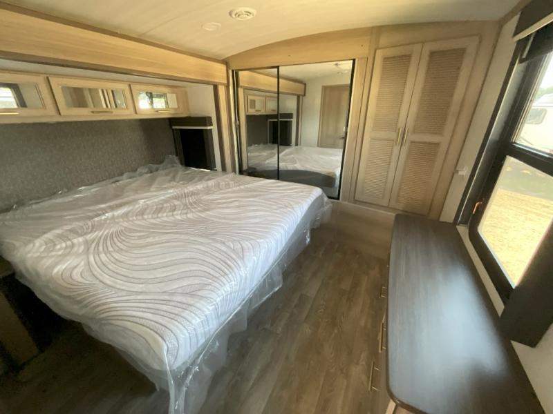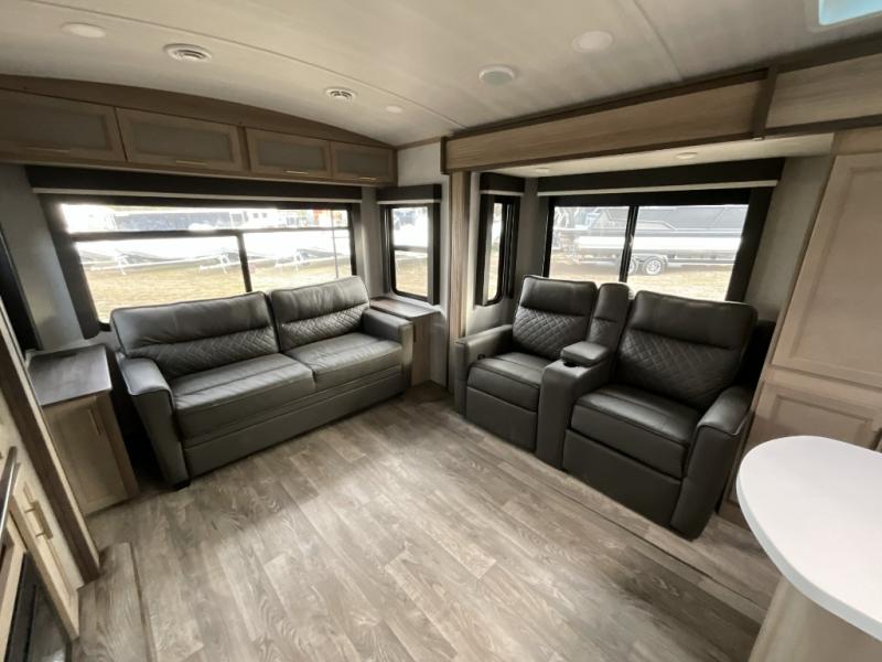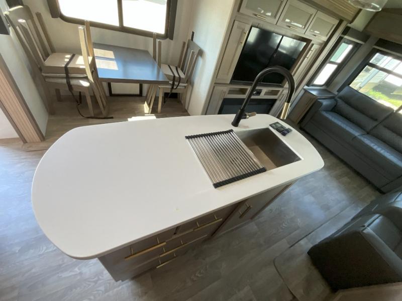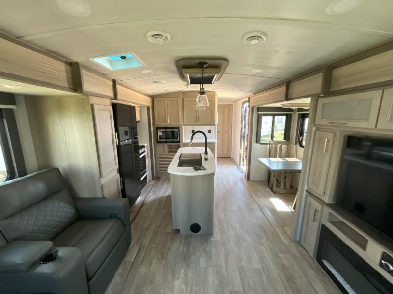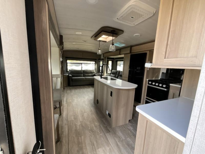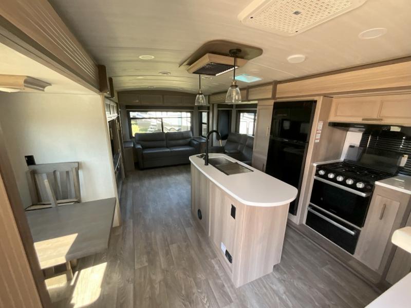 A spacious rear living area is created by two opposing slide outs giving everyone plenty of floor space to move from the sofa sleeper to the double entry bathroom and front private bedroom. You can relax on the theater seats while watching the 50" HDTV with fireplace below, and dine at the booth dinette. The kitchen island is a great place to wash the veggies and fruit, and prepare meals. The cook will have full amenities including more counter space near the microwave. And there is an outside kitchen with a flip-out stove and more. The slide out king bed gives you more space in the front bedroom, and you will find plenty of storage and a place for your best friend in the built-in pet kennel.