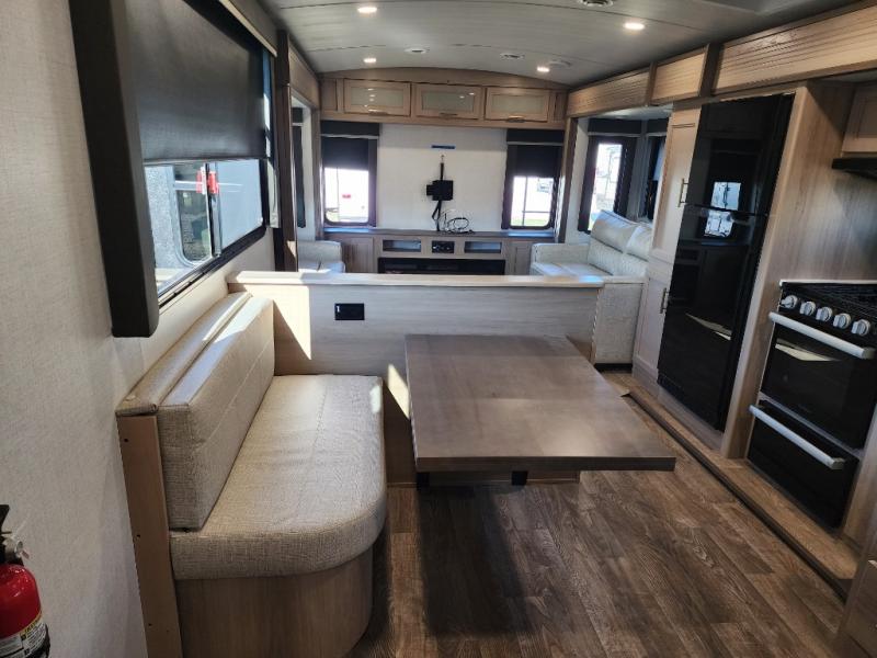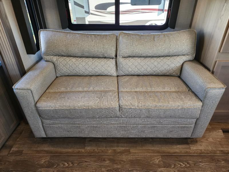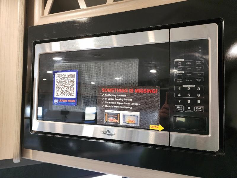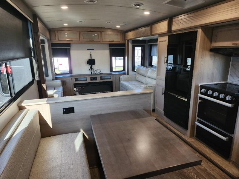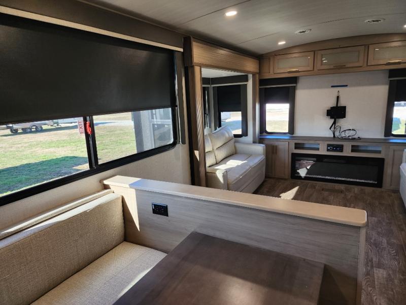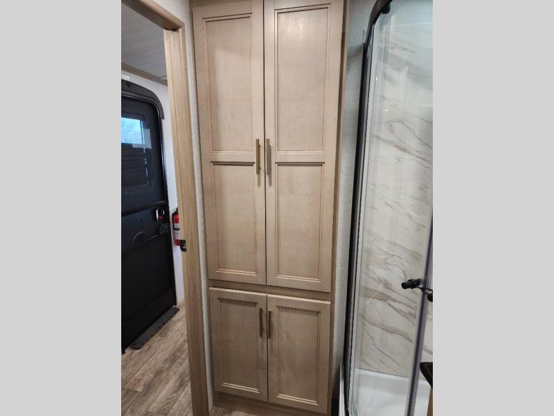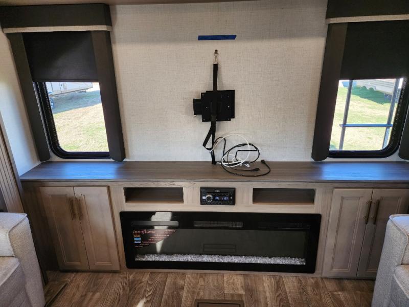 With a rear entertainment center including a 55" HDTV with fireplace below, and dual sofa sleeper slides, you will enjoy a spacious living area to visit with friends while you sit on the theater seats. The middle kitchen offers full amenities including a pantry and 10 cu. ft. refrigerator to store lots of food to feed everyone. The bench dinette seating allows you to dine or work in this area. Everyone will appreciate easy access to the double entry bathroom, especially you when it's nighttime and you are sleeping on the king bed slide out. Your family pet will have their own space, and you will find plenty of storage choices, plus there is washer/dryer prep if you want to the option to make laundry day easier.