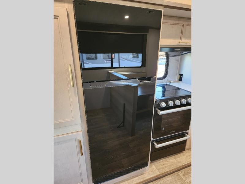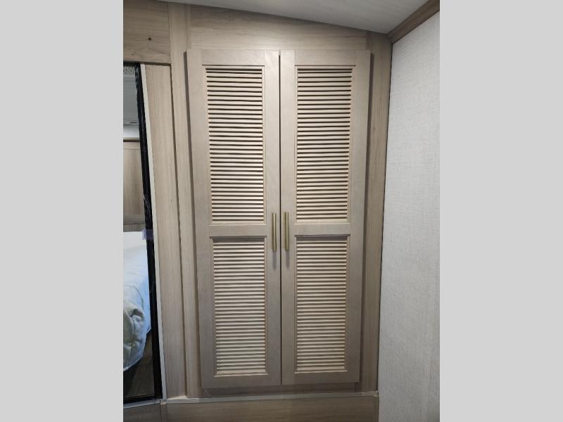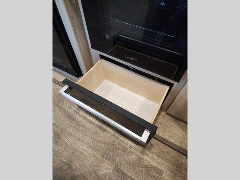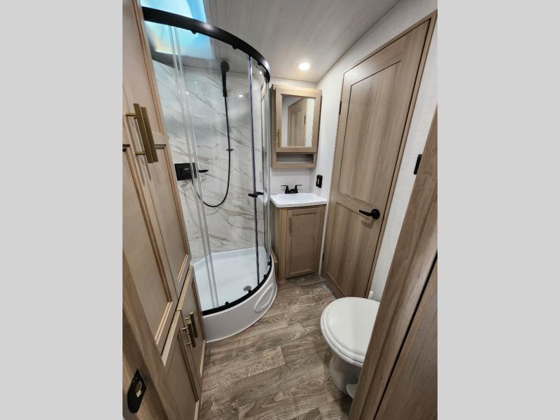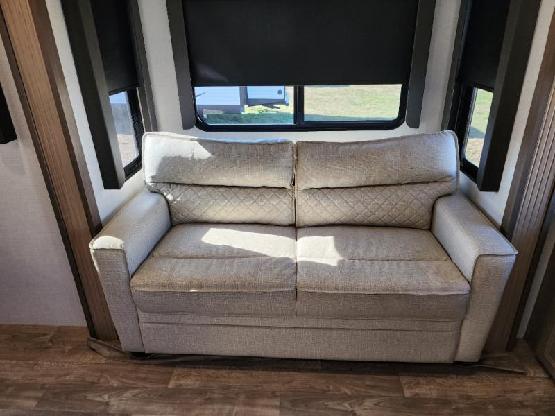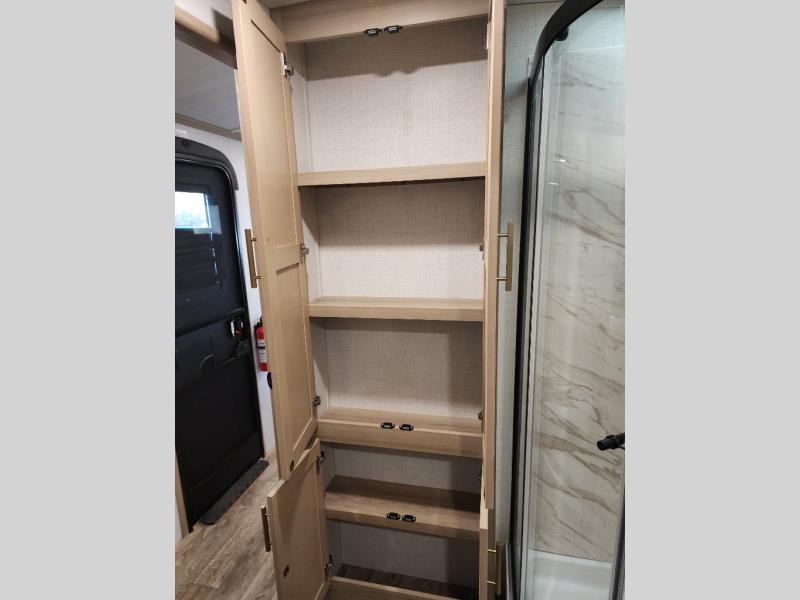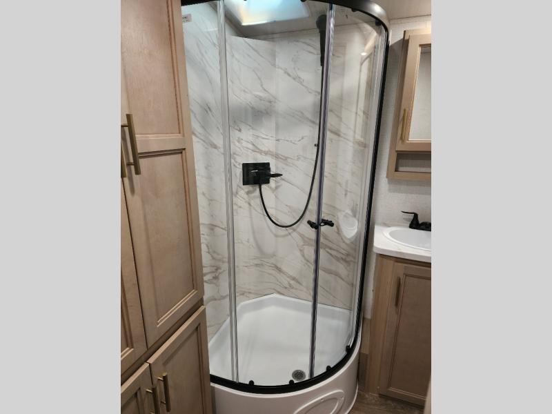 With a rear entertainment center including a 55" HDTV with fireplace below, and dual sofa sleeper slides, you will enjoy a spacious living area to visit with friends while you sit on the theater seats. The middle kitchen offers full amenities including a pantry and 10 cu. ft. refrigerator to store lots of food to feed everyone. The bench dinette seating allows you to dine or work in this area. Everyone will appreciate easy access to the double entry bathroom, especially you when it's nighttime and you are sleeping on the king bed slide out. Your family pet will have their own space, and you will find plenty of storage choices, plus there is washer/dryer prep if you want to the option to make laundry day easier.
