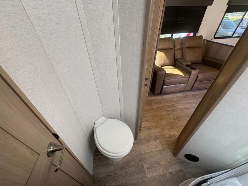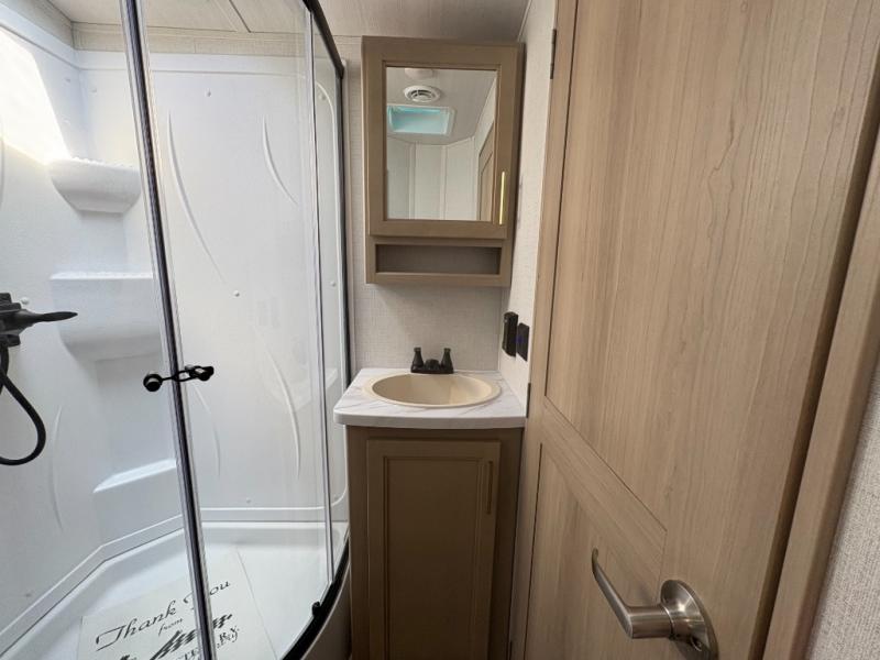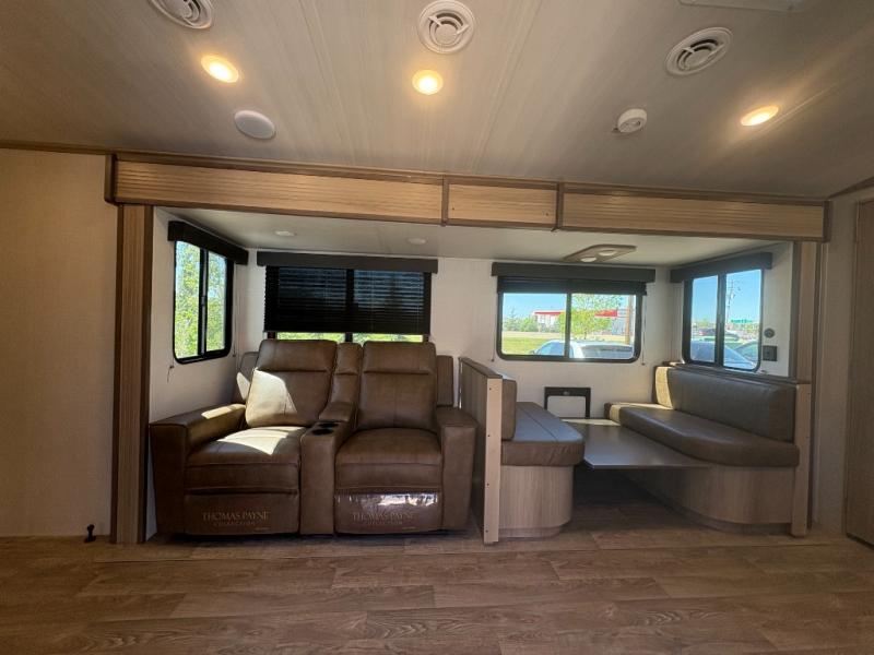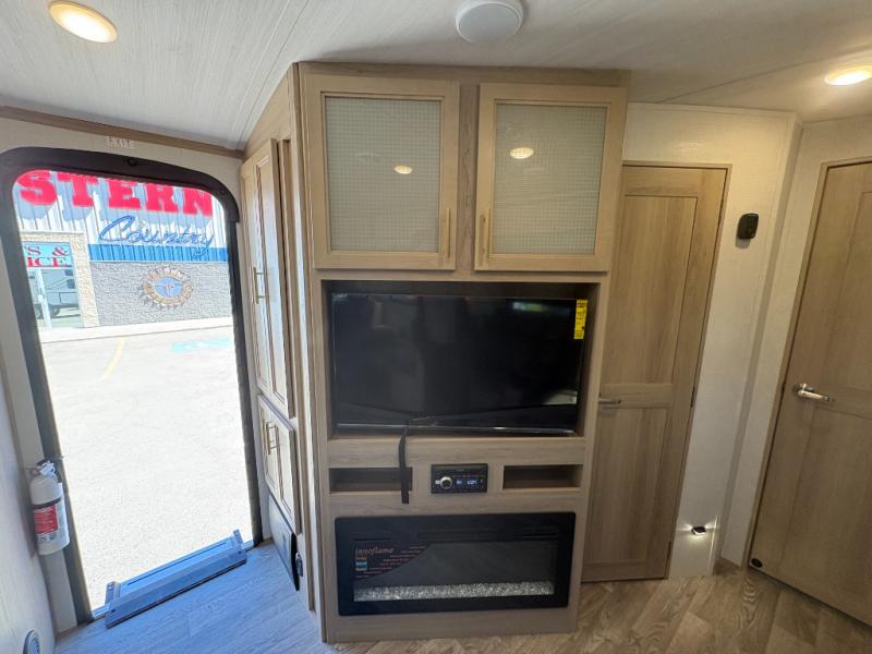 Come see all that this travel trailer has to offer! You will get a good night's rest each night on the 72" x 75" king bed slide, and your furry friend can sleep in there too with the built-in pet kennel storage underneath. There is even one of the dual entry doors to the unit, and an entrance into the dual entry bathroom which has a 34" radius shower to freshen up in every morning. Head to the front kitchen to brew a cup of coffee at the coffee bar then start frying up some eggs on the three burner cooktop and grab some oatmeal from the walk-in pantry. You can enjoy your meals at the booth dinette and then read the morning newspaper in comfort on the sofa sleeper across from the entertainment center with a 36" fireplace. The sofa sleeper can be switched out for optional theater seating, and the booth dinette can be switched out for the optional table and chairs!
