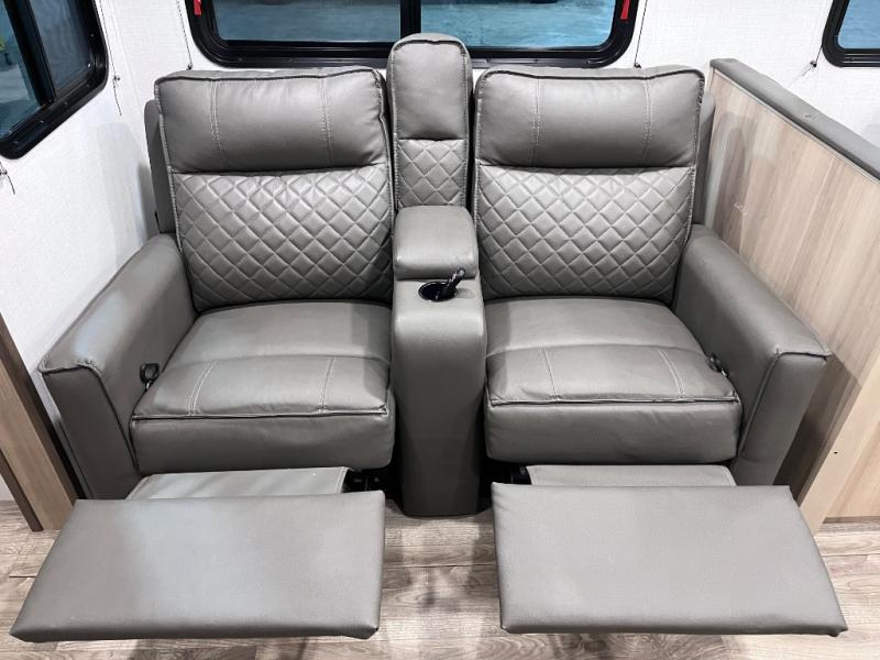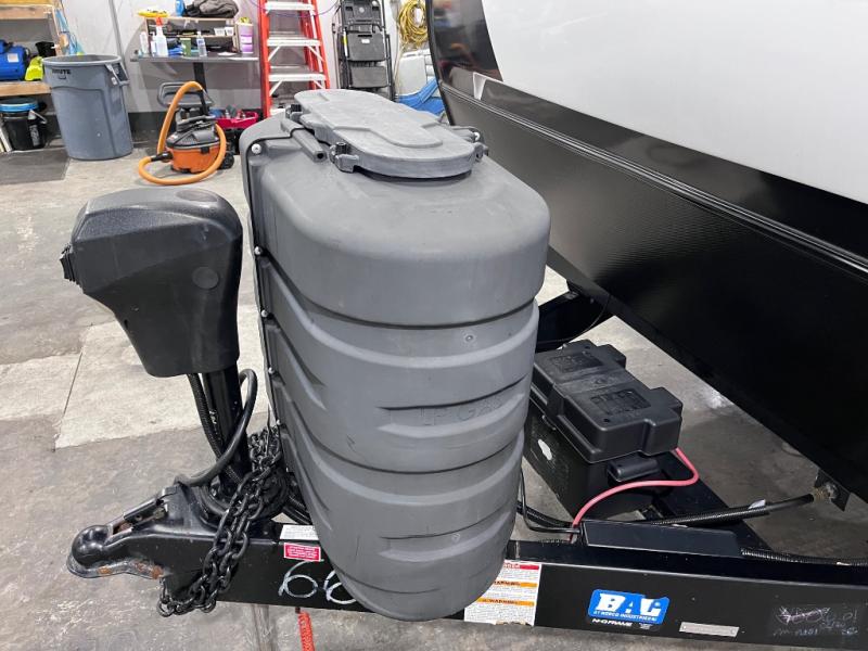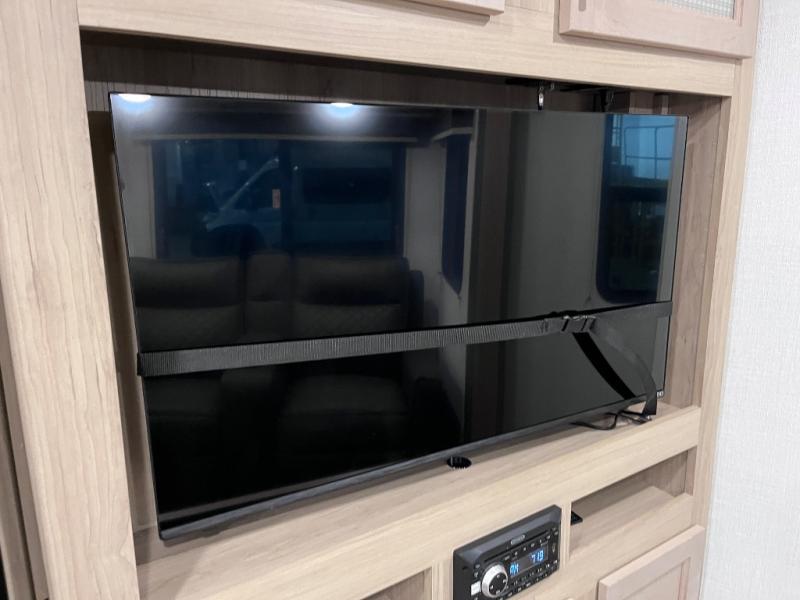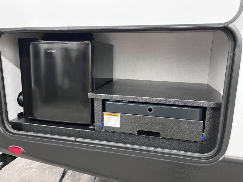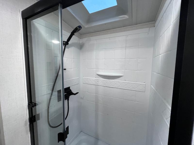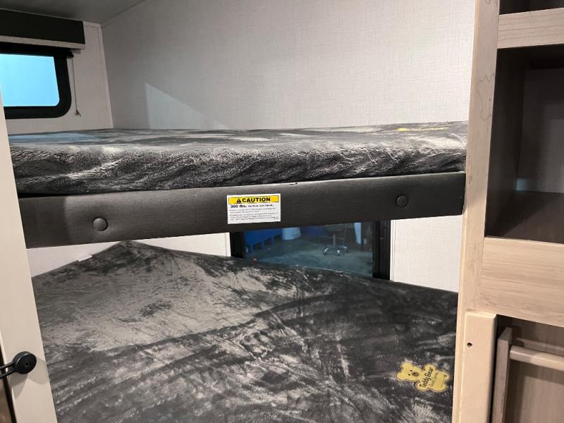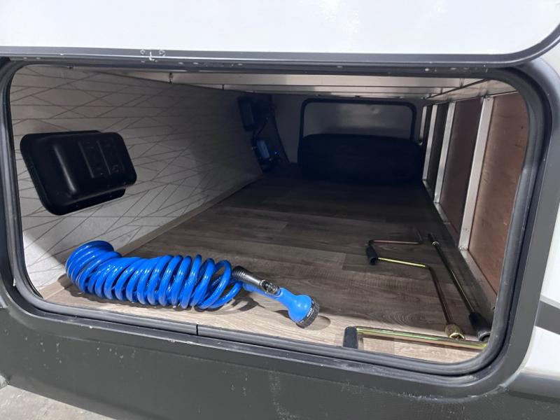 Get out and explore, hike, and camp in comfort! This trailer offers a private bunkhouse with double-size bunks and a wardrobe, a private front bedroom with a walk-around queen bed with a built-in pet kennel storage for your family's best friend, a laundry chute to keep everything tidy, and dual wardrobes for your clothing. You can access the walk-through bathroom from the bedroom and the main living and kitchen area through barn slider doors. Your guests can sleep on the sofa sleeper and booth dinette slide out while watching the 40" TV within the entertainment center after grabbing some snacks from the hidden pantry. There are full kitchen amenities inside, plus there is an outside kitchen to use, a 21' awning offers protection from the elements, and a pass-through storage to carry your larger gear like fishing poles, an outdoor table, and camping chairs.
