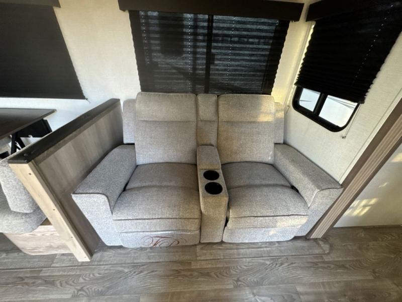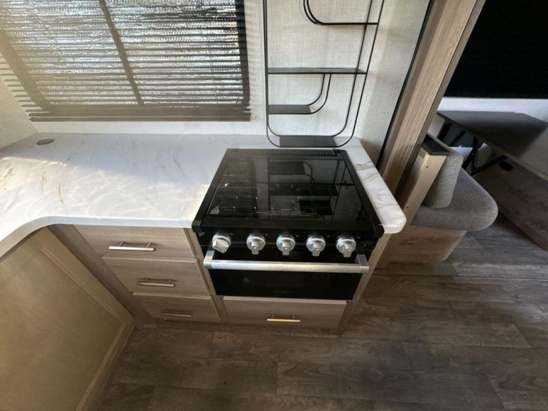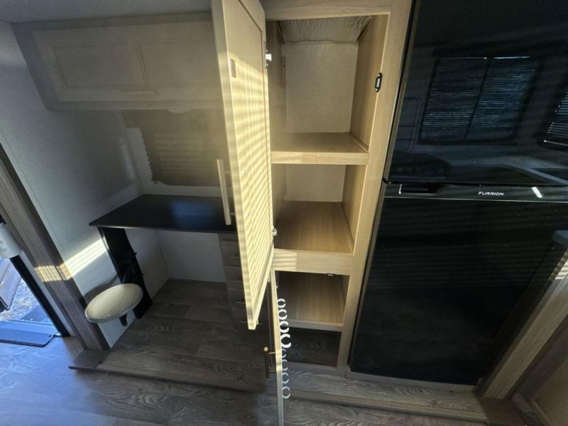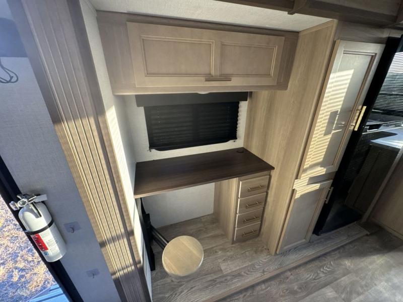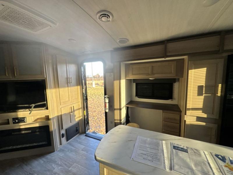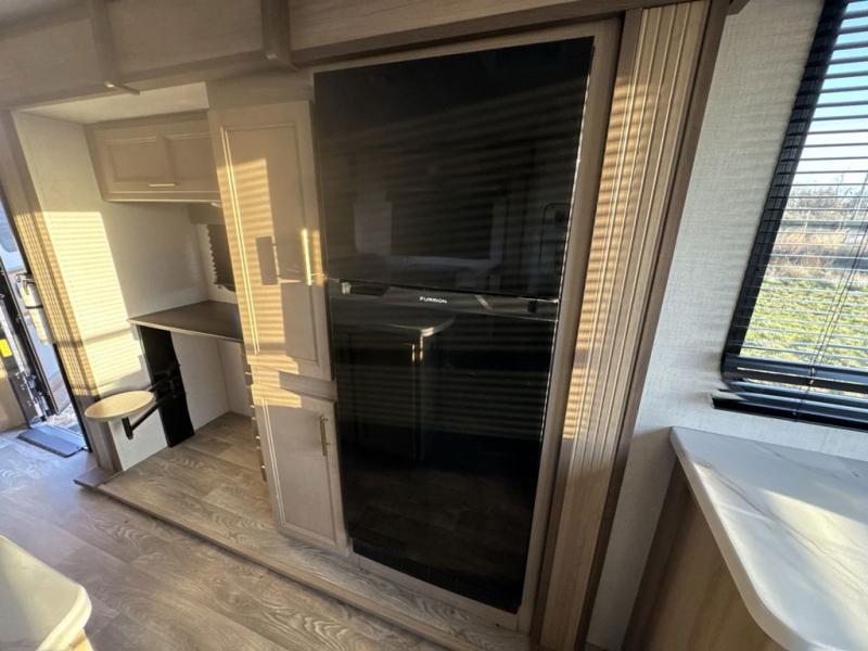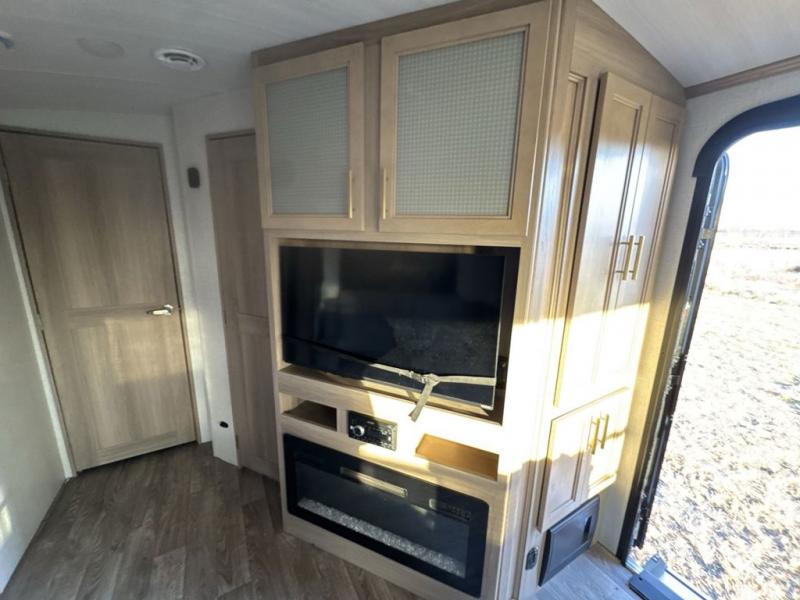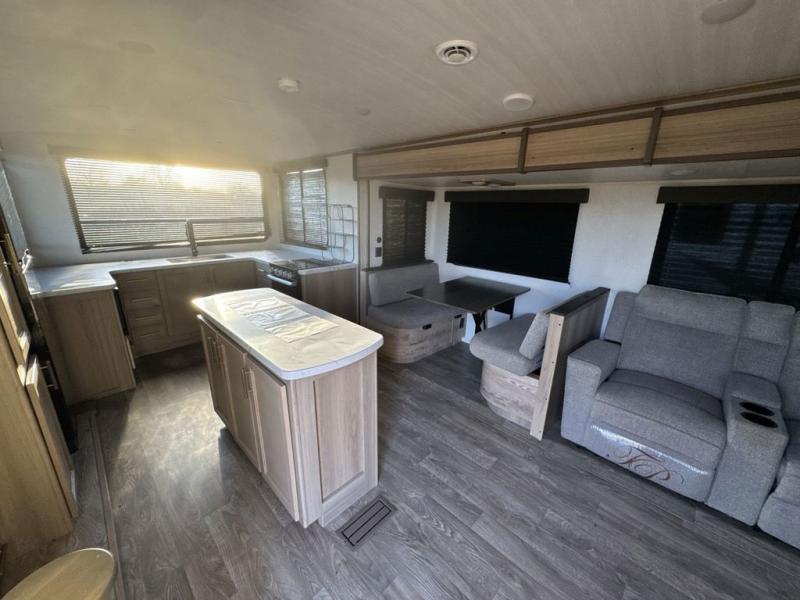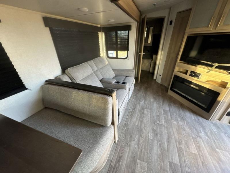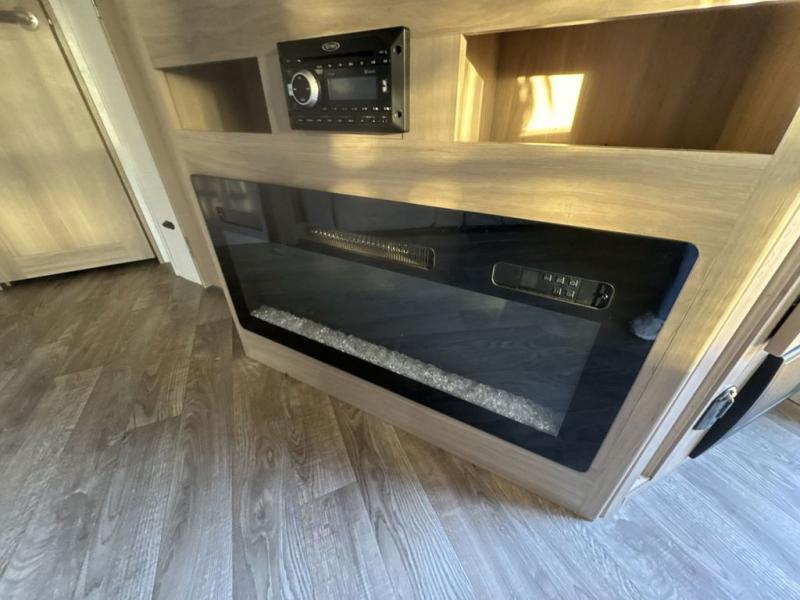 There is so much to love about this spacious travel trailer, you may just want to take it out every weekend! The dual opposing slides in the main living area provide your crew with ample space to move about, and the kitchen island brings the room together. Speaking of the kitchen, you'll love the wrap-around counter space here, along with a three burner gas range with a 17" Furrion stove, and a 10 cu. ft. 12V refrigerator. The booth dinette and sofa sleeper offer a place to sit and sleep, or you can choose the optional table and chairs in place of the dinette or the optional theater seating in place of the sofa to make this a couple's coach. This model also includes a desk so you can get some work done while you're away from home, and the 36" fireplace is sure to make it feel more cozy!