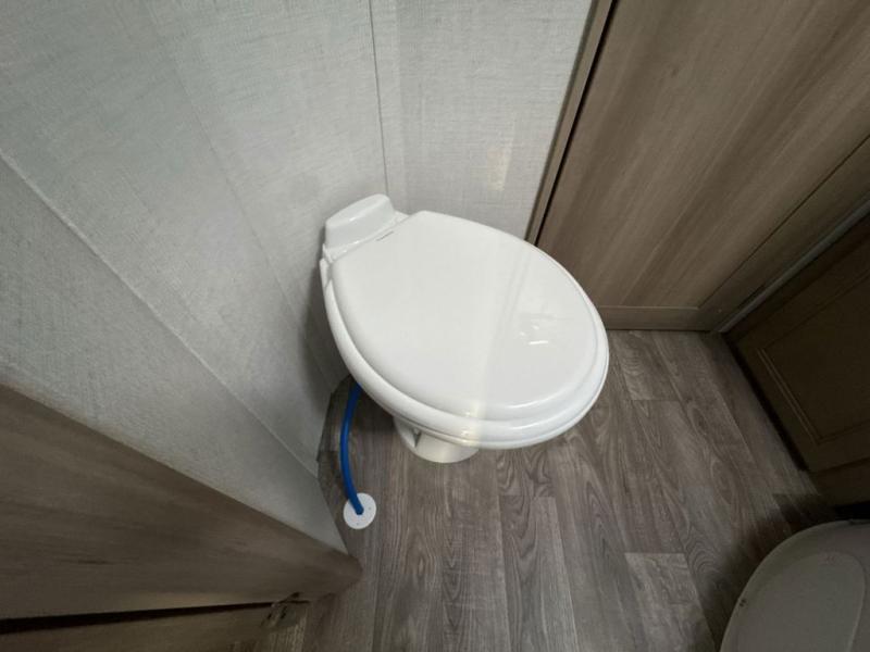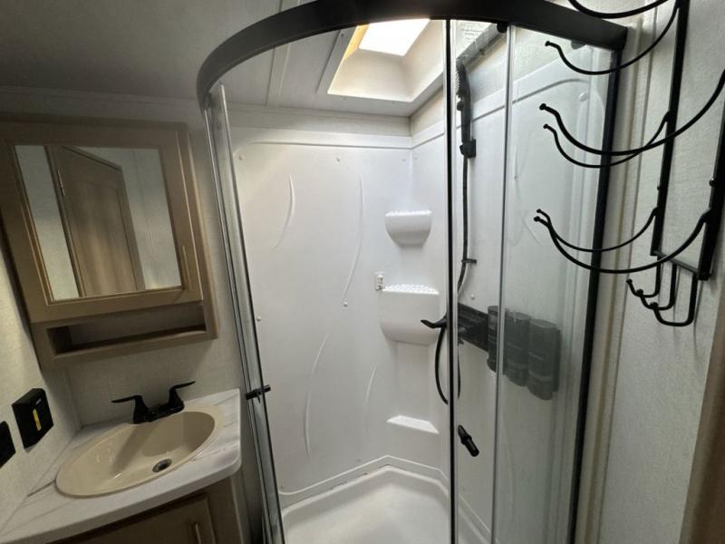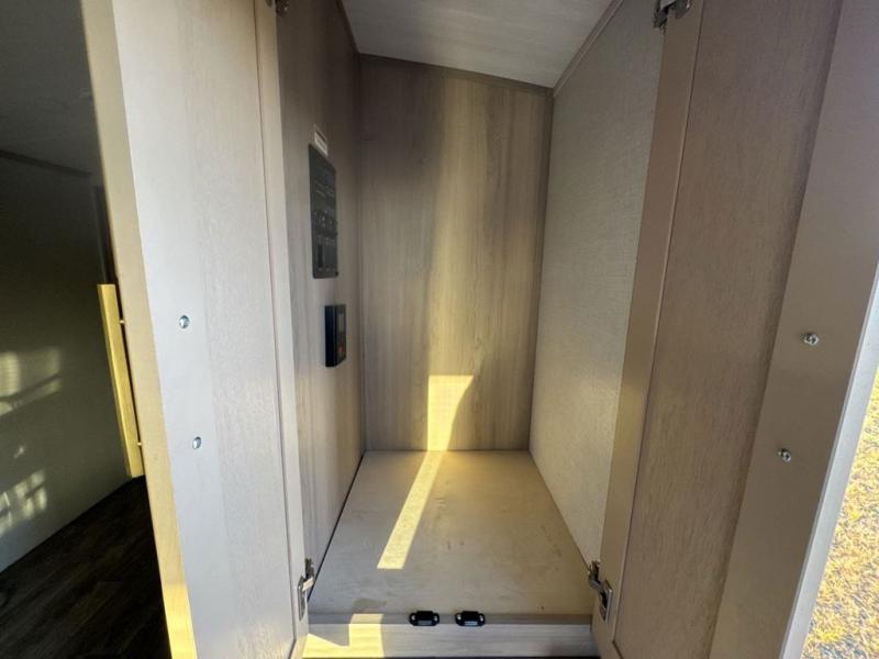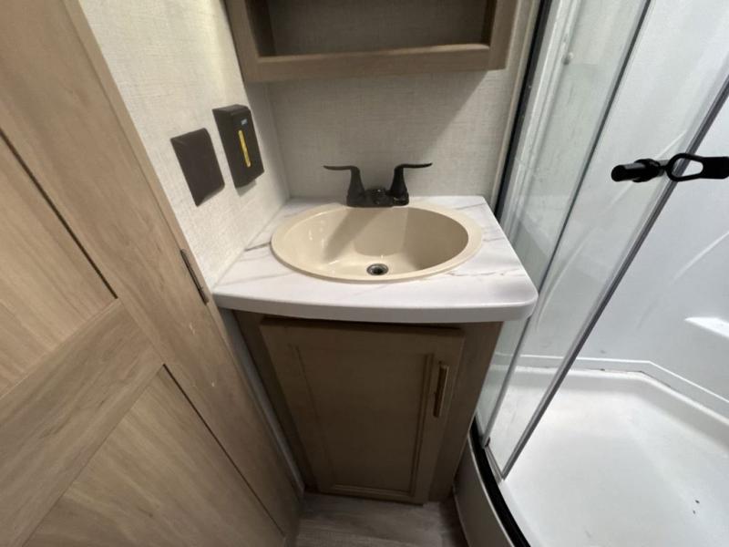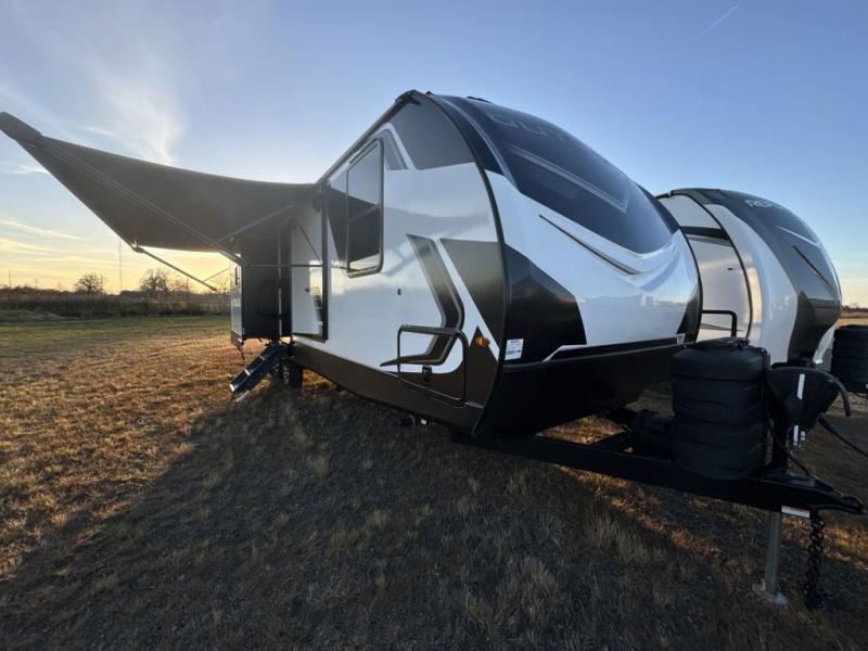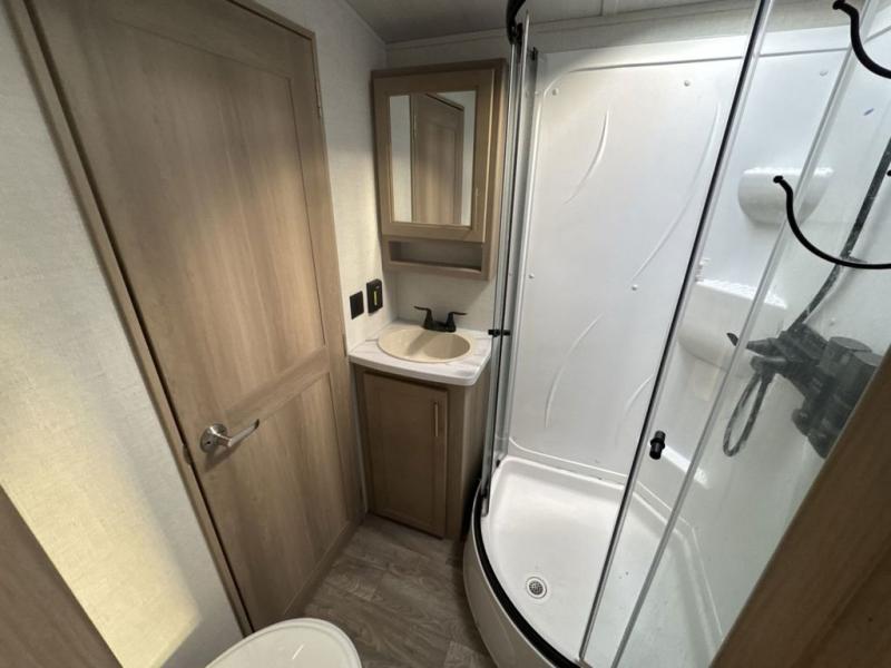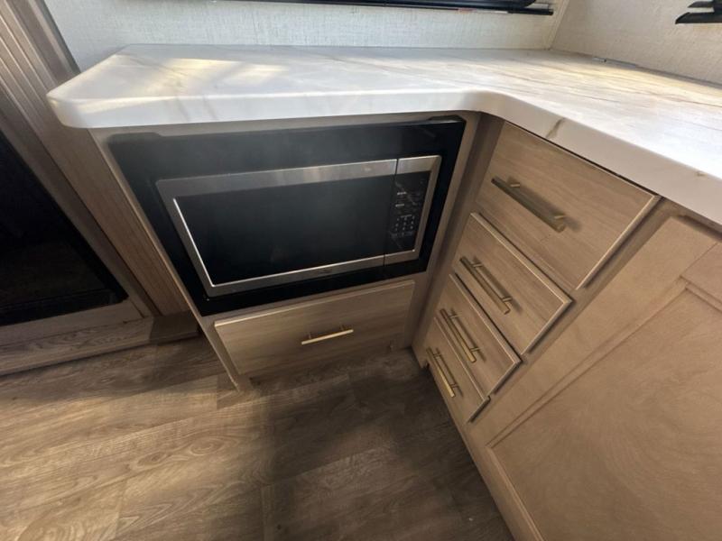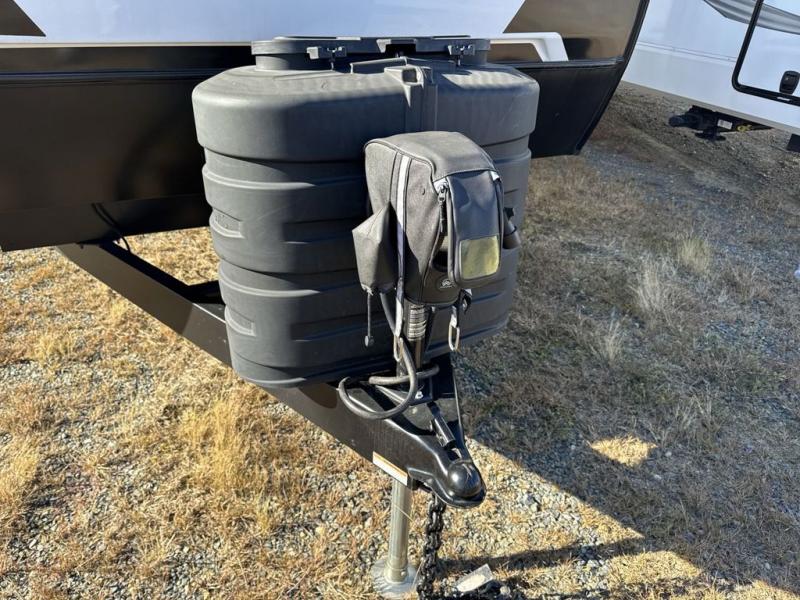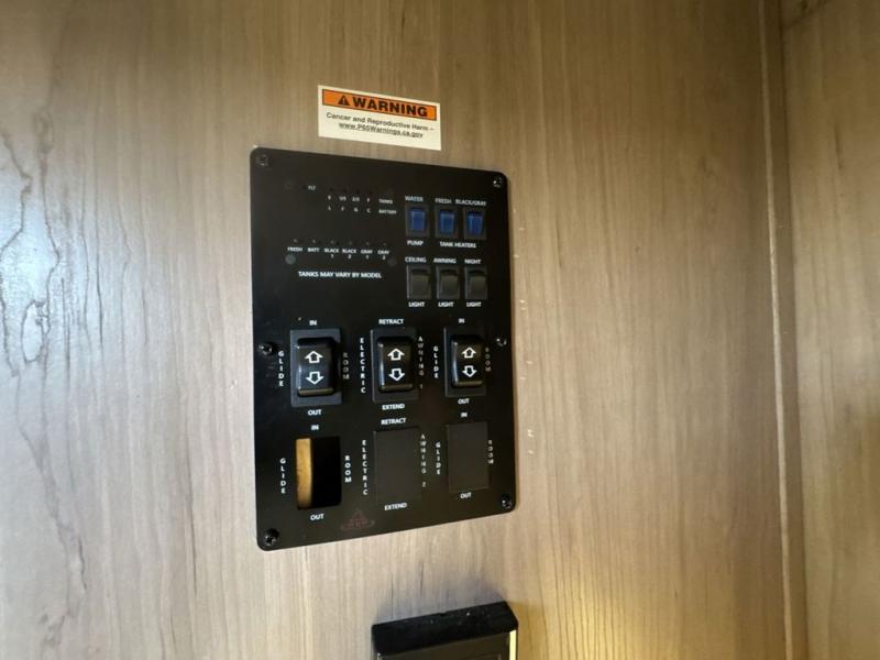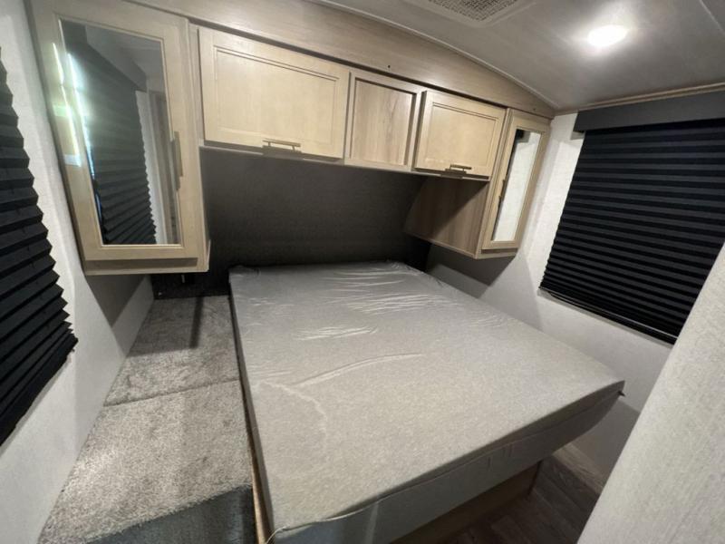 There is so much to love about this spacious travel trailer, you may just want to take it out every weekend! The dual opposing slides in the main living area provide your crew with ample space to move about, and the kitchen island brings the room together. Speaking of the kitchen, you'll love the wrap-around counter space here, along with a three burner gas range with a 17" Furrion stove, and a 10 cu. ft. 12V refrigerator. The booth dinette and sofa sleeper offer a place to sit and sleep, or you can choose the optional table and chairs in place of the dinette or the optional theater seating in place of the sofa to make this a couple's coach. This model also includes a desk so you can get some work done while you're away from home, and the 36" fireplace is sure to make it feel more cozy!
