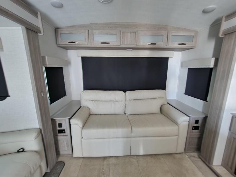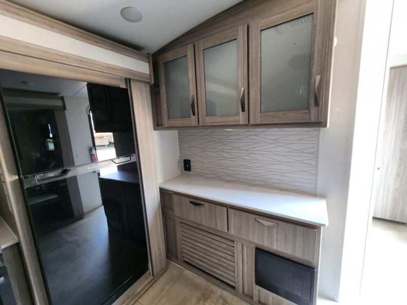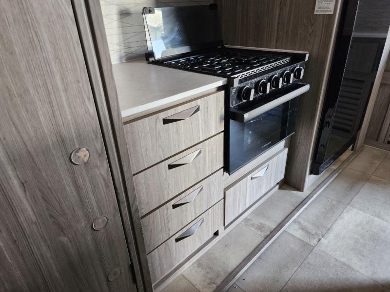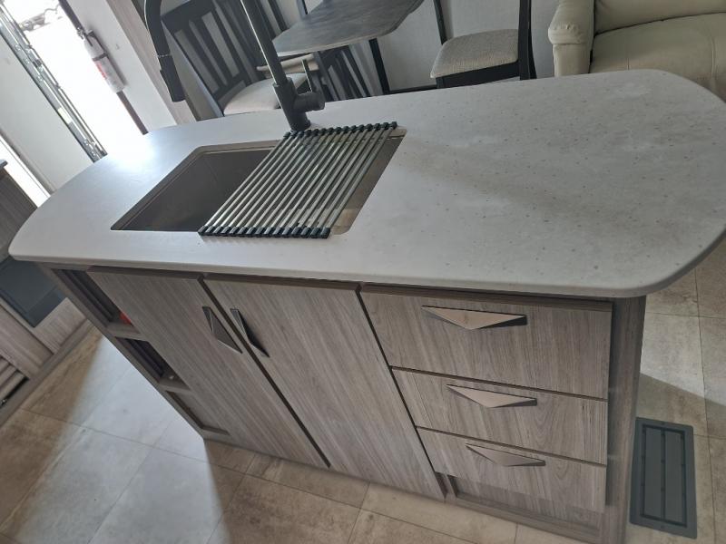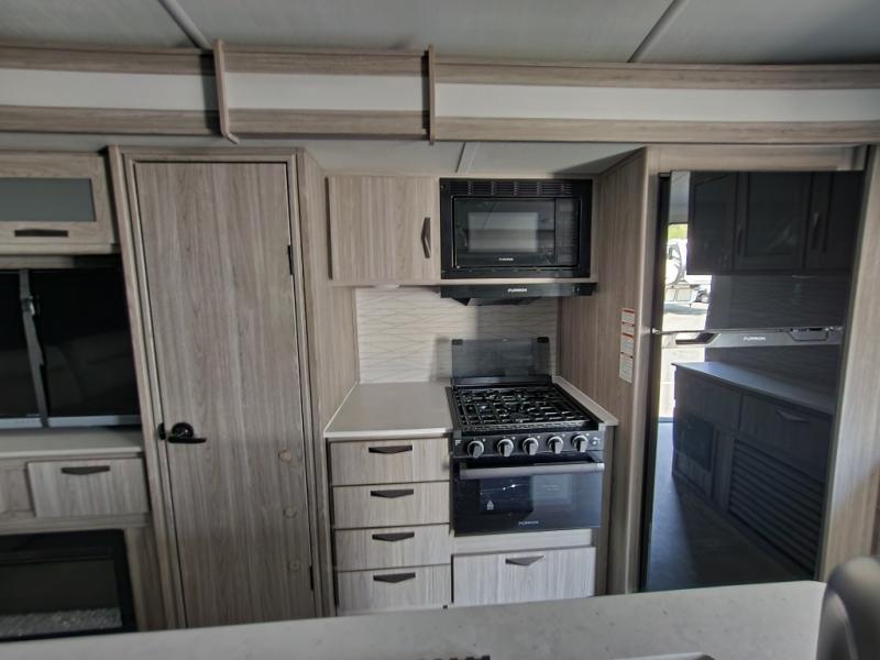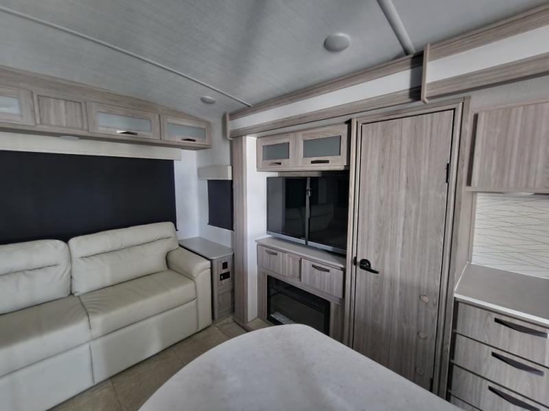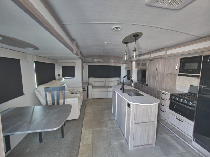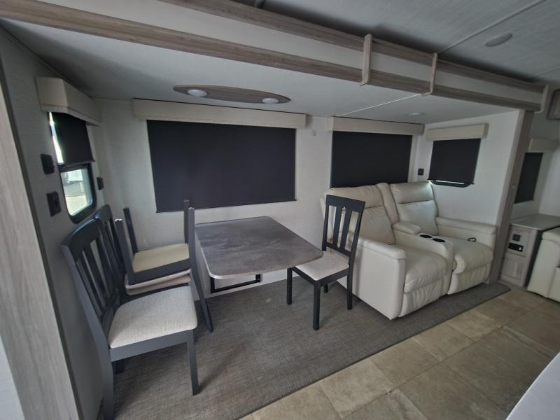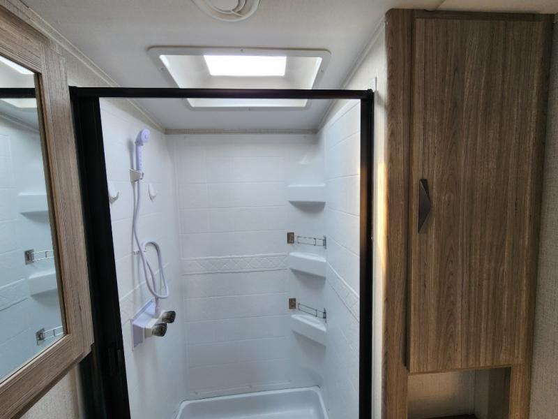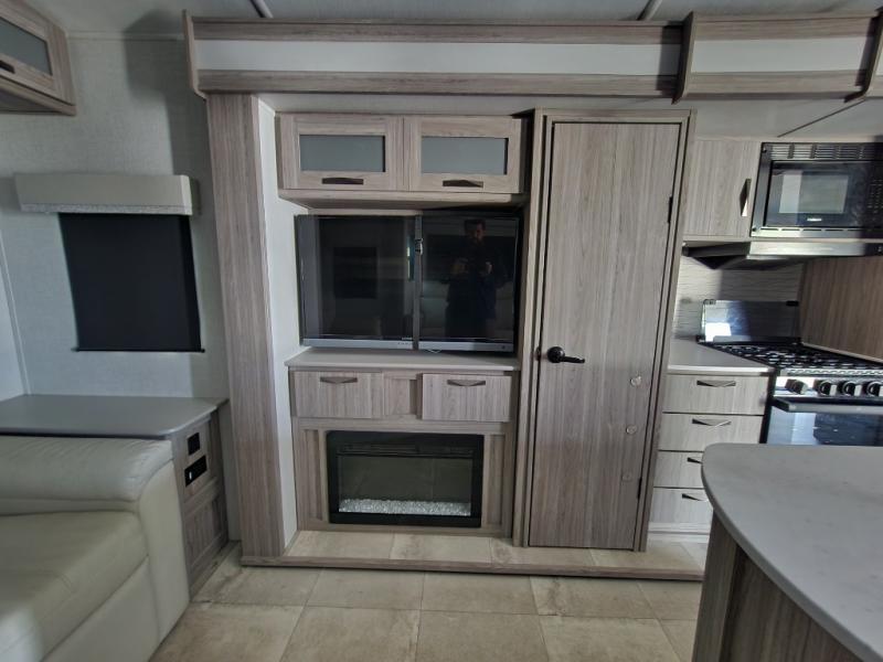 Pack your bags and hitch up this travel trailer for a fun weekend getaway! The rear living area has a tri-fold sofa sleeper with end tables to set your bag of popcorn that was popped in the microwave and theater seating across from the entertainment center with a TV and a fireplace. The kitchen island will make meal prepping easier and you can enjoy your meals at the booth dinette or switch it out for the optional free standing dinette. Freshen up in the full bathroom with the shower that has a skylight above for more natural lighting. Head to the front private bedroom when you're ready to wind down your nights and get a good night's rest on the queen bed with nightstands and wardrobes on either side of it!