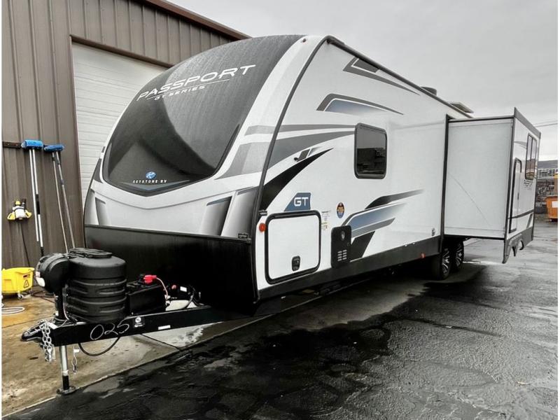 Each one of these Keystone RV Passport GT travel trailers offer grand style and multi-functional features! They have best-in-class storage for big things like paddle boards and small things like sleeping bags. There's no need for cordless drills and bending over to put the jacks down, simply push a button and the power stabilizer jacks do the rest. The one piece polypropylene underbelly protects your units vitals in all weather conditions. Exclusive to Keystone is the Tru-fit slide construction and the Hyper Deck flooring which is more resilient, stronger and lighter than the traditional laminated wood construction, plus it resists water and water damage. In-floor heating ducts help to heat the unit with the 30,000 BTU furnace and the color-coded unified wiring makes it easier to see where they connect to. Come find the one that best fits your needs today!