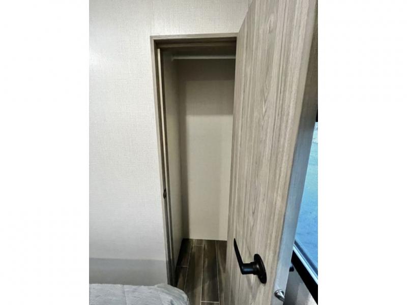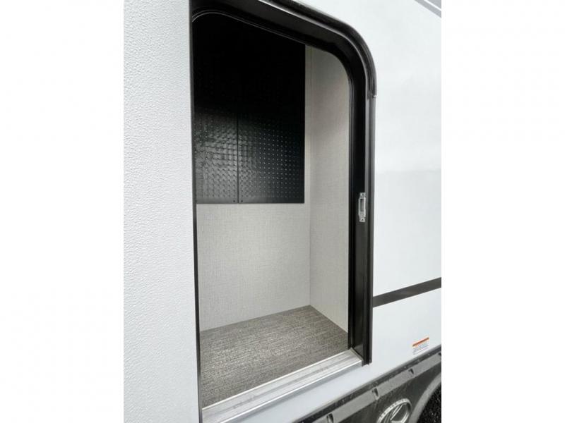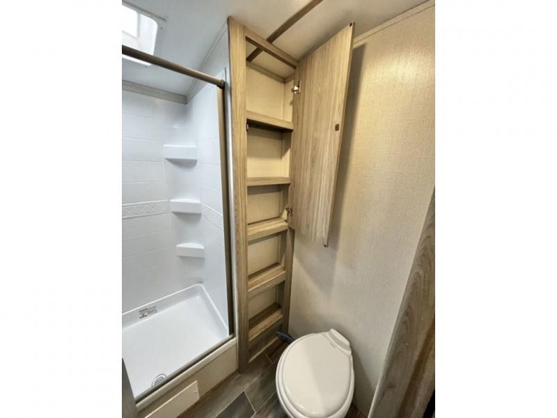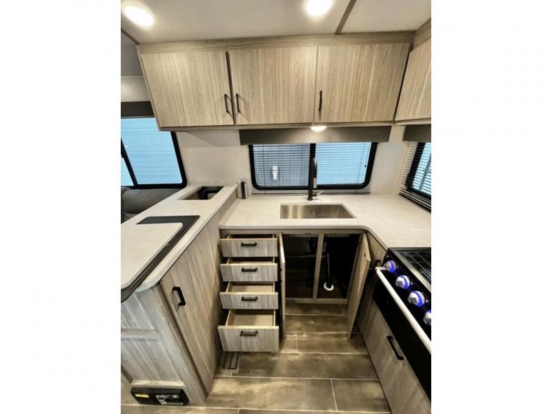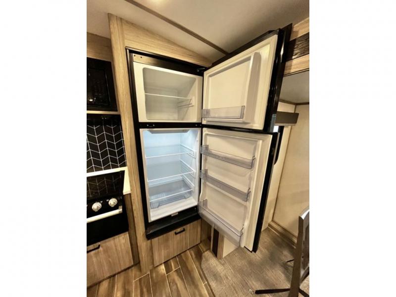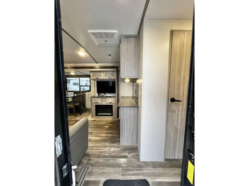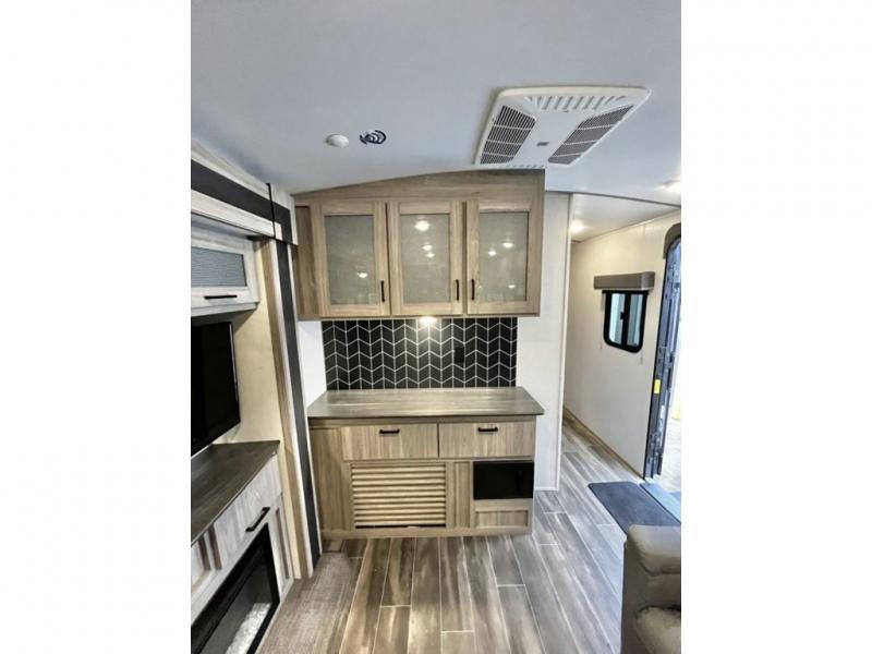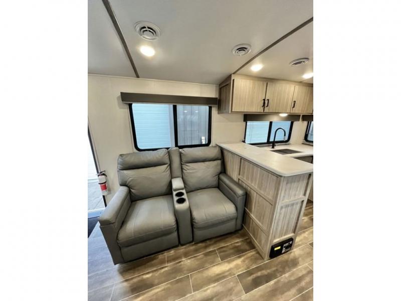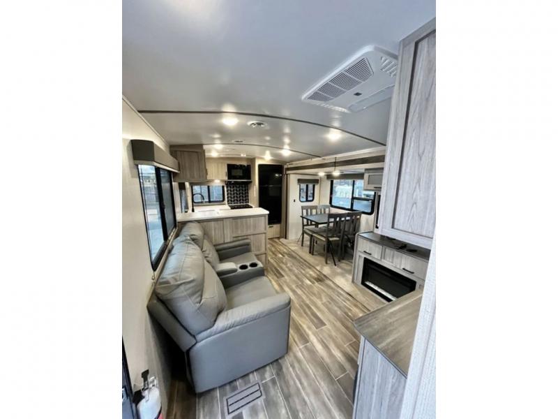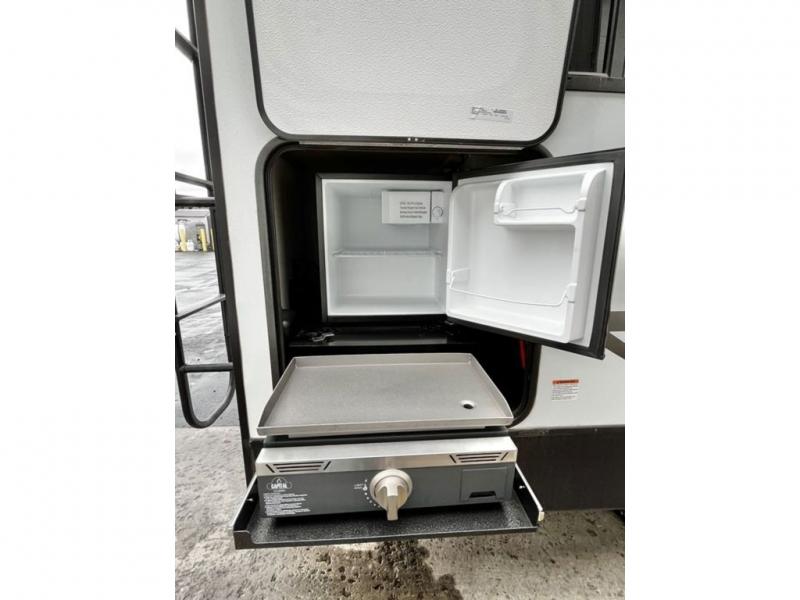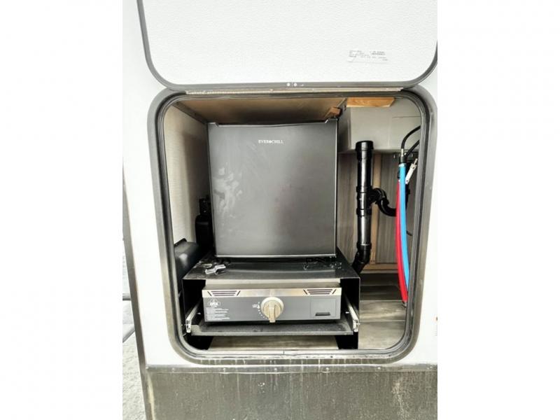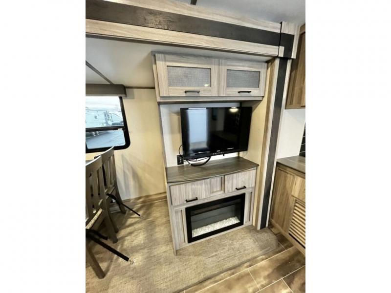 This travel trailer is decked out in comforts! The rear kitchen has everything you need to prepare your best home cooked meals including a raised countertop with trash can storage. Enjoy your meals at the U-shaped dinette or switch it out for the optional free standing dinette. Relax in the theater seats or optional tri-fold sofa sleeper across from the entertainment center with storage, a TV, and a fireplace for a cozy evening indoors. Get a good night's rest on the queen bed in the front private bedroom and keep your clothes looking their best with the closet and wardrobes on either side of the bed. You even have an outside kitchen to grill some juicy burgers on the pull-out cooktop while watching the others play a game of cornhole!