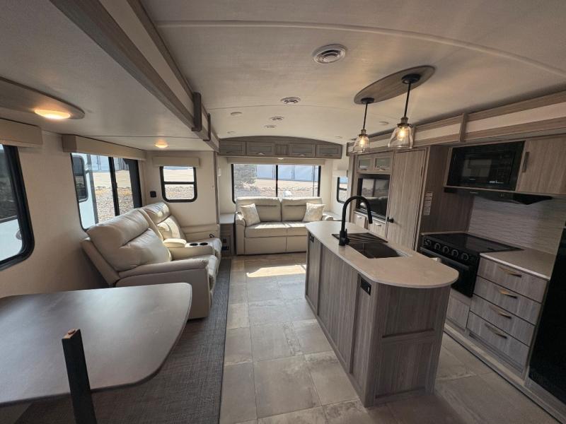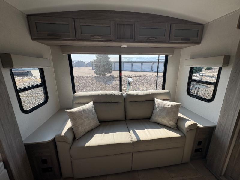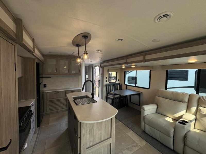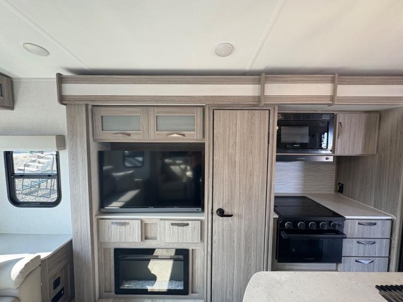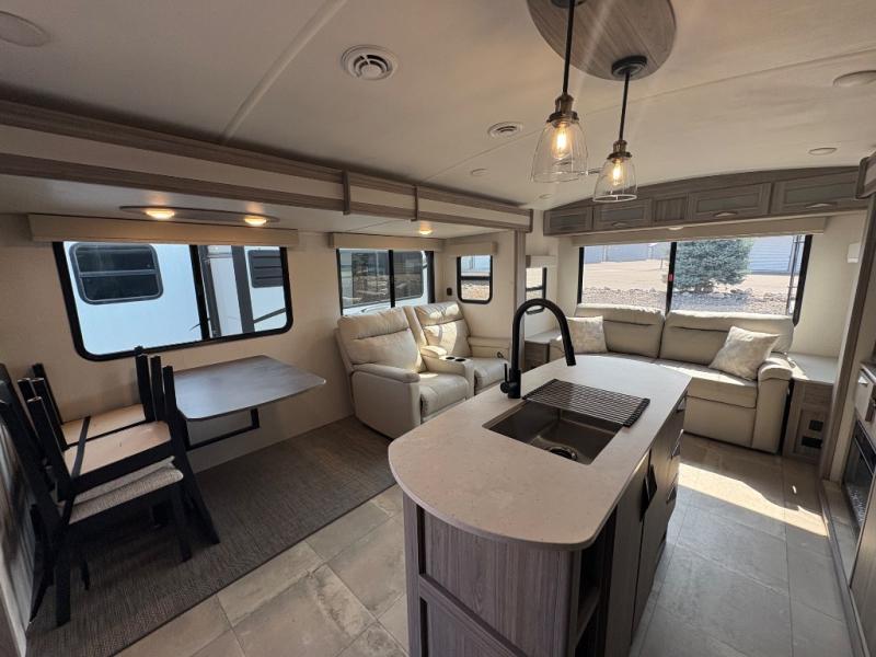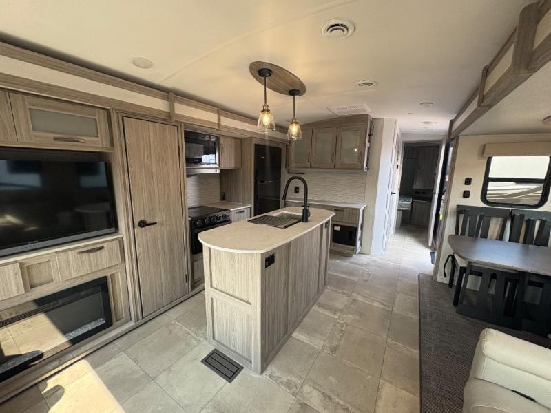 Pack your bags and hitch up this travel trailer for a fun weekend getaway! The rear living area has a tri-fold sofa sleeper with end tables to set your bag of popcorn that was popped in the microwave and theater seating across from the entertainment center with a TV and a fireplace. The kitchen island will make meal prepping easier and you can enjoy your meals at the booth dinette or switch it out for the optional free standing dinette. Freshen up in the full bathroom with the shower that has a skylight above for more natural lighting. Head to the front private bedroom when you're ready to wind down your nights and get a good night's rest on the queen bed with nightstands and wardrobes on either side of it!