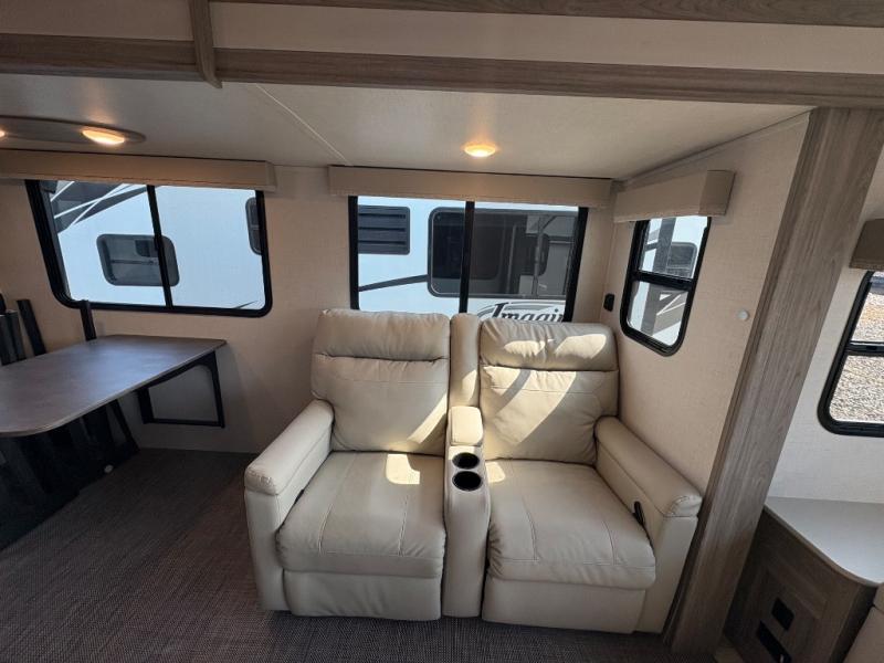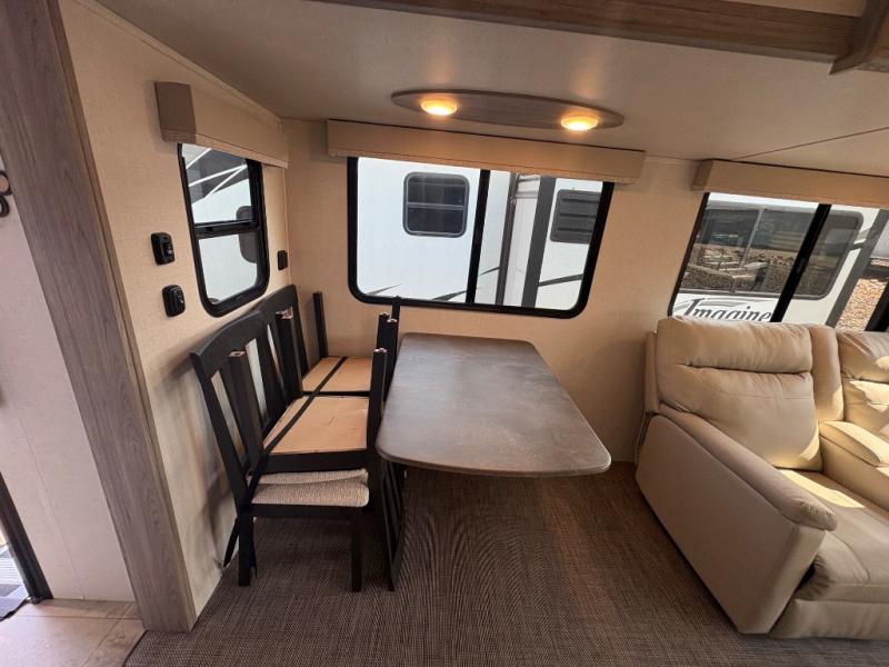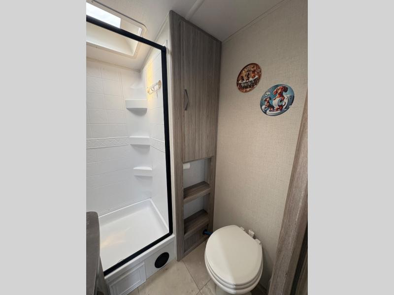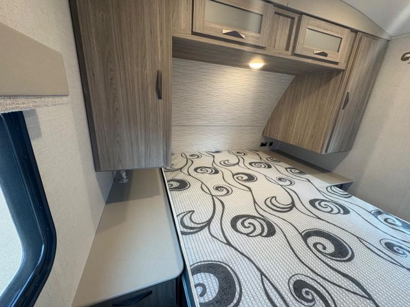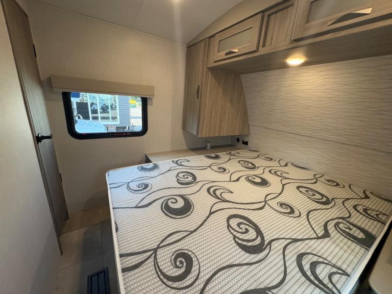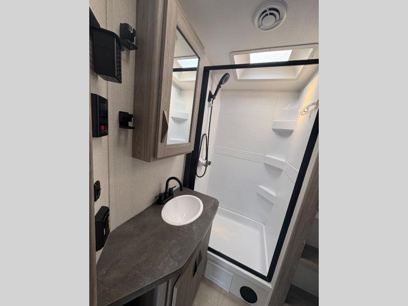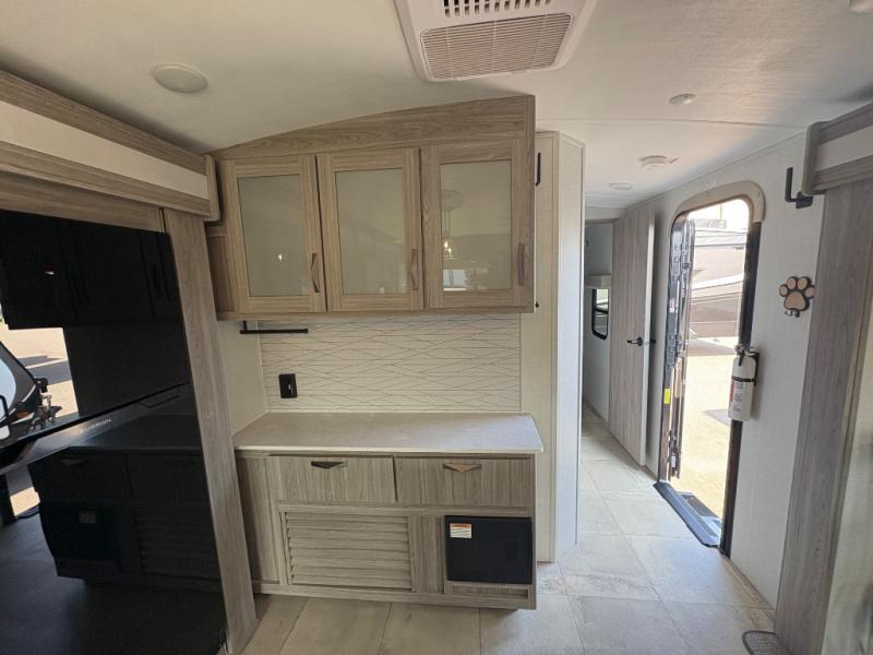 Pack your bags and hitch up this travel trailer for a fun weekend getaway! The rear living area has a tri-fold sofa sleeper with end tables to set your bag of popcorn that was popped in the microwave and theater seating across from the entertainment center with a TV and a fireplace. The kitchen island will make meal prepping easier and you can enjoy your meals at the booth dinette or switch it out for the optional free standing dinette. Freshen up in the full bathroom with the shower that has a skylight above for more natural lighting. Head to the front private bedroom when you're ready to wind down your nights and get a good night's rest on the queen bed with nightstands and wardrobes on either side of it!