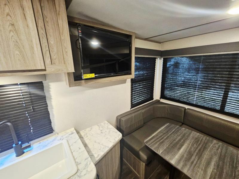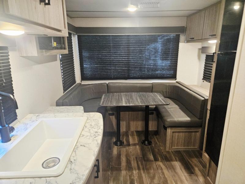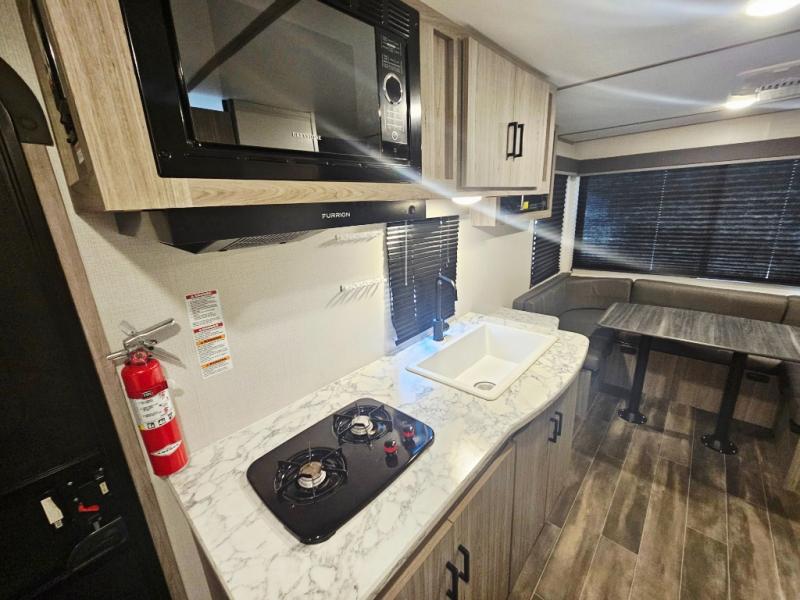 Pack your bags and hitch up this travel trailer for a fun weekend excursion! You can get a good night's sleep on the front queen bed with a wardrobe at the foot of the bed, and overhead cabinets above it for your items. You can also transform the U-shaped dinette with counter next to it into an extra sleeping space when you aren't using it to enjoy a meal prepared with the high output two burner cooktop and 9.8 cu. ft. double door refrigerator. Everyone can freshen up in the full bathroom with the shower tub which has a skylight above for added natural lighting. Relax underneath the 11' awning and store all of your gear in the front exterior pass-through storage area!