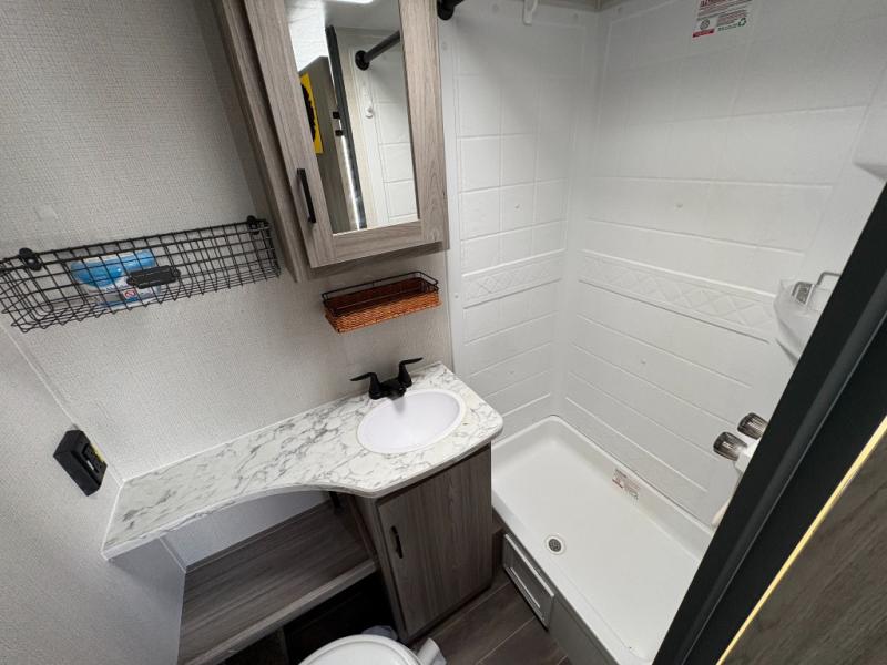 Pack your bags and hitch up this travel trailer for a fun weekend excursion! You can get a good night's sleep on the front queen bed with a wardrobe at the foot of the bed, and overhead cabinets above it for your items. You can also transform the U-shaped dinette with counter next to it into an extra sleeping space when you aren't using it to enjoy a meal prepared with the high output two burner cooktop and 9.8 cu. ft. double door refrigerator. Everyone can freshen up in the full bathroom with the shower tub which has a skylight above for added natural lighting. Relax underneath the 11' awning and store all of your gear in the front exterior pass-through storage area!