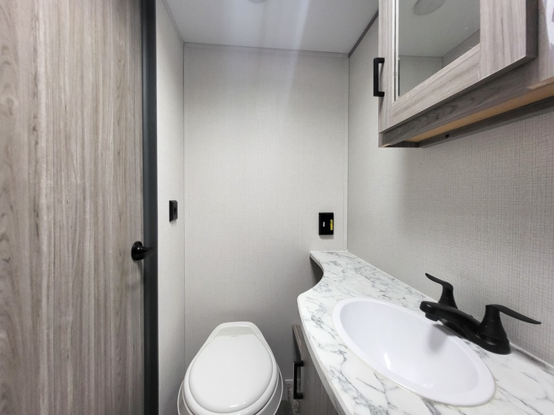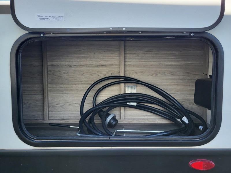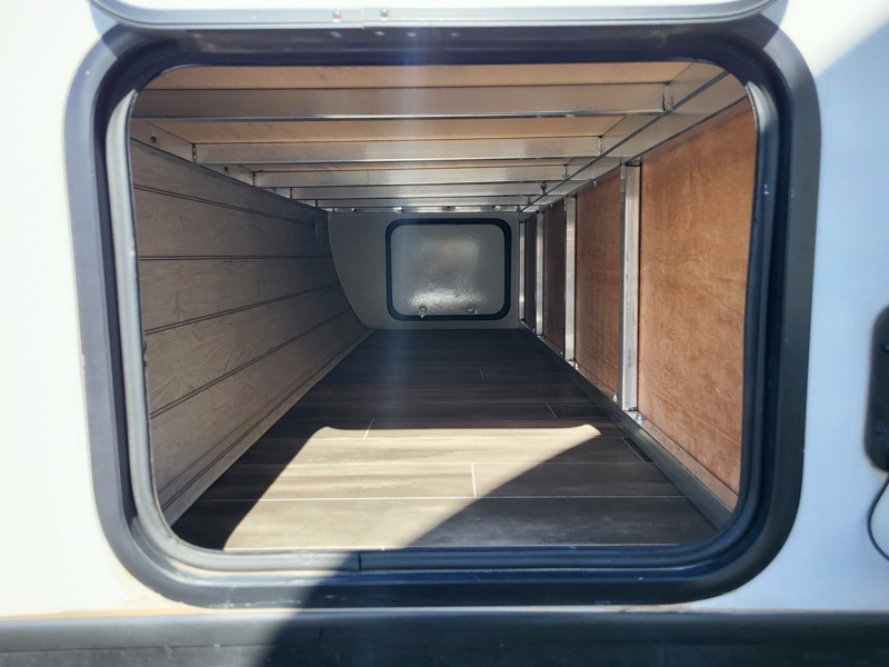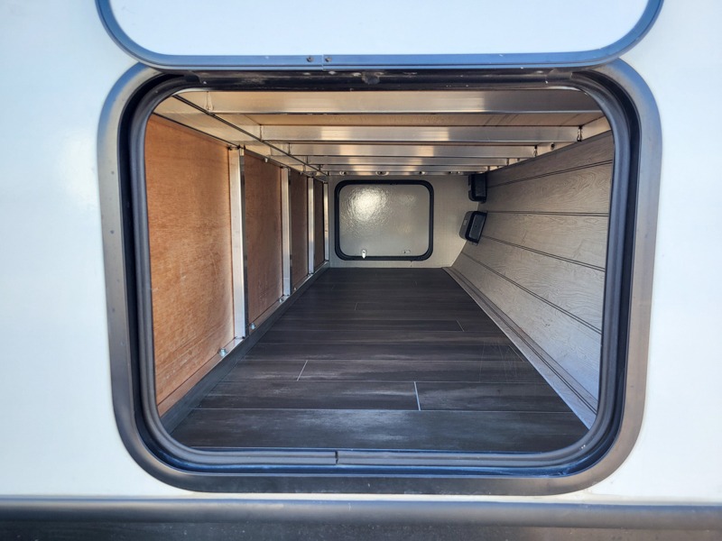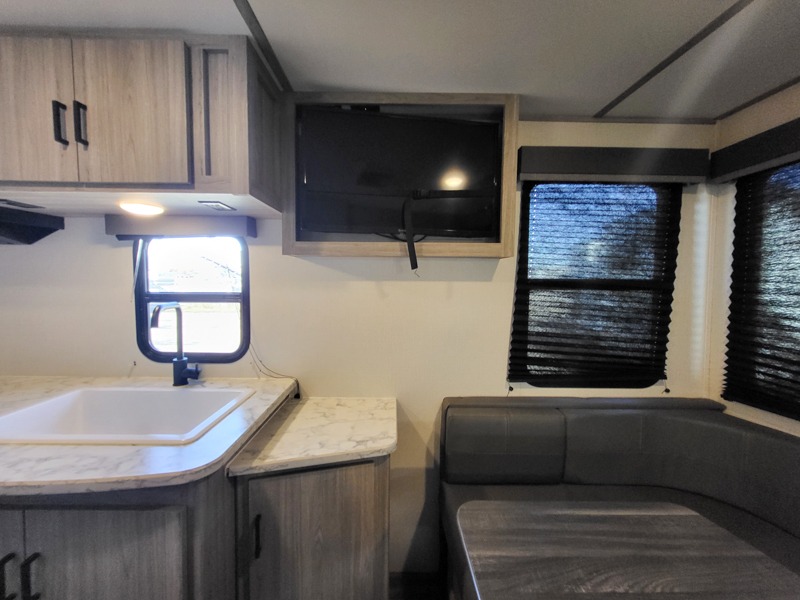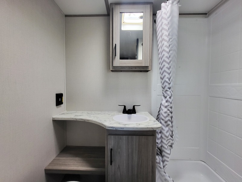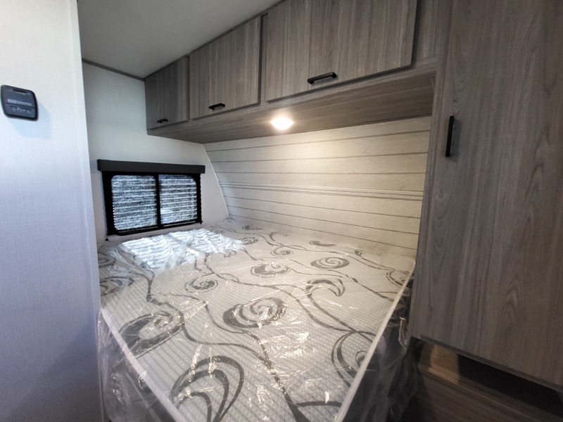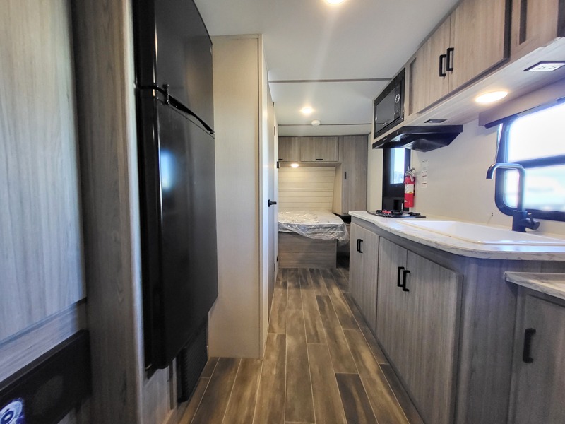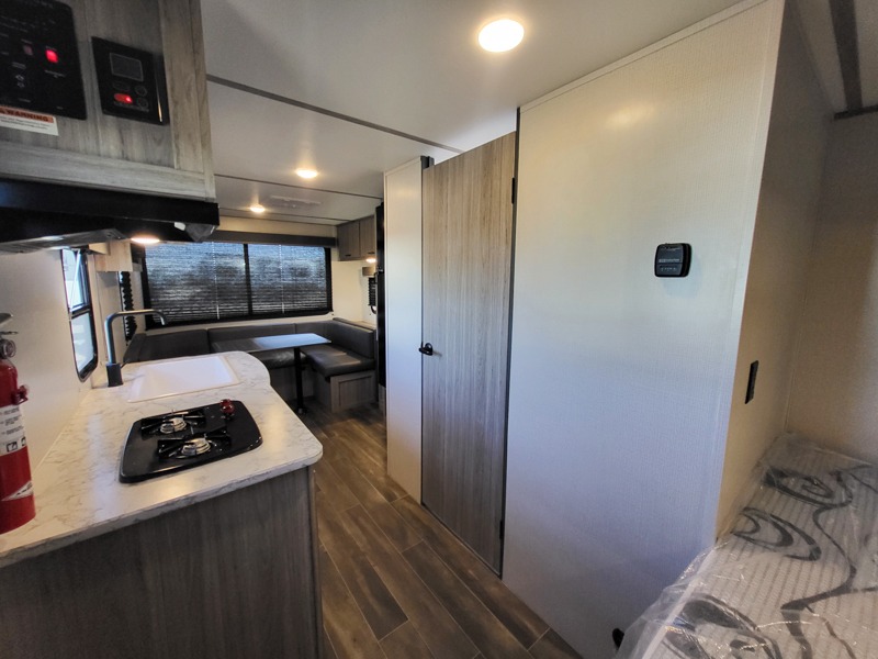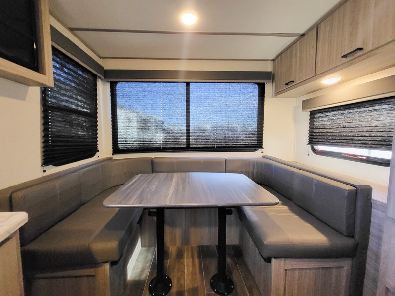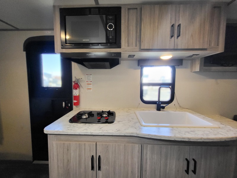 Pack your bags and hitch up this travel trailer for a fun weekend excursion! You can get a good night's sleep on the front queen bed with a wardrobe at the foot of the bed, and overhead cabinets above it for your items. You can also transform the U-shaped dinette with counter next to it into an extra sleeping space when you aren't using it to enjoy a meal prepared with the high output two burner cooktop and 9.8 cu. ft. double door refrigerator. Everyone can freshen up in the full bathroom with the shower tub which has a skylight above for added natural lighting. Relax underneath the 11' awning and store all of your gear in the front exterior pass-through storage area!
