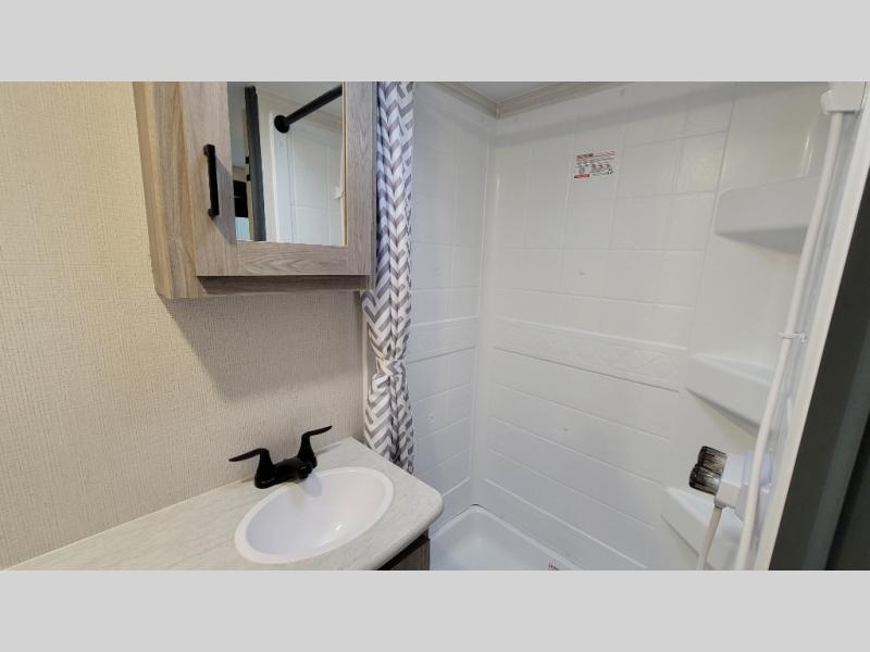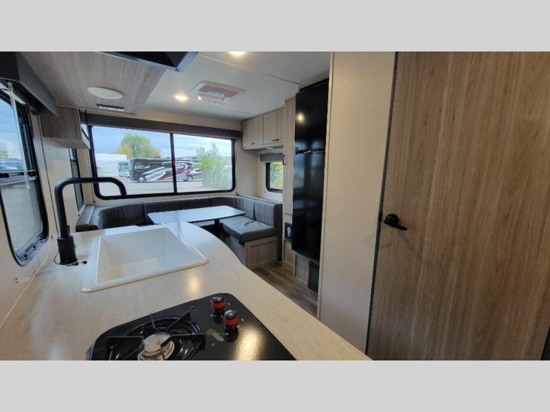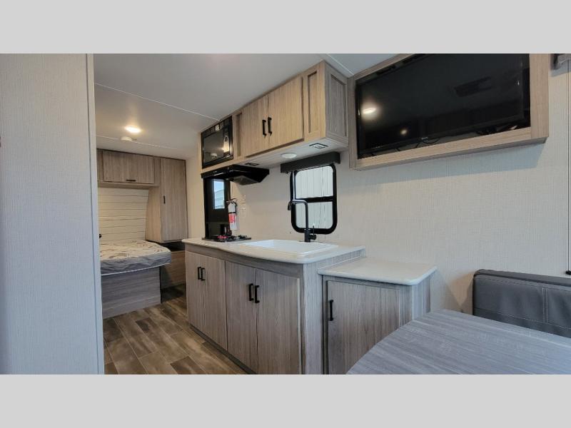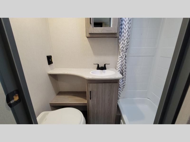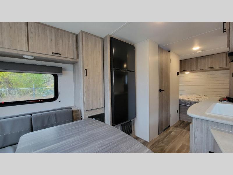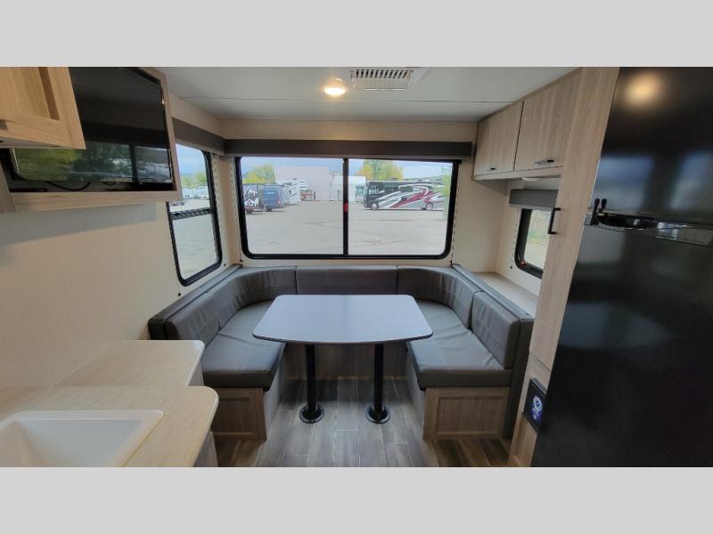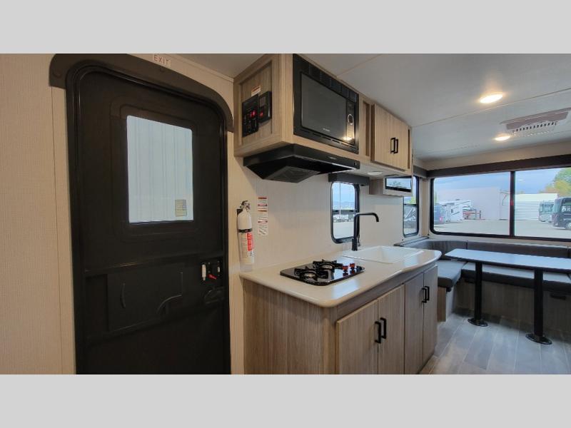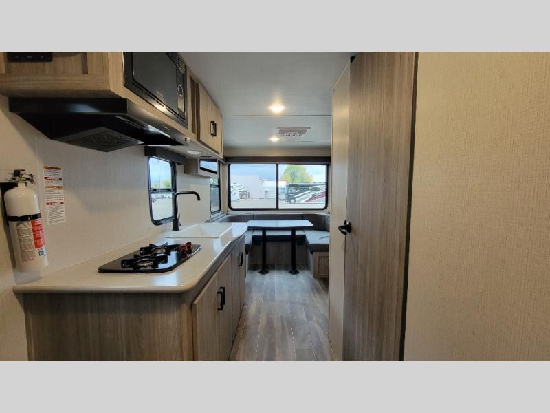 Pack your bags and hitch up this travel trailer for a fun weekend excursion! You can get a good night's sleep on the front queen bed with a wardrobe at the foot of the bed, and overhead cabinets above it for your items. You can also transform the U-shaped dinette with counter next to it into an extra sleeping space when you aren't using it to enjoy a meal prepared with the high output two burner cooktop and 9.8 cu. ft. double door refrigerator. Everyone can freshen up in the full bathroom with the shower tub which has a skylight above for added natural lighting. Relax underneath the 11' awning and store all of your gear in the front exterior pass-through storage area!