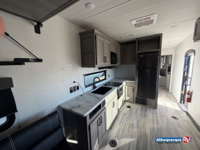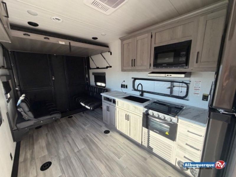 Load up your favorite off-road riding toys and head to your favorite trails, dunes, or competition rally with family and friends. This unit sleeps six with the RV queen bed in front and the dual roll over sofas and bonus bunk in back. The 13' garage with 5K inter-lock system tie downs will get all of your cargo safely to your destination. Once in camp, the rear ramp door will help you easily unload and then set up the sofas with table in between. A full kitchen allows you to refuel your bodies easily by providing a three burner range and 17" black oven, a 10.7 cu. ft. 12V refrigerator for your perishables, and a residential microwave oven to heat up leftovers. The full bath will allow everyone to easily clean up after a full day of fun, and you will enjoy the private front bedroom with an RV queen bed and a full closet for all of your things. On the outside, an 18' power awning provides added living space, or you might like to add the optional patio package for a raised extension of your unit giving you an outdoor space to enjoy.