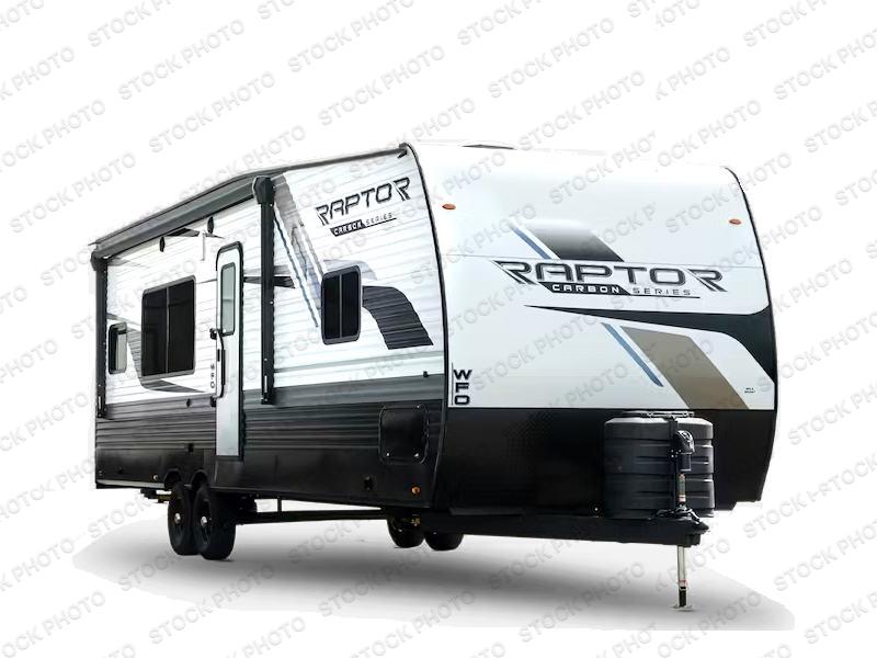 Each Raptor Carbon Series toy hauler travel trailer is built with a 10" I-beam frame, laminated sidewalls with double-welded aluminum construction, plus Dexter E-Z lube 6,000 lb. axles with self-adjusting brakes, electric stabilizer jacks for easy setup, and MORyde step above steps for stability on any type of ground you camp on. On the interior, designer style vinyl flooring throughout, pull-down window shades for privacy at night, and LED lighting throughout. You will appreciate the Girard tankless on-demand water heater for showering both inside and out, and you can also customize your trailer by adding a few options if you wish. The optional patio package will provide you with a raised outdoor living area to enjoy, and the optional SolarFlex protect 220 allows you the ability to decide how you want to camp. Choose your favorite model today!