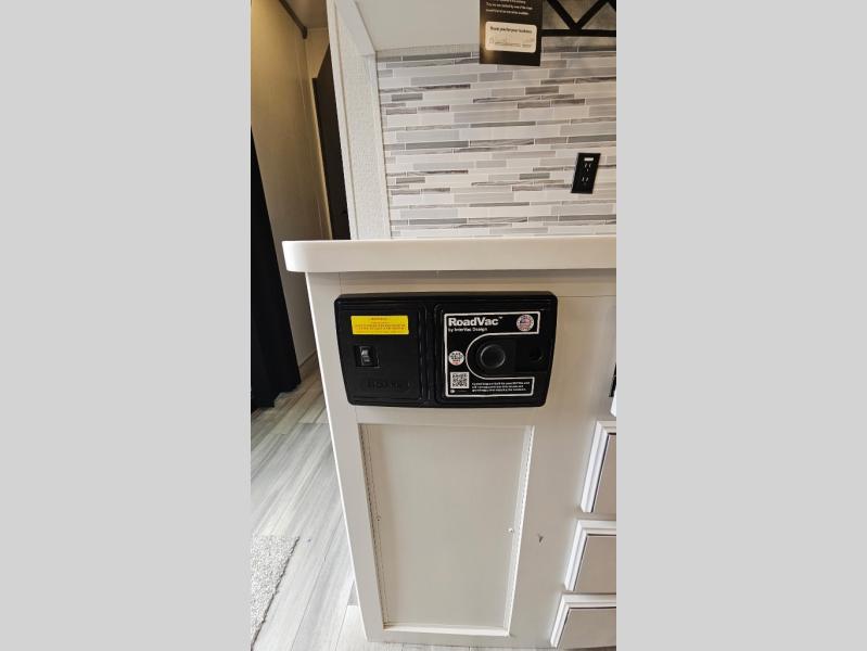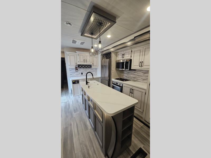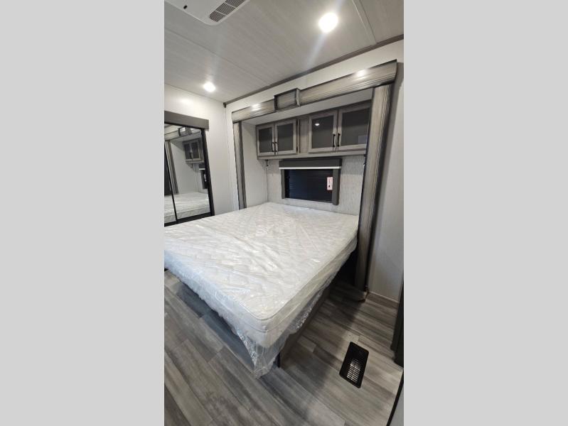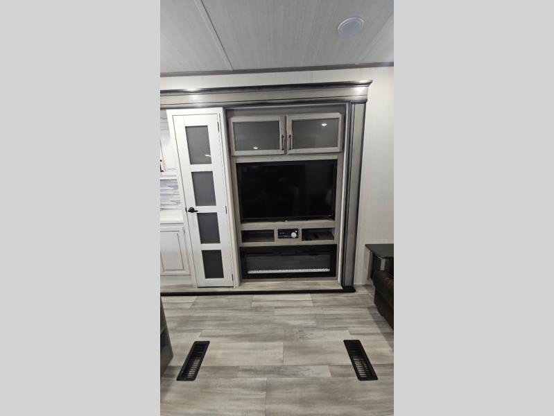 This spacious Keystone Retreat destination trailer has triple slides, two entry doors, and everything you need to have fun while away from home. The living area has plenty of space for entertaining guests. There is a 50" LED TV in the living space for you to just pop in a movie on a cooler night, take a seat in the theatre seating, and enjoy making memories with your family. The cabinetry and storage areas in this unit, like the large wardrobe and bedroom vanity, are perfect for taking along as many items as you would like. You will also find the optional Luxury Package available on this model to be a brilliant addition!