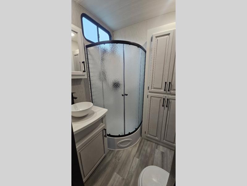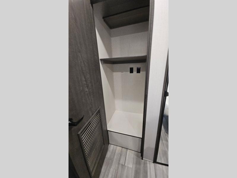 The Keystone Retreat destination trailer is a luxurious retreat in and of itself! You won't need to plan an extensive road trip because the Retreat gives you everything you need in one location. The enclosed underbelly will protect your unit from inclement weather, and the sliding glass doors make the Retreat feel like home. You can add an optional power awning with LED lights to create an outdoor party space, and the 8' interior comes with a ceiling fan that you can use to cool down your living area. There are also hardwood cabinet doors, framing, and slide fascia plus solid surface countertops and a stainless steel sink in the kitchen.