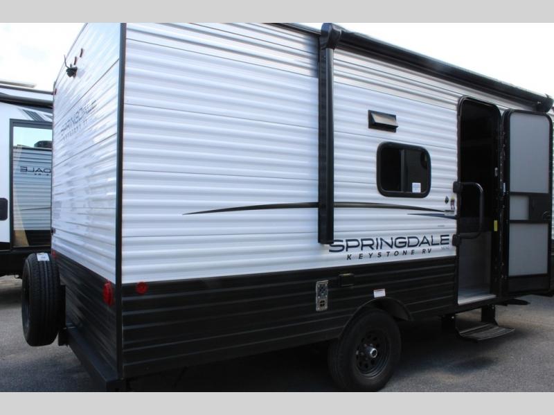 With any Springdale Classic Mini travel trailer by Keystone, you will enjoy lightweight towing thanks to their single-axle! You'll find the XL entry assist handle will make entering and exiting your unit easier than ever, and the power awning will provide protection from the sun as you relax in your camp chairs outside. The interior is made bright and open thanks to the LED lighting and each model includes cozy sleeping space, ample storage, and seating spaces for your crew. There are also additional features found on select models, so come take a look!