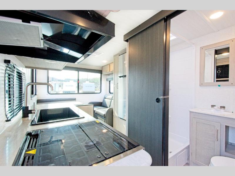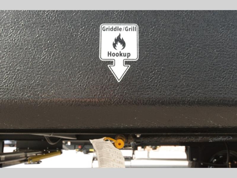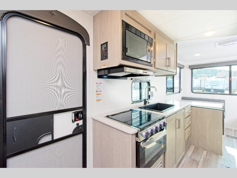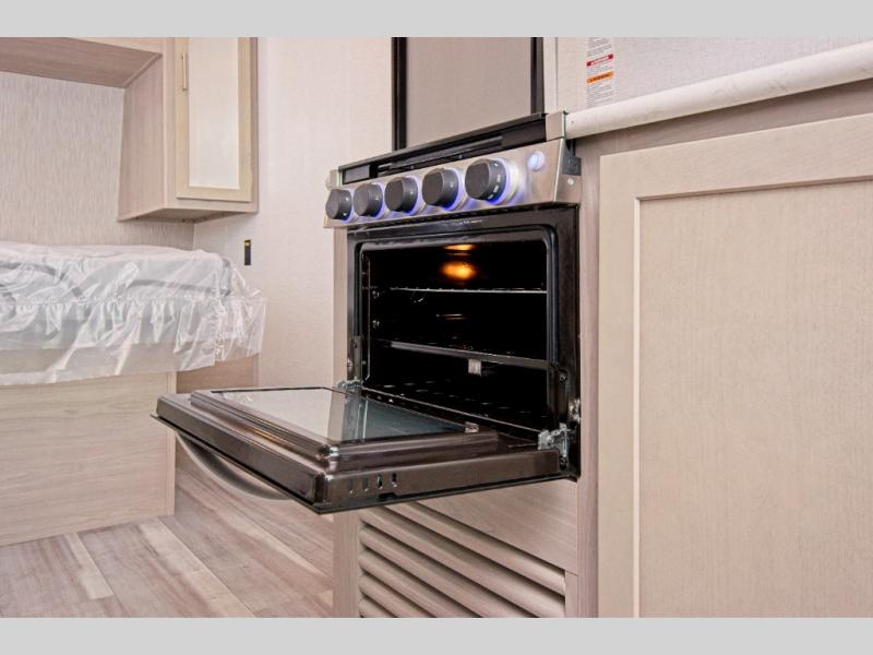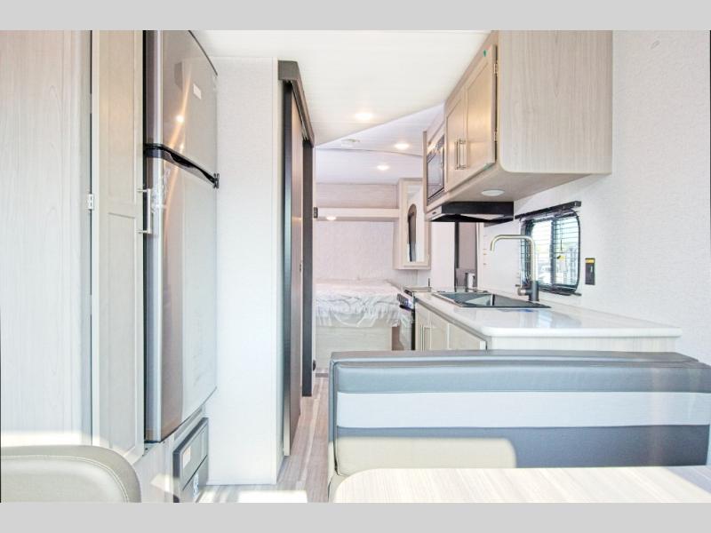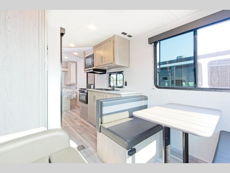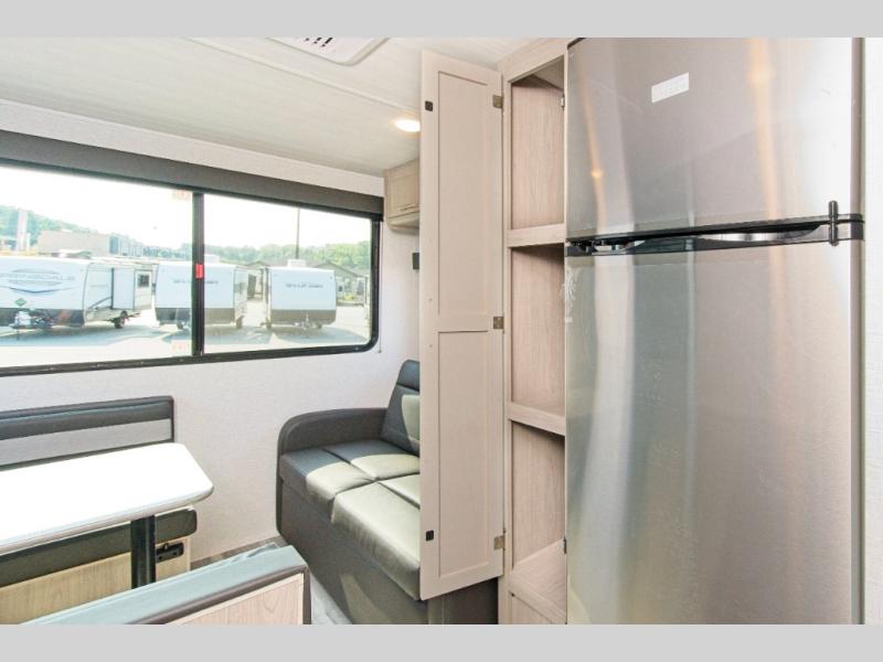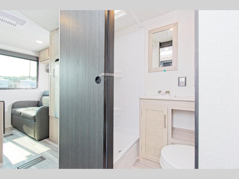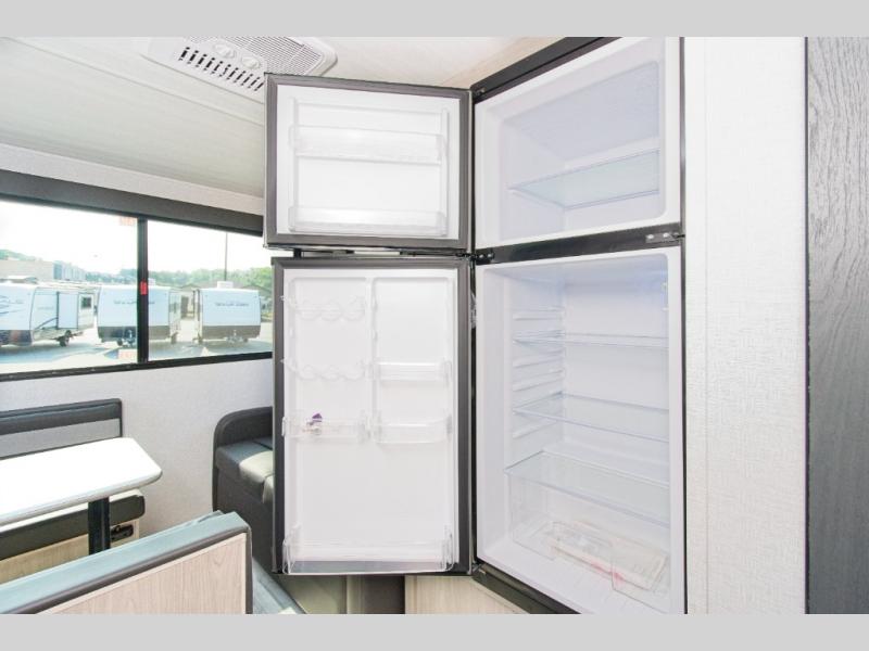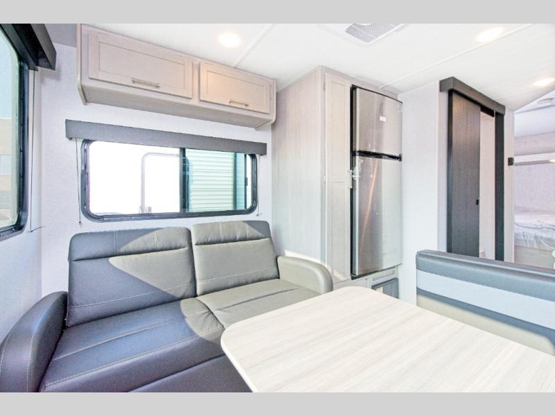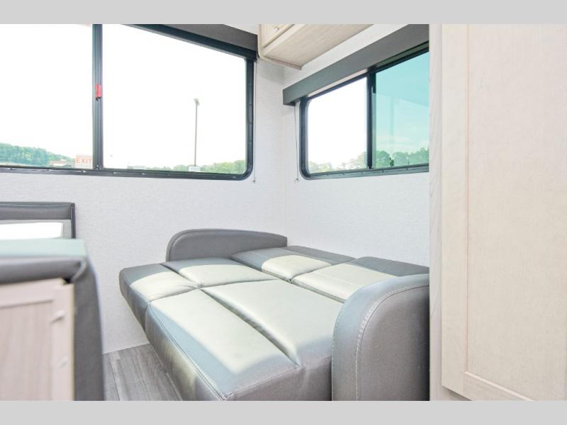 The booth dinette and sofa offer flexible seating and sleeping options, while the fully equipped kitchen includes a two-burner gas range, .9 cu. ft. microwave, and a 10 cu. ft. 12V refrigerator to keep your meals fresh and easy to prepare. The full bath ensures you stay clean and refreshed throughout your trip.