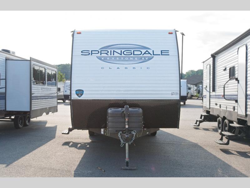 Keystone’s Springdale Classic series is built with durable materials like an aluminum exterior, walkable roof, and I-beam frame with stamped steel cross-members for added strength. Enjoy easy setup with electric stabilizer jacks, a power tongue jack, and a friction hinge entry door with an XL assist handle.