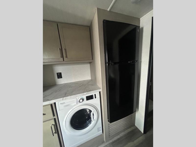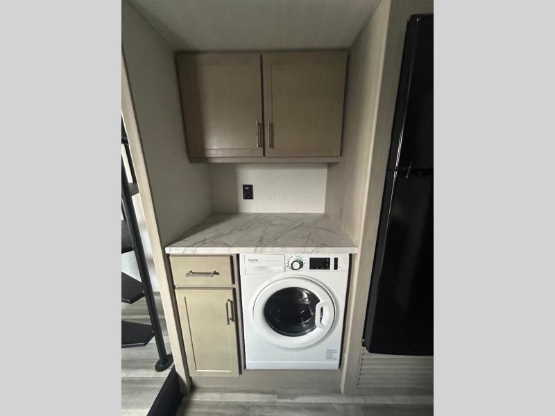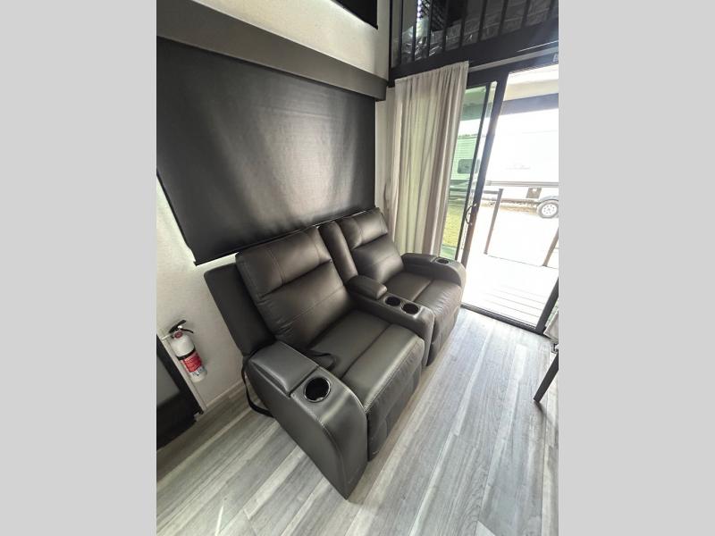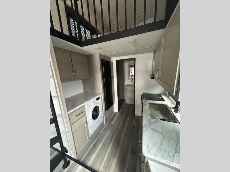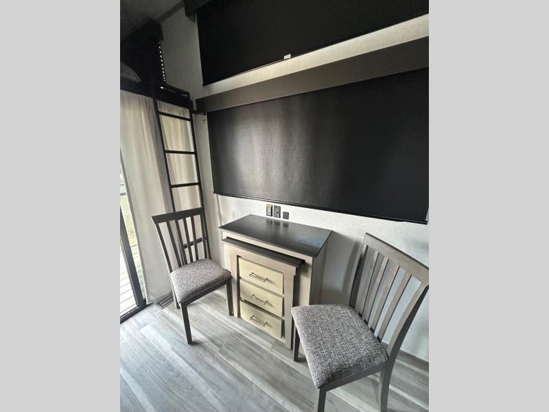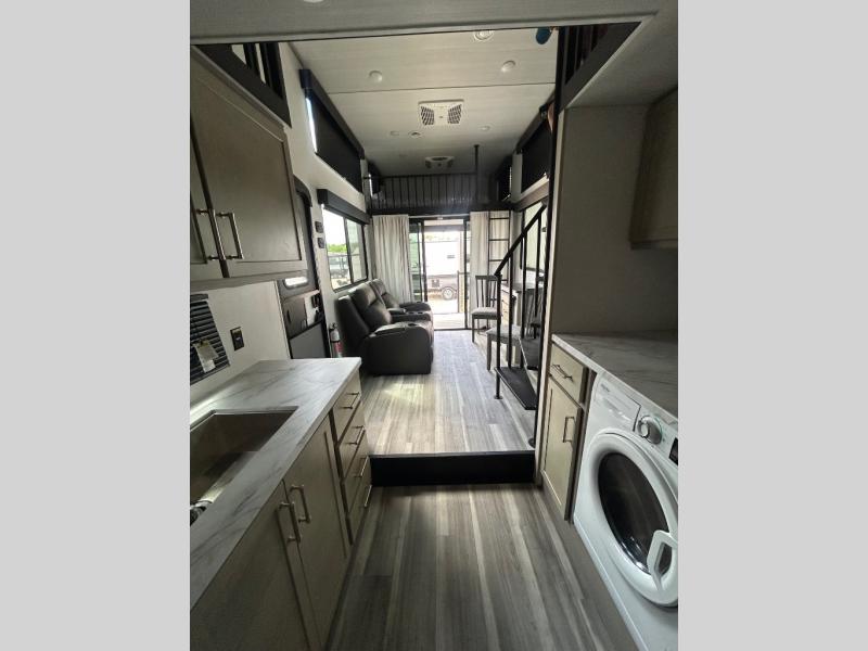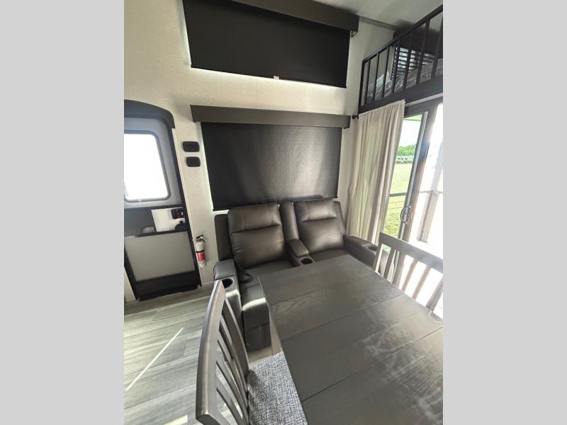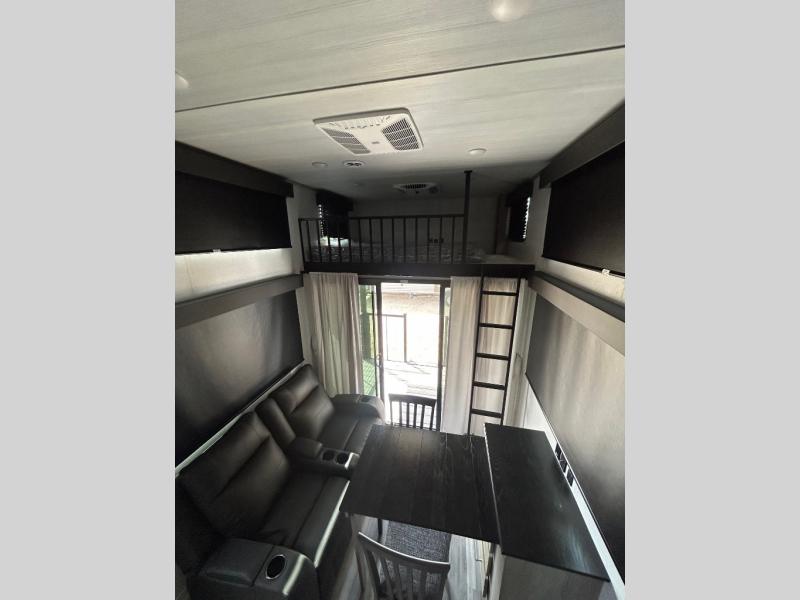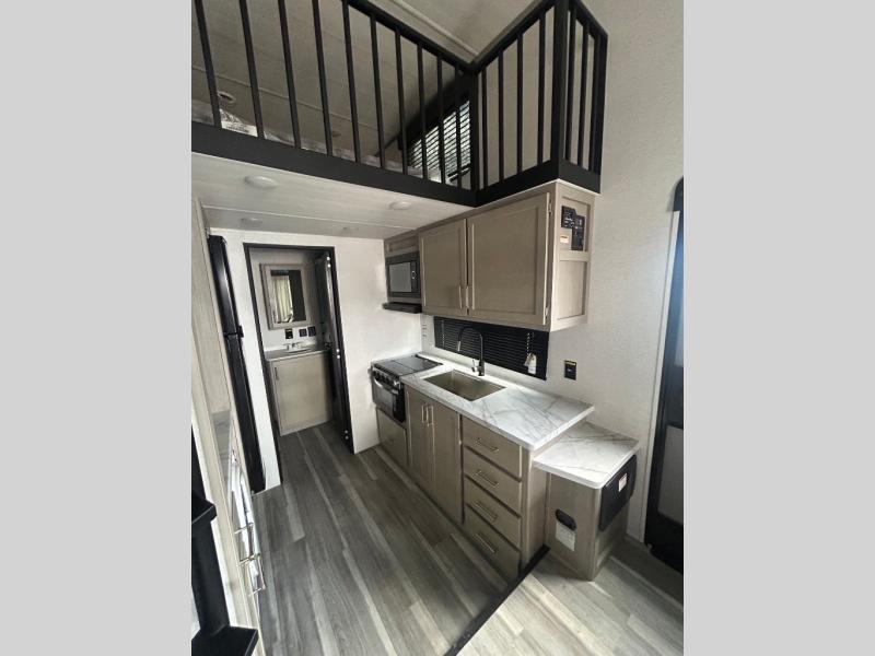 Any amount of time in this travel trailer will be time well spent! The rear entry door leads to the covered porch with a loft area above and queen-size bed. The patio door leads into the main living area where you can enjoy the sofa or dual lounge chairs with a pull-out table. Once you head to the front of this unit, you'll find the full kitchen with a three burner gas cooktop and 17" oven to cook meals on each day. There is also a pantry and 10 cu. ft. 12V refrigerator for food storage. The front full bath includes a shower with a seat, a toilet, sink, and a linen closet to keep clean towels close by. There is even a second loft above the kitchen and bath where you'll find a second queen-size bed and storage space for your things; how convenient!