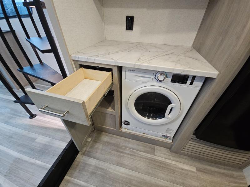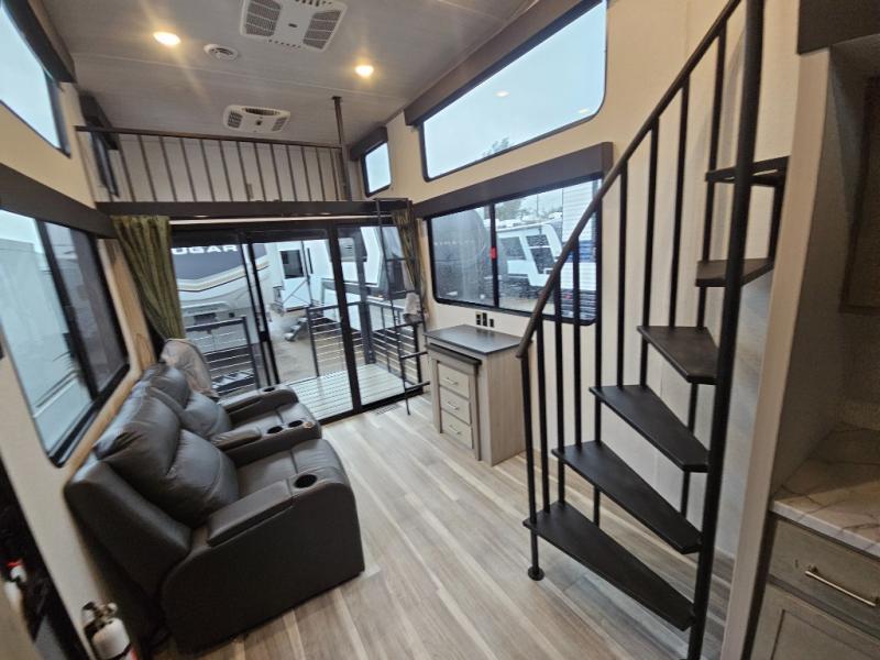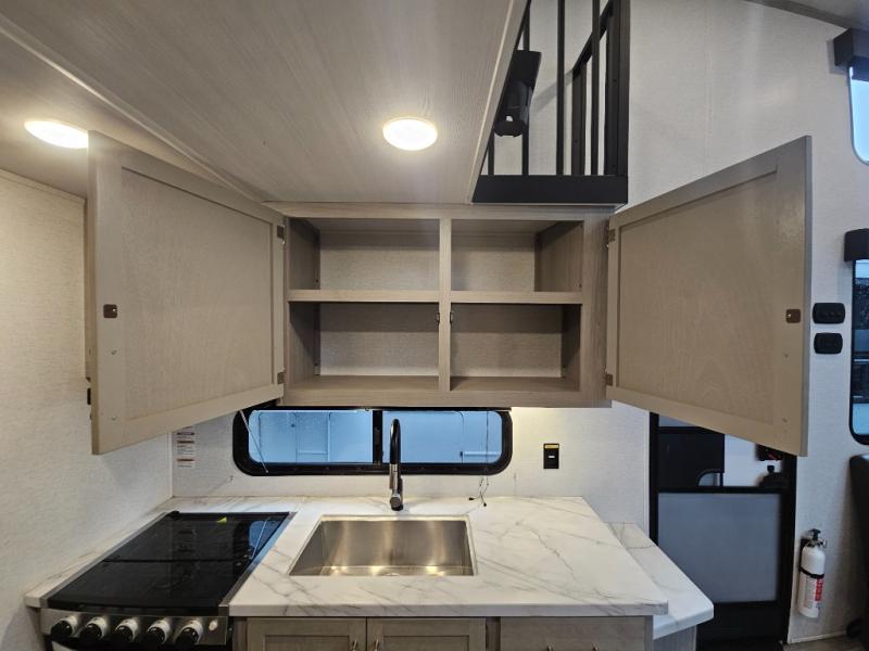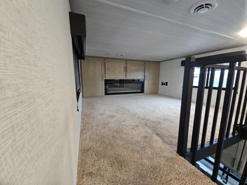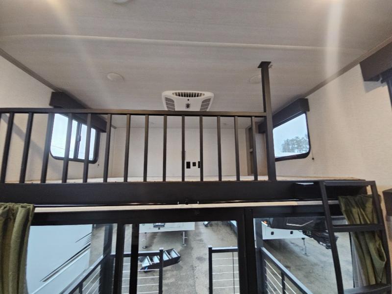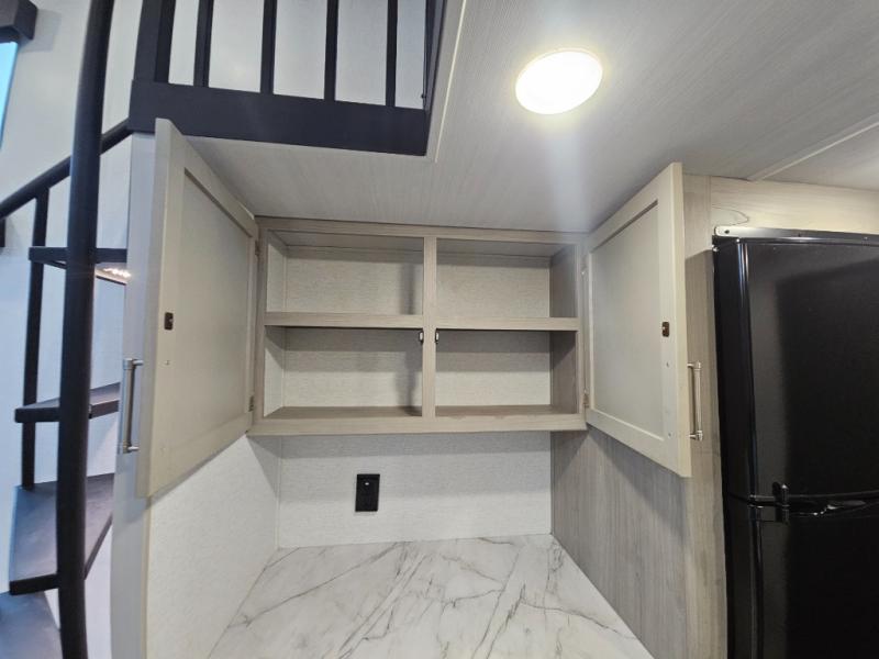 Any amount of time in this travel trailer will be time well spent! The rear entry door leads to the covered porch with a loft area above and queen-size bed. The patio door leads into the main living area where you can enjoy the sofa or dual lounge chairs with a pull-out table. Once you head to the front of this unit, you'll find the full kitchen with a three burner gas cooktop and 17" oven to cook meals on each day. There is also a pantry and 10 cu. ft. 12V refrigerator for food storage. The front full bath includes a shower with a seat, a toilet, sink, and a linen closet to keep clean towels close by. There is even a second loft above the kitchen and bath where you'll find a second queen-size bed and storage space for your things; how convenient!