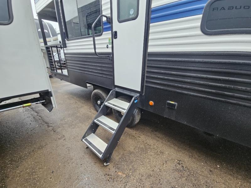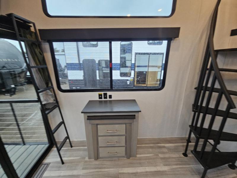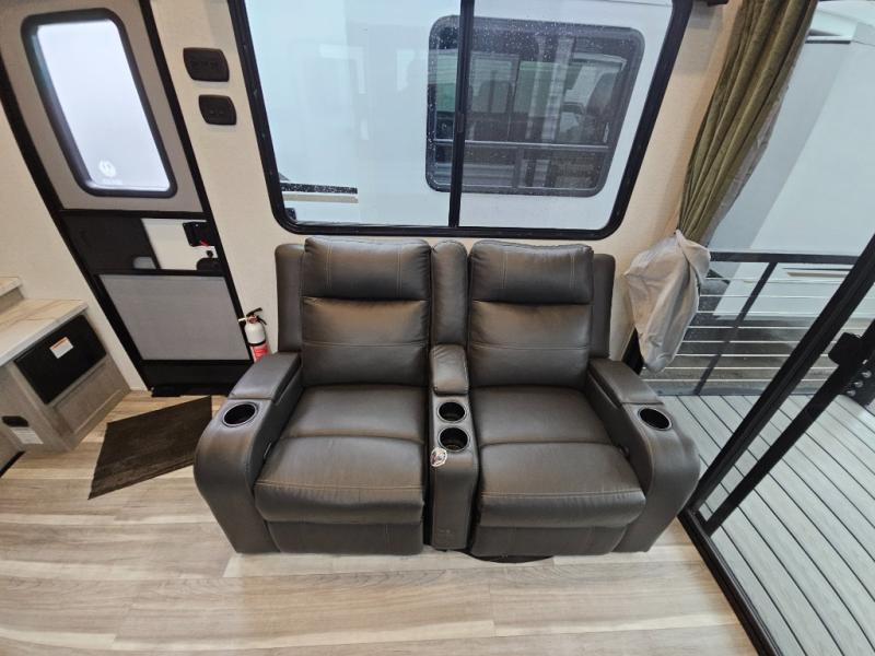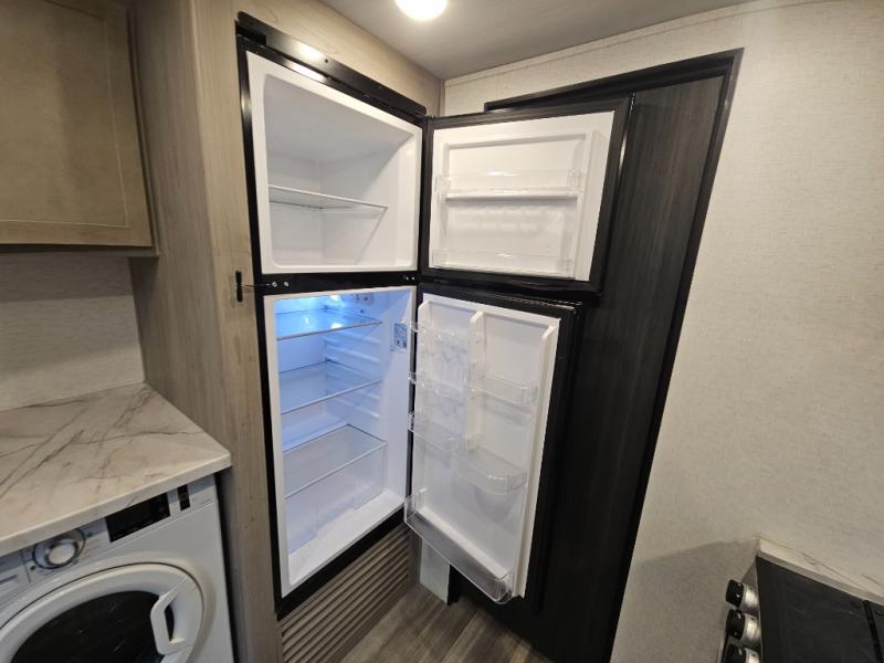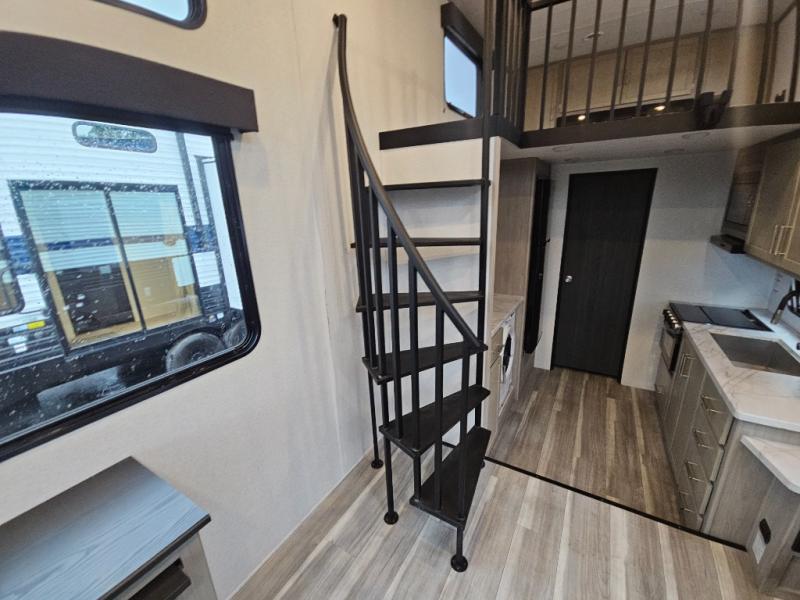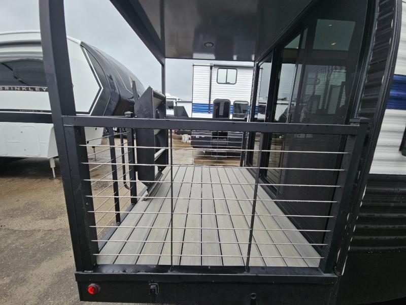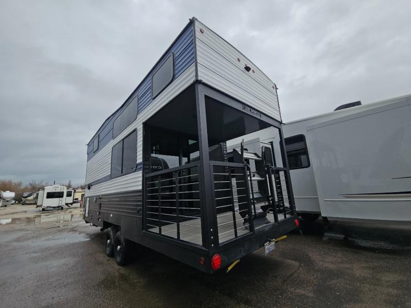 Any amount of time in this travel trailer will be time well spent! The rear entry door leads to the covered porch with a loft area above and queen-size bed. The patio door leads into the main living area where you can enjoy the sofa or dual lounge chairs with a pull-out table. Once you head to the front of this unit, you'll find the full kitchen with a three burner gas cooktop and 17" oven to cook meals on each day. There is also a pantry and 10 cu. ft. 12V refrigerator for food storage. The front full bath includes a shower with a seat, a toilet, sink, and a linen closet to keep clean towels close by. There is even a second loft above the kitchen and bath where you'll find a second queen-size bed and storage space for your things; how convenient!