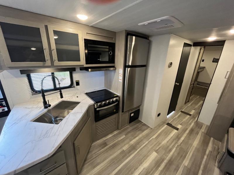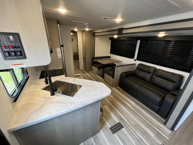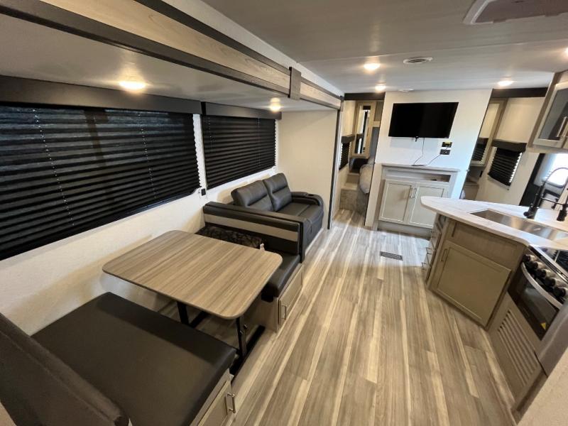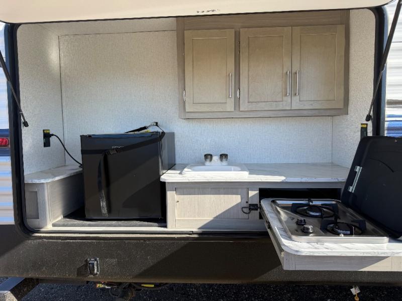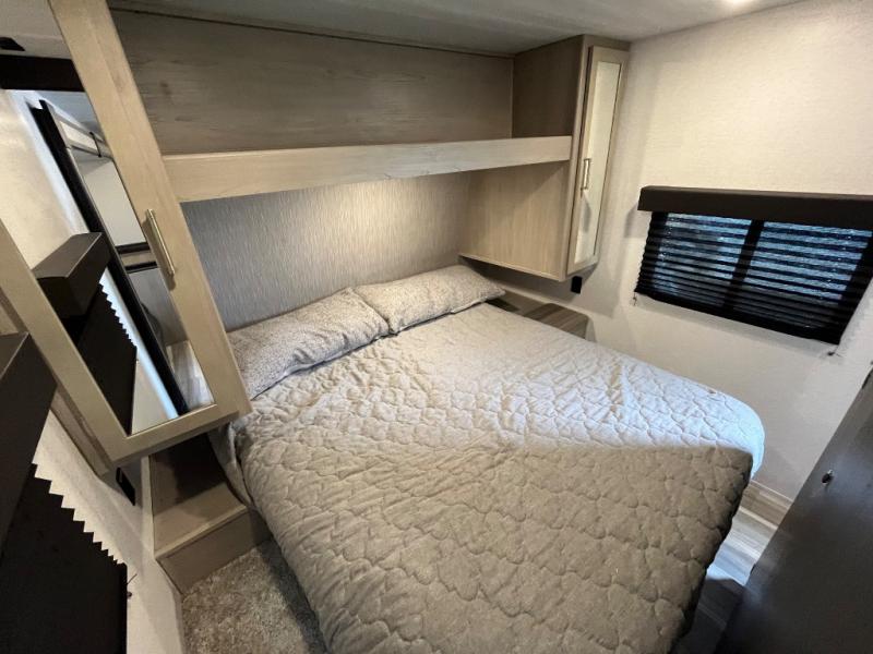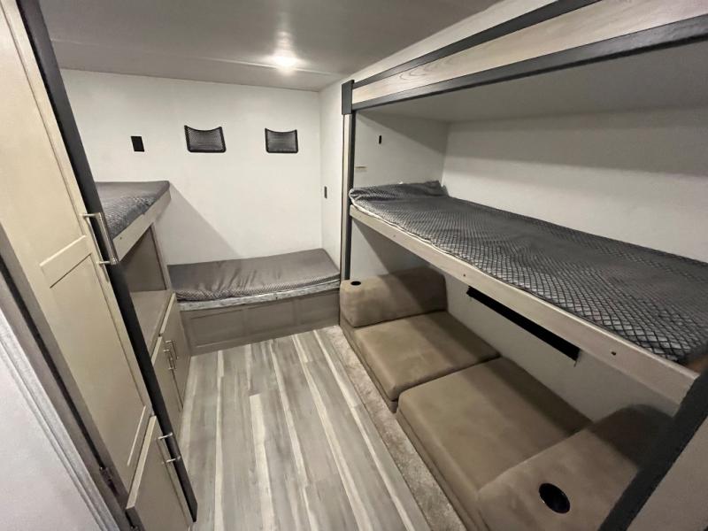 If you enjoy camping with larger groups, this travel trailer is for you! Once you arrive at the campsite, grab your gear from the pass-through storage, put out the 18' awning, then grab a cold drink from the outdoor refrigerator. There is also an outdoor sink to wash up! The main living area includes a large slide out where you can relax on the sofa or booth dinette, and there is an entertainment center with TV prep if you want the option to watch movies at night. Your guests will love the rear private bunkhouse with a flip-up bed, two bunks, and a toy chest if this room is for littles ones. You will find the front private bedroom to be accommodating with its queen bed, dual nightstands and closets, plus a convenient laundry chute. There is even a full bath with its own exterior entry door!