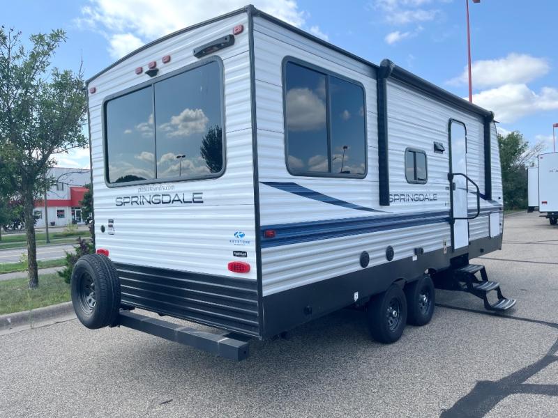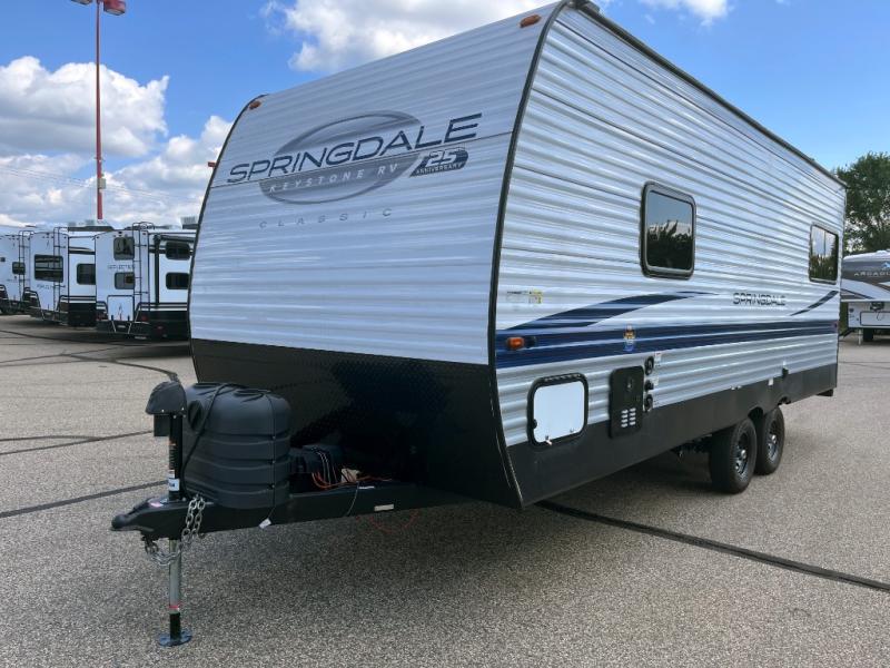 The Springdale Classic travel trailers by Keystone will provide you and your family many great outdoor experiences and it will also be kind to your pocketbook. Each one is constructed with an aluminum exterior, a walkable roof, and an I-beam frame with stamped steel cross-members and outriggers for added strength. There are also electric stabilizer jacks and power tongue jacks outside, along with a friction hinge entry door and an XL entry assist handle for added convenience. Each travel trailer includes a two burner flush mount gas range with a glass cover, LED lighting, bedside outlets, and blackout night shades inside that will provide you with more privacy at night. Some of the Keystone Exclusives you'll appreciate are the color-coded unified wiring and in-floor heating ducts, and the optional SolarFlex 200 will let you add off-grid capabilities if you choose!