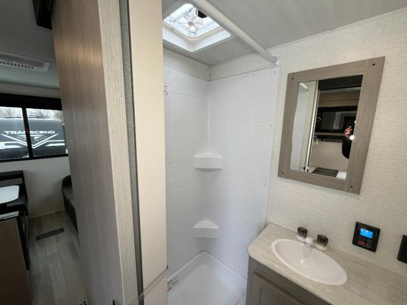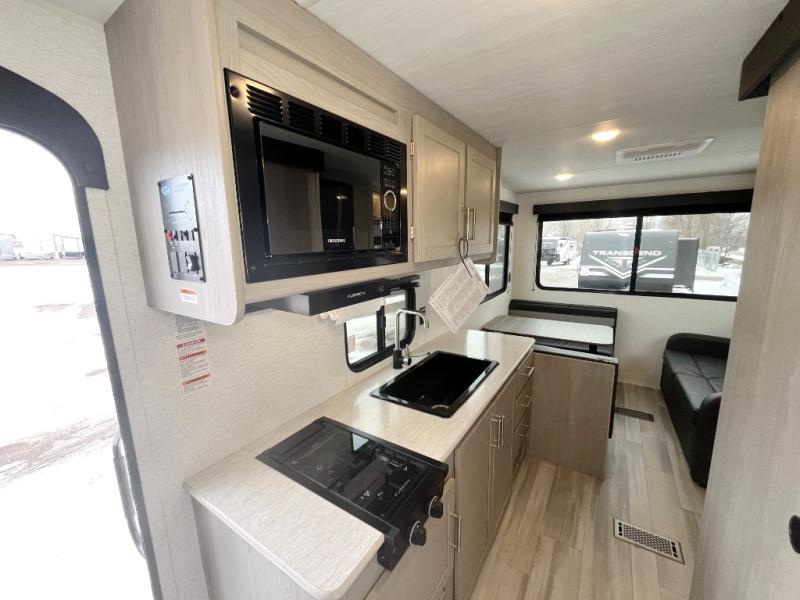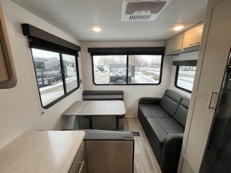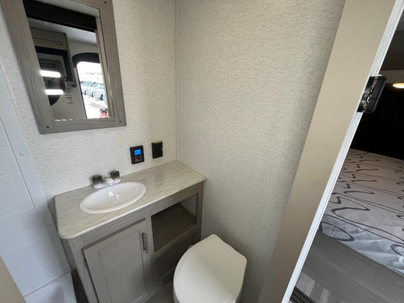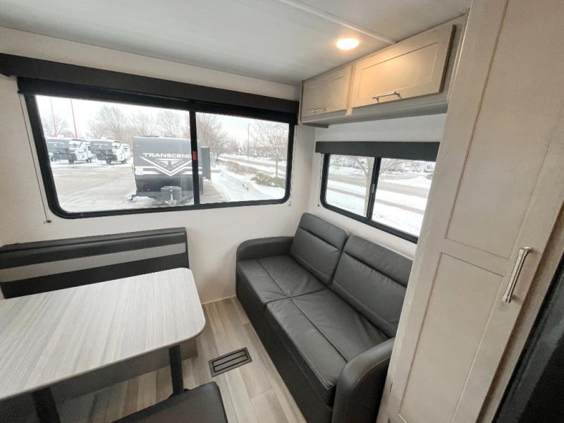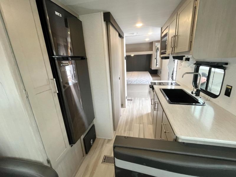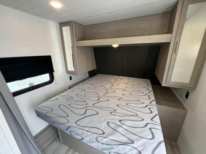 This trailer is perfect for your crew of four to six. There is a queen bed in the semi-private bedroom, along with dual closets and nightstands to keep your things tidy. You can dine each day on the booth dinette, relax on the sofa, and house additional guests here at night. The kitchen includes everything you need to prepare meals each day, including a two burner gas range, a .9 cu. ft. microwave, and a 10 cu. ft. 12V refrigerator for cold items. And the full bath on board lets you stay clean throughout each camping trip!