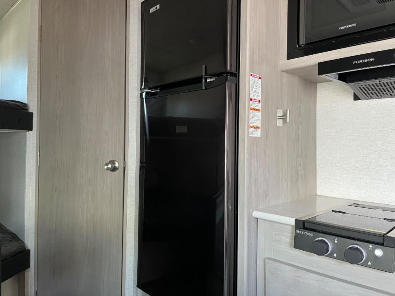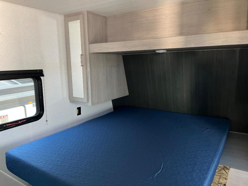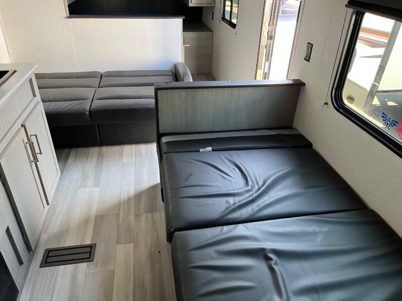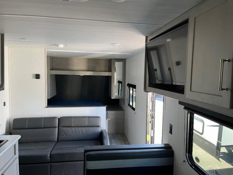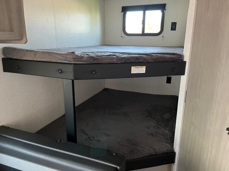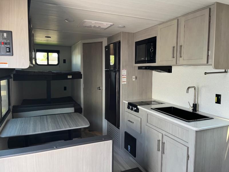 Bring the whole gang and explore with this bunkhouse travel trailer in tow! There is sleeping for up to 10 with double-size bunk beds, a queen bed up front, as well as a sofa and booth dinette that can accommodate more when reconfigured at night. You will easily be able to create meals to enjoy while camping inside with the two-burner range a 10 cu. ft. 12V refrigerator. Overhead storage is available above the stove and sink and along the opposite side. There is also a front pass-through for housing all of your outdoor gear, as well as additional outside storage beneath the bunk beds. The 12' power awning will also provide more living space and outdoor protection from the sun and/or rain.