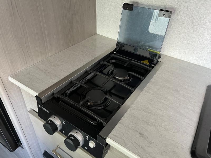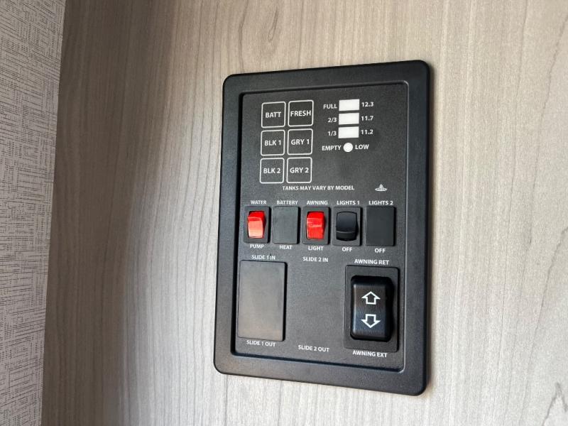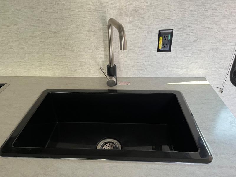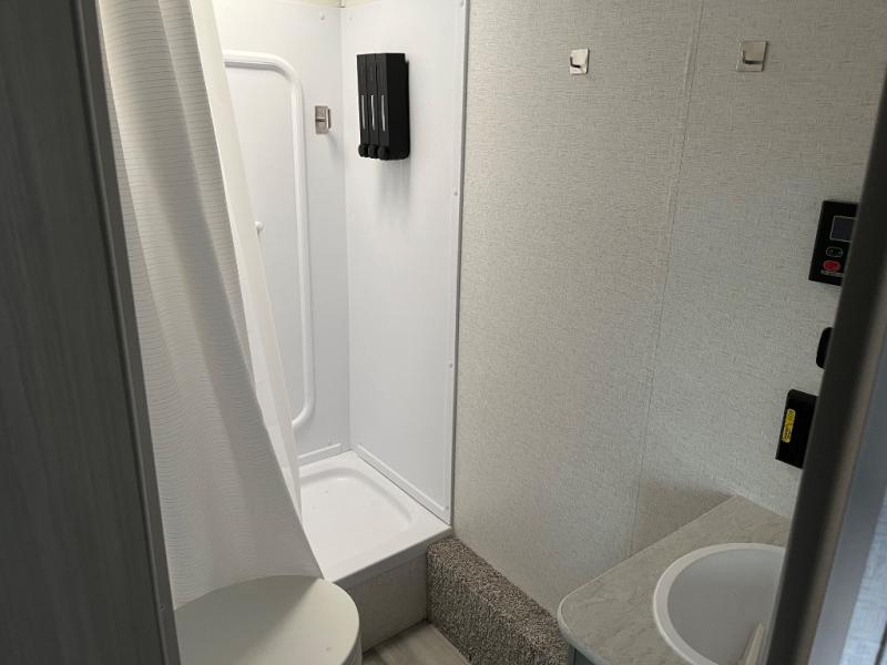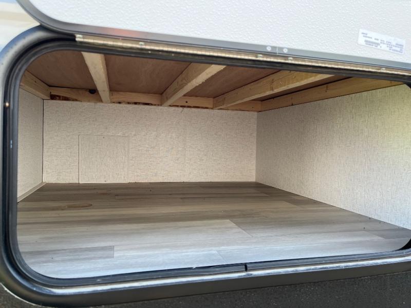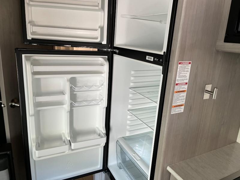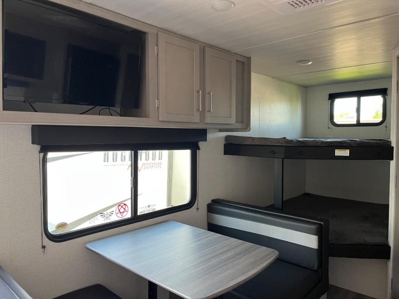 Bring the whole gang and explore with this bunkhouse travel trailer in tow! There is sleeping for up to 10 with double-size bunk beds, a queen bed up front, as well as a sofa and booth dinette that can accommodate more when reconfigured at night. You will easily be able to create meals to enjoy while camping inside with the two-burner range a 10 cu. ft. 12V refrigerator. Overhead storage is available above the stove and sink and along the opposite side. There is also a front pass-through for housing all of your outdoor gear, as well as additional outside storage beneath the bunk beds. The 12' power awning will also provide more living space and outdoor protection from the sun and/or rain.