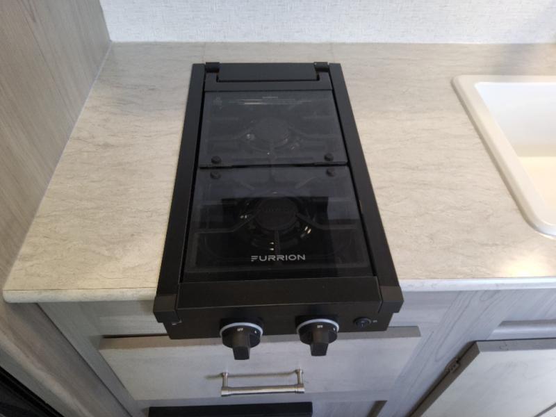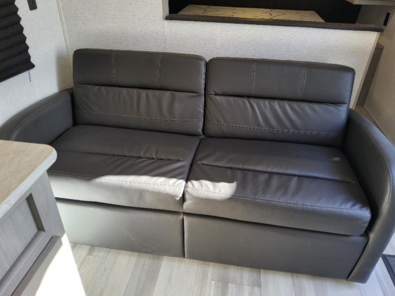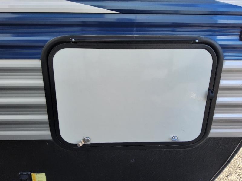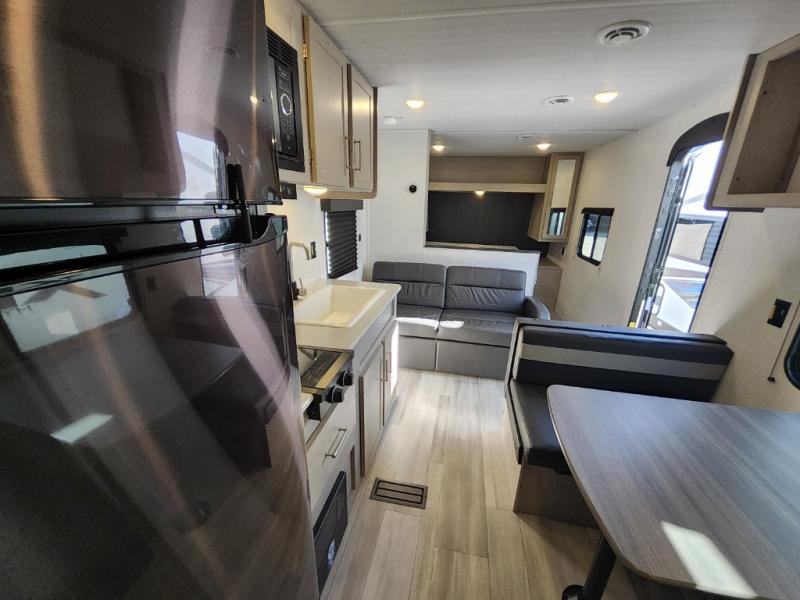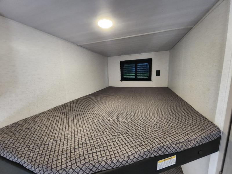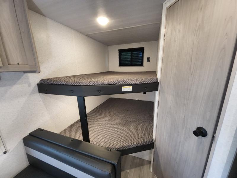 Bring the whole gang and explore with this bunkhouse travel trailer in tow! There is sleeping for up to 10 with double-size bunk beds, a queen bed up front, as well as a sofa and booth dinette that can accommodate more when reconfigured at night. You will easily be able to create meals to enjoy while camping inside with the two-burner range a 10 cu. ft. 12V refrigerator. Overhead storage is available above the stove and sink and along the opposite side. There is also a front pass-through for housing all of your outdoor gear, as well as additional outside storage beneath the bunk beds. The 12' power awning will also provide more living space and outdoor protection from the sun and/or rain.