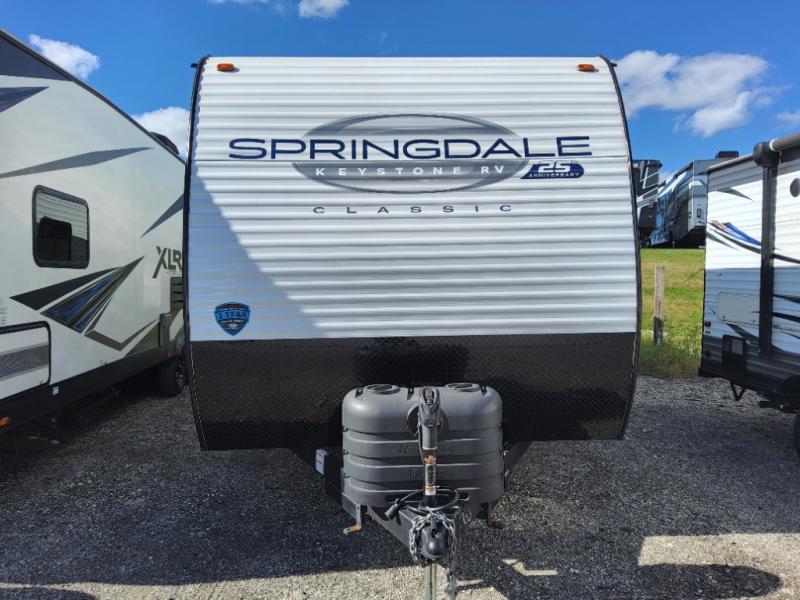 The Springdale Classic travel trailers by Keystone will provide you and your family many great outdoor experiences and it will also be kind to your pocketbook. Each one is constructed with an aluminum exterior, a walkable roof, and an I-beam frame with stamped steel cross-members and outriggers for added strength. There are also electric stabilizer jacks and power tongue jacks outside, along with a friction hinge entry door and an XL entry assist handle for added convenience. Each travel trailer includes a two burner flush mount gas range with a glass cover, LED lighting, bedside outlets, and blackout night shades inside that will provide you with more privacy at night. Some of the Keystone Exclusives you'll appreciate are the color-coded unified wiring and in-floor heating ducts, and the optional SolarFlex 200 will let you add off-grid capabilities if you choose!