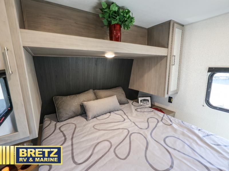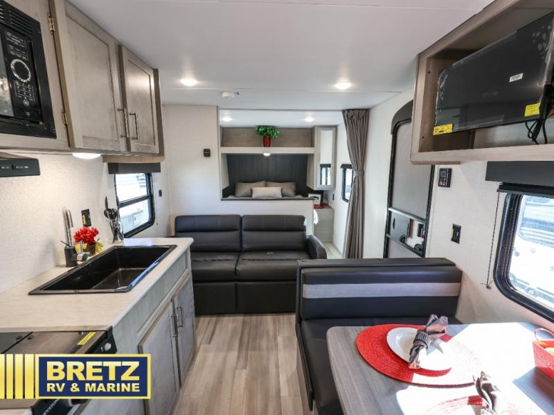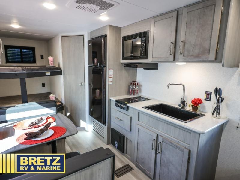 Bring the whole gang and explore with this bunkhouse travel trailer in tow! There is sleeping for up to 10 with double-size bunk beds, a queen bed up front, as well as a sofa and booth dinette that can accommodate more when reconfigured at night. You will easily be able to create meals to enjoy while camping inside with the two-burner range a 10 cu. ft. 12V refrigerator. Overhead storage is available above the stove and sink and along the opposite side. There is also a front pass-through for housing all of your outdoor gear, as well as additional outside storage beneath the bunk beds. The 12' power awning will also provide more living space and outdoor protection from the sun and/or rain.