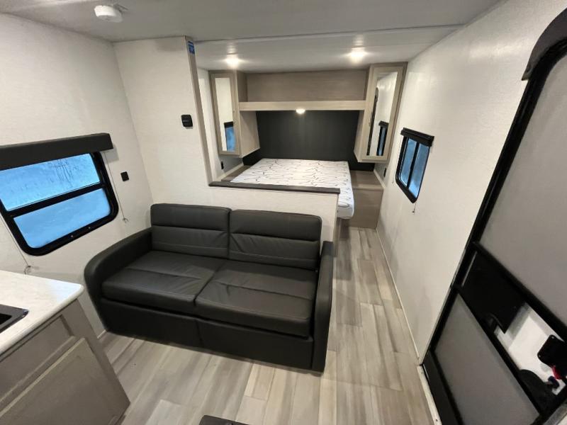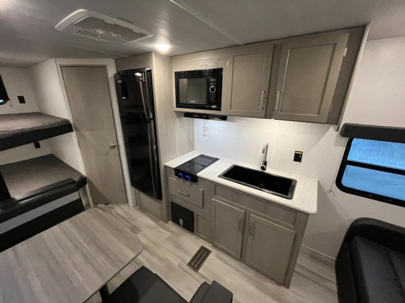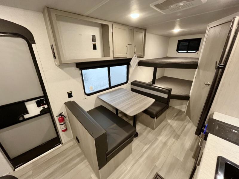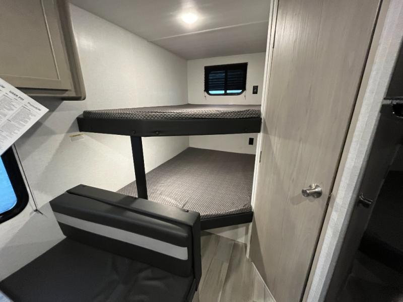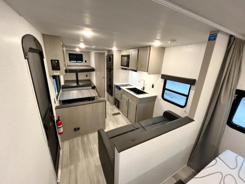 Bring the whole gang and explore with this bunkhouse travel trailer in tow! There is sleeping for up to 10 with double-size bunk beds, a queen bed up front, as well as a sofa and booth dinette that can accommodate more when reconfigured at night. You will easily be able to create meals to enjoy while camping inside with the two-burner range a 10 cu. ft. 12V refrigerator. Overhead storage is available above the stove and sink and along the opposite side. There is also a front pass-through for housing all of your outdoor gear, as well as additional outside storage beneath the bunk beds. The 12' power awning will also provide more living space and outdoor protection from the sun and/or rain.