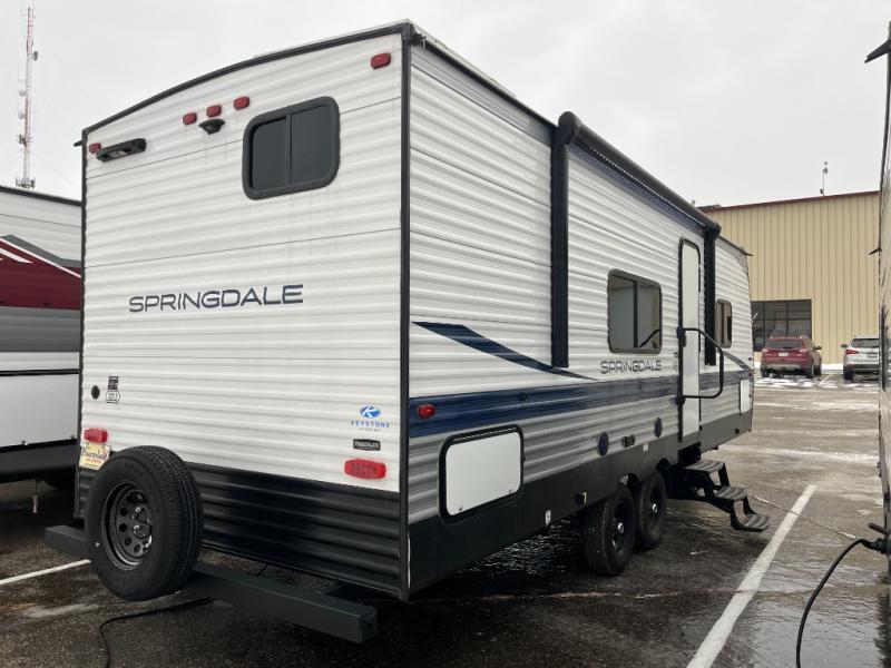 The Springdale Classic travel trailers by Keystone will provide you and your family many great outdoor experiences and it will also be kind to your pocketbook. Each one is constructed with an aluminum exterior, a walkable roof, and an I-beam frame with stamped steel cross-members and outriggers for added strength. There are also electric stabilizer jacks and power tongue jacks outside, along with a friction hinge entry door and an XL entry assist handle for added convenience. Each travel trailer includes a two burner flush mount gas range with a glass cover, LED lighting, bedside outlets, and blackout night shades inside that will provide you with more privacy at night. Some of the Keystone Exclusives you'll appreciate are the color-coded unified wiring and in-floor heating ducts, and the optional SolarFlex 200 will let you add off-grid capabilities if you choose!