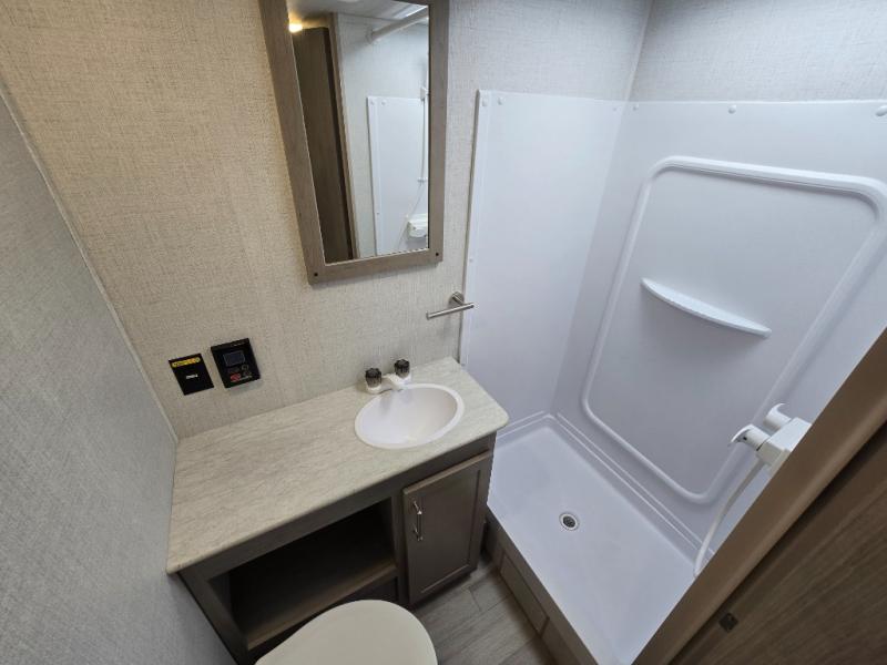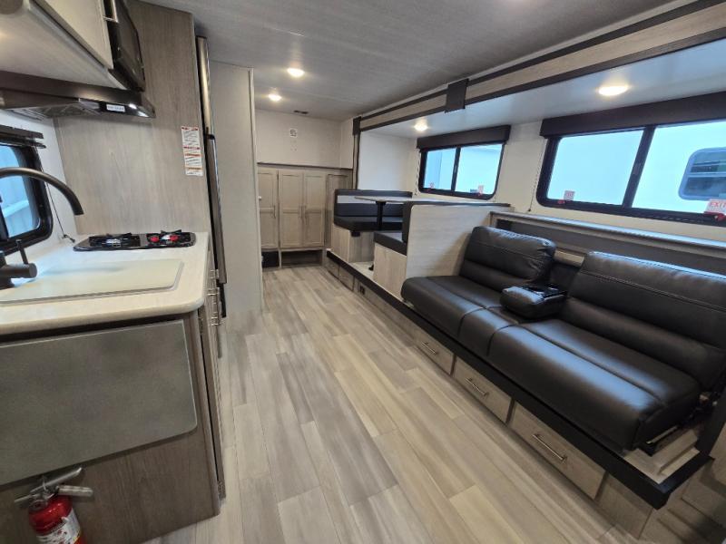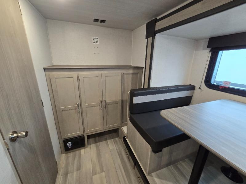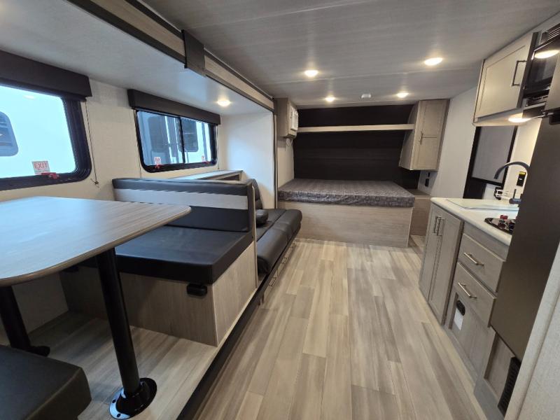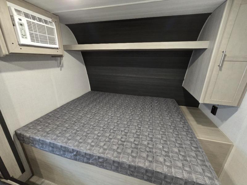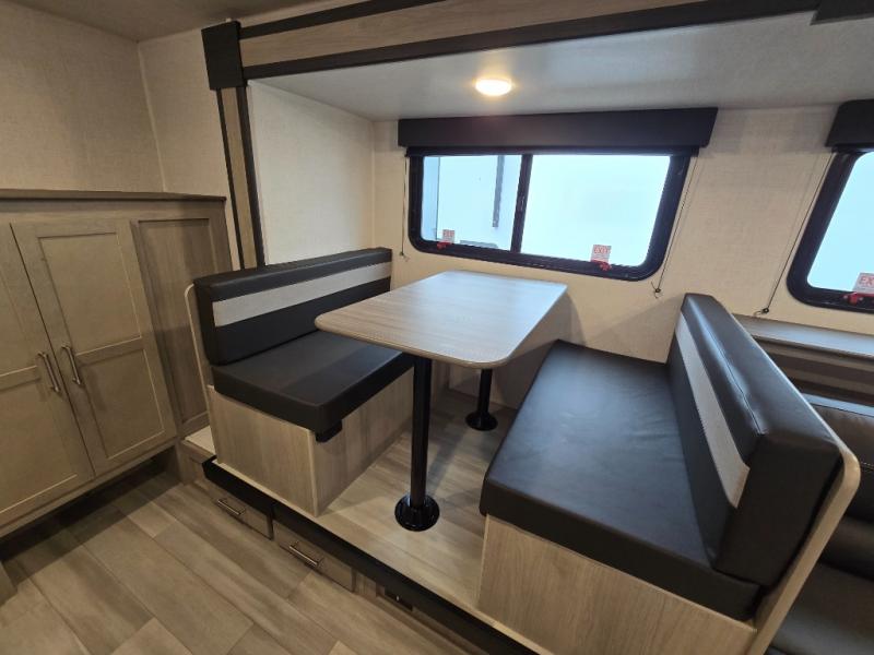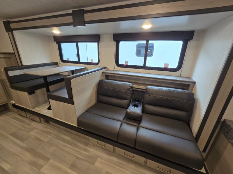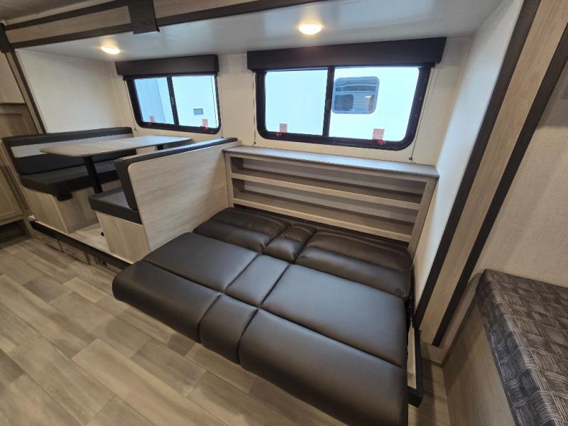 When you want to explore the outdoors and relax indoors, this trailer will provide the comforts, conveniences and many of the wants you will need to do both! The interior is spacious with the large slide out which includes a booth dinette and sofa, both with drawer storage. And the furniture doubles as sleeping space when you have overnight guests. There is a pantry/wardrobe combo next to the full bathroom which is handy, and the galley kitchen offers a 7.7 cu. ft. 12V refrigerator to store the cold items. You will also sleep soundly each night on the front queen bed. The exterior offers a 15' power awning plus a pass-through compartment for your outdoor camping chairs, tables, charcoal and more.