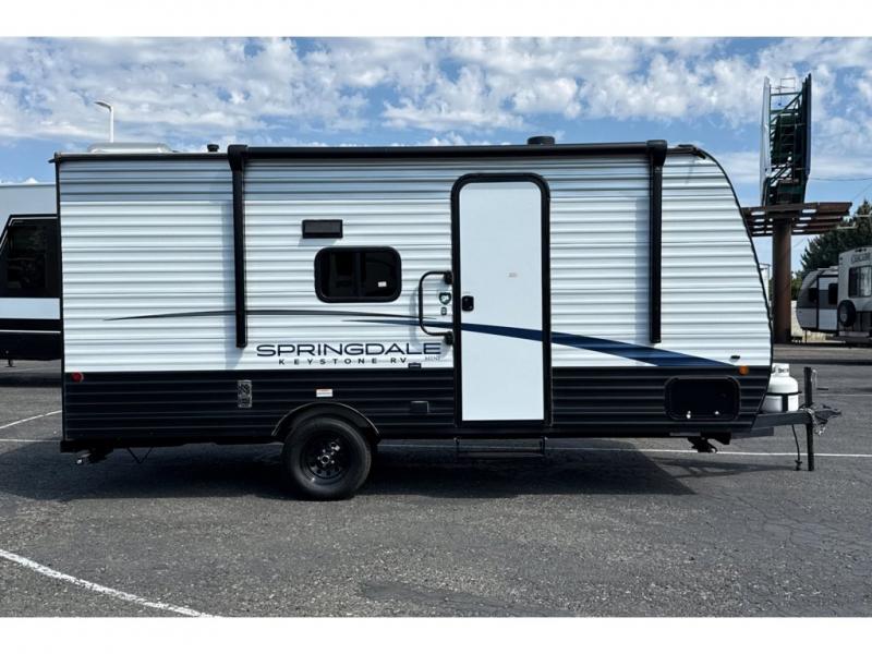 With any Springdale Classic Mini travel trailer by Keystone, you will enjoy lightweight towing thanks to their single-axle! You'll find the XL entry assist handle will make entering and exiting your unit easier than ever, and the power awning will provide protection from the sun as you relax in your camp chairs outside. The interior is made bright and open thanks to the LED lighting and each model includes cozy sleeping space, ample storage, and seating spaces for your crew. There are also additional features found on select models, so come take a look!
