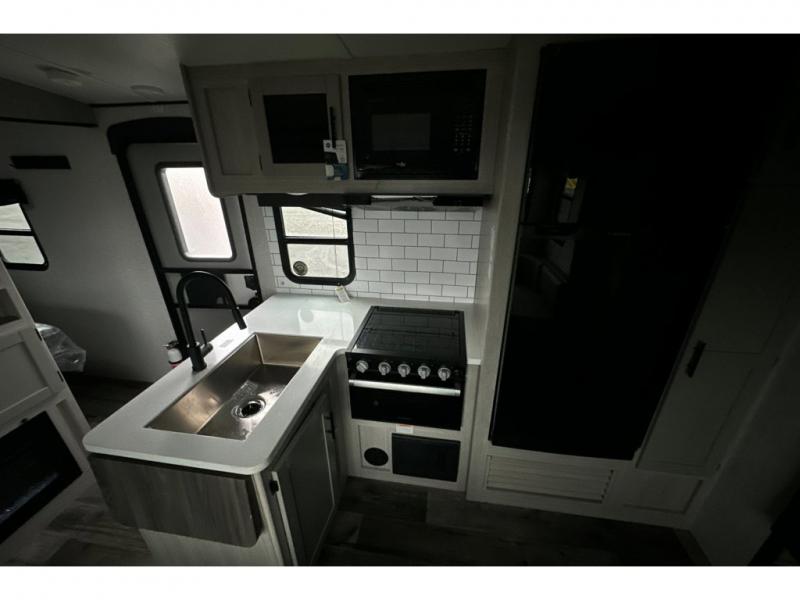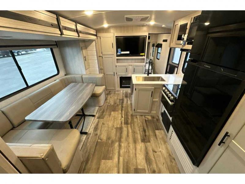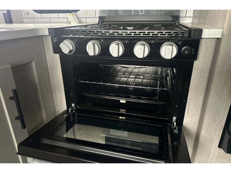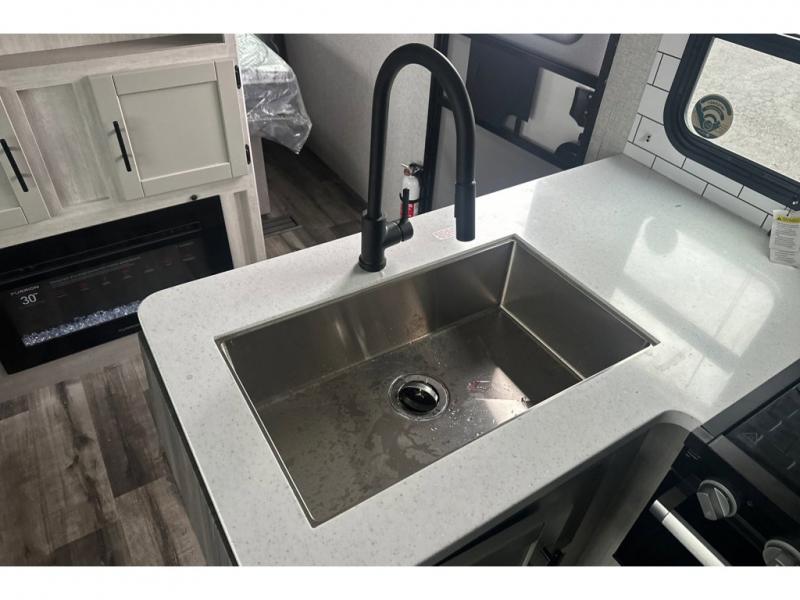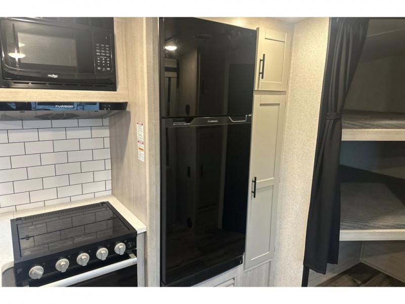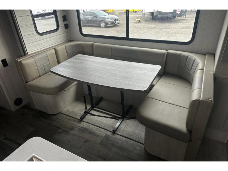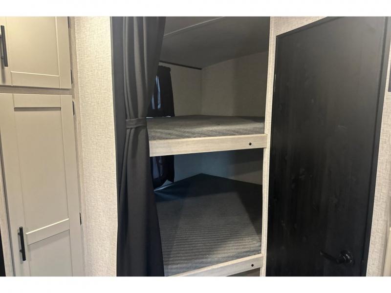 From the front private bedroom with a king bed and a slide out, to the rear corner bath and double-size bunks, you will love everything about this travel trailer. When you wake up in the morning you can prepare breakfast on the exterior camp kitchen, and if it's raining outside, the glass top range indoors will get the job done. There is also a stainless steel microwave for quick meals, and the wardrobe/pantry can store paper goods and the kids' cereal. Play a game of cards around the U-shaped dinette before heading off to bed in the front private bedroom!
