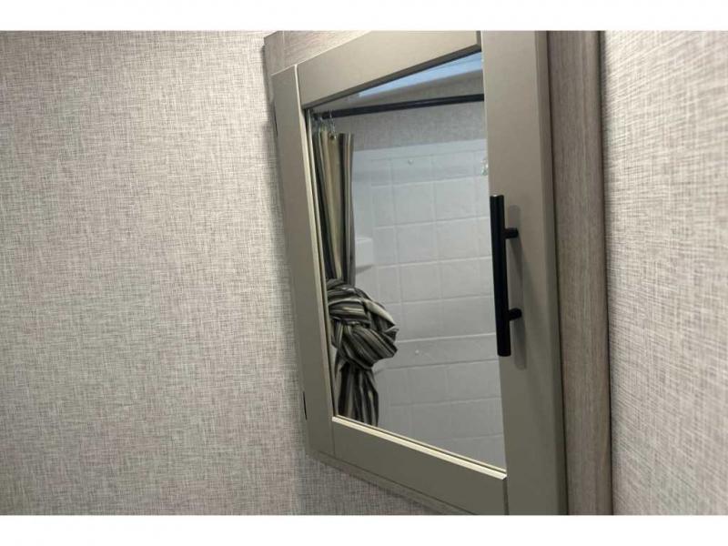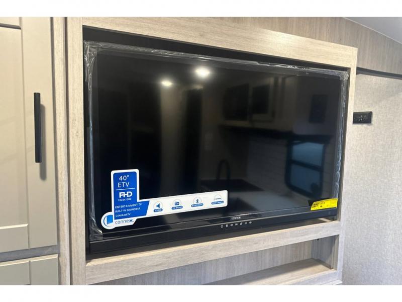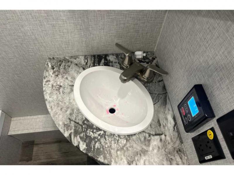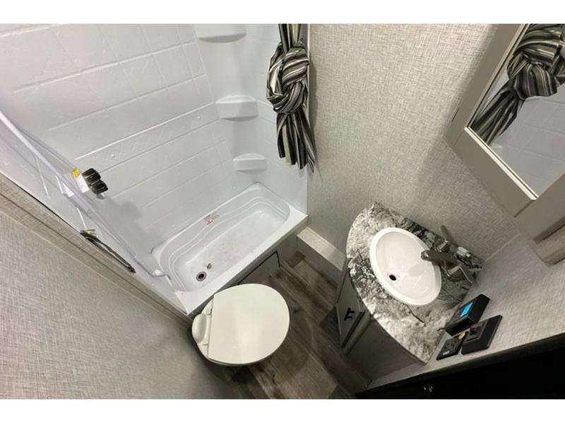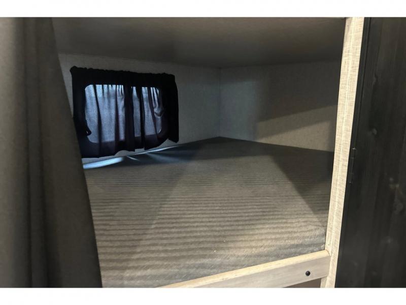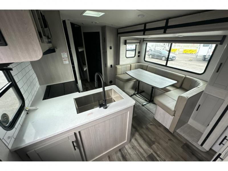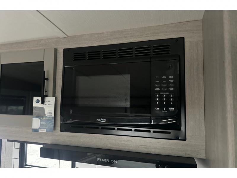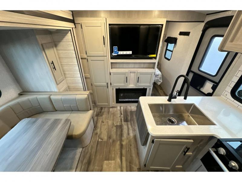 From the front private bedroom with a king bed and a slide out, to the rear corner bath and double-size bunks, you will love everything about this travel trailer. When you wake up in the morning you can prepare breakfast on the exterior camp kitchen, and if it's raining outside, the glass top range indoors will get the job done. There is also a stainless steel microwave for quick meals, and the wardrobe/pantry can store paper goods and the kids' cereal. Play a game of cards around the U-shaped dinette before heading off to bed in the front private bedroom!