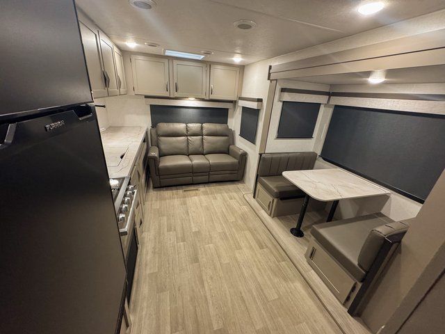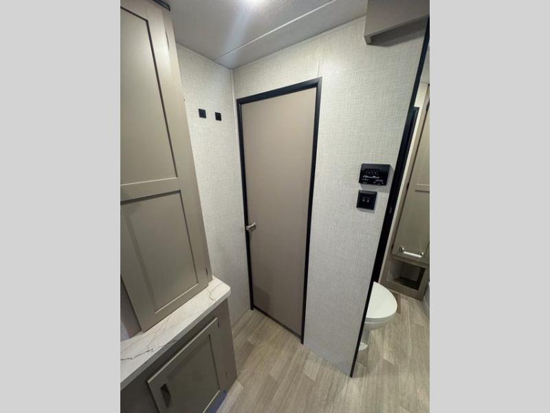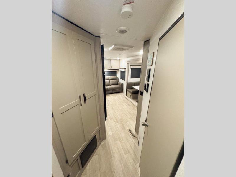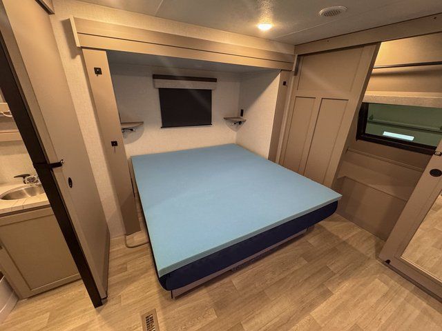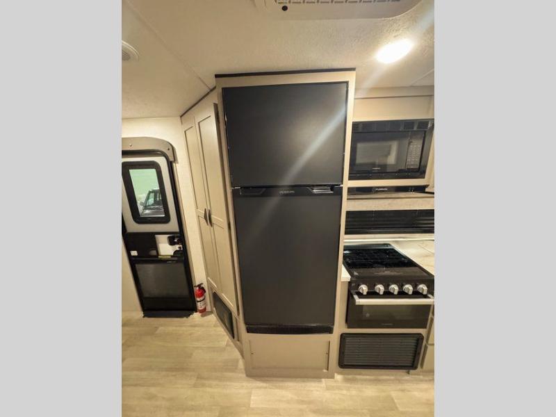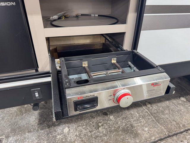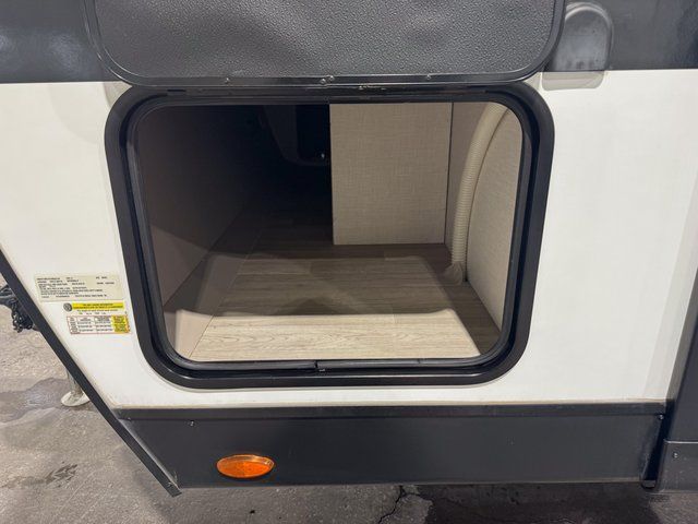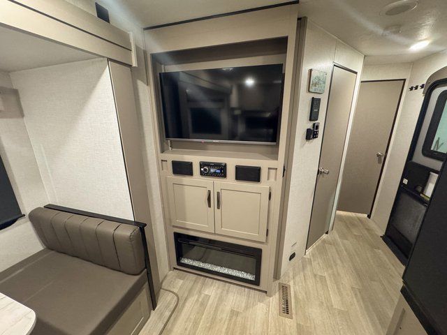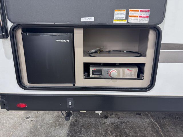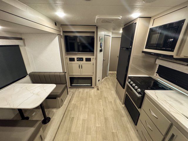 This is the perfect couple's travel trailer! You will enjoy added space in the living area because of the single slide that holds the booth dinette or optional table and chairs, and another convenient feature is the dual-entry bathroom that can be accessed from the main hallway or the bedroom. You will be quite surprised to find a king-size bed slide inside the bedroom, but you will be immensely happy that it's there come bedtime. A pass-through storage on the exterior allows you to bring along extra gear, and the interior is kept cozy on chilly fall evenings with the 30" fireplace. There is even an outside kitchen to grill up the catch of the day outdoors!