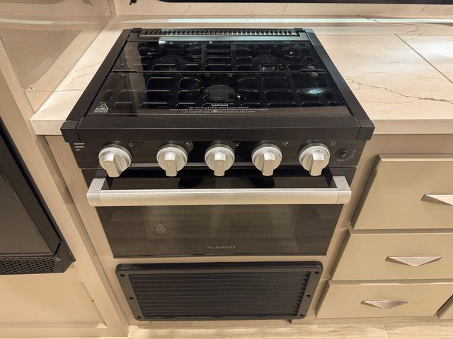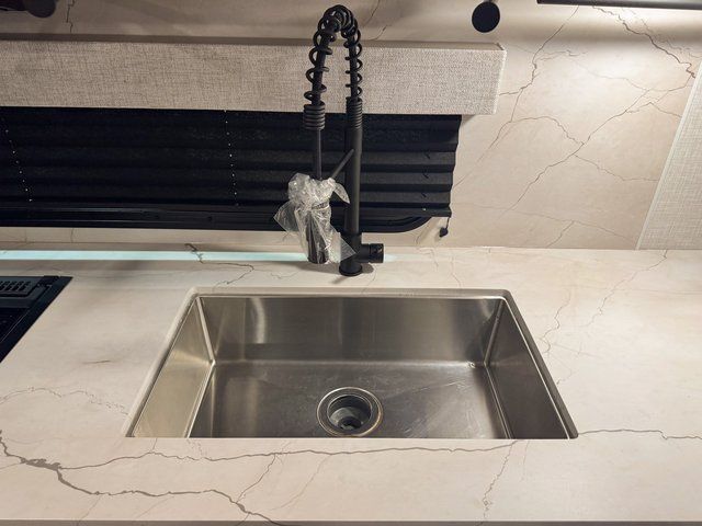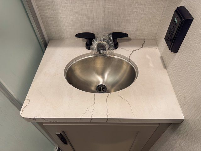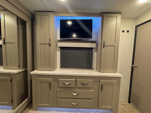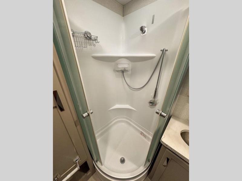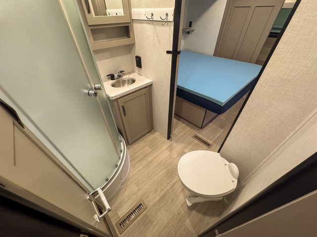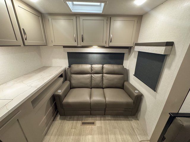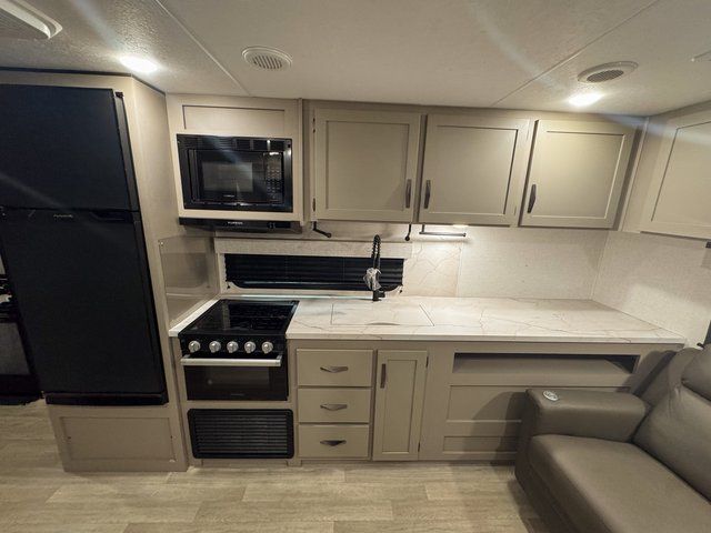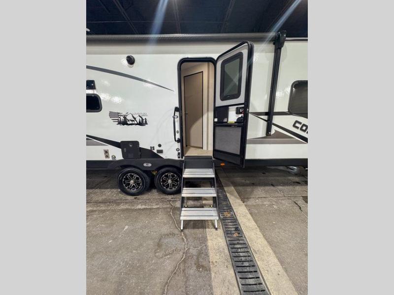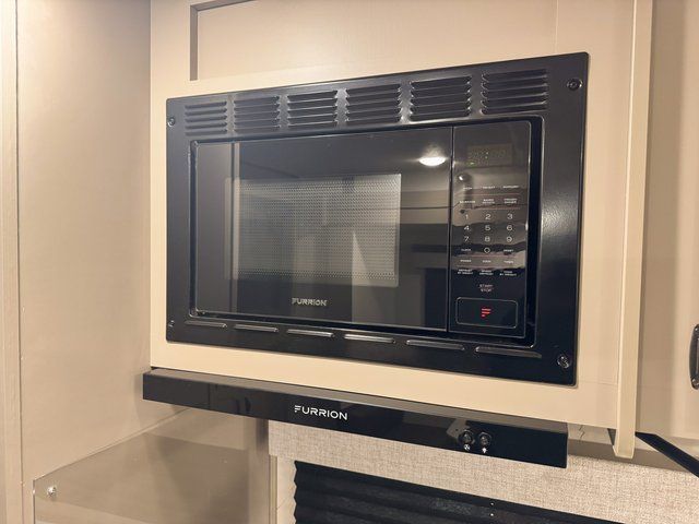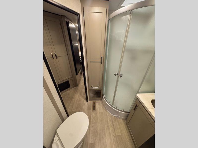 This is the perfect couple's travel trailer! You will enjoy added space in the living area because of the single slide that holds the booth dinette or optional table and chairs, and another convenient feature is the dual-entry bathroom that can be accessed from the main hallway or the bedroom. You will be quite surprised to find a king-size bed slide inside the bedroom, but you will be immensely happy that it's there come bedtime. A pass-through storage on the exterior allows you to bring along extra gear, and the interior is kept cozy on chilly fall evenings with the 30" fireplace. There is even an outside kitchen to grill up the catch of the day outdoors!