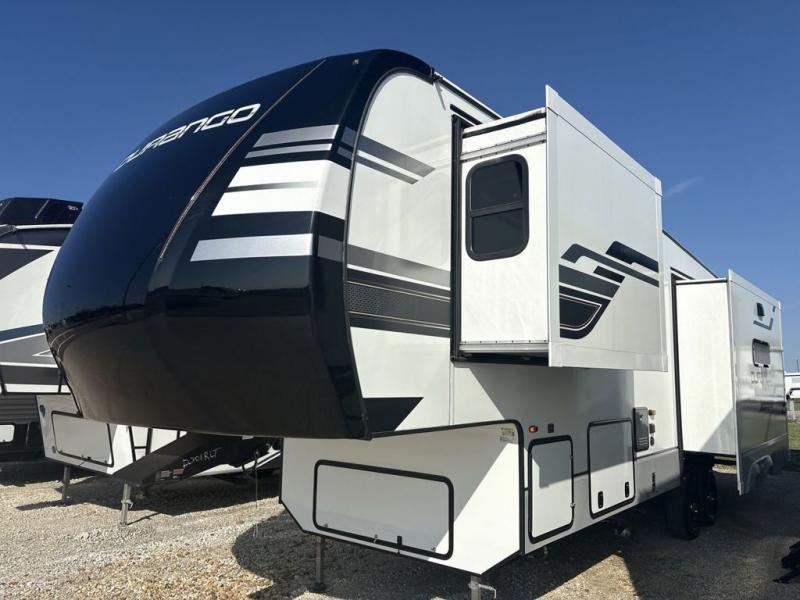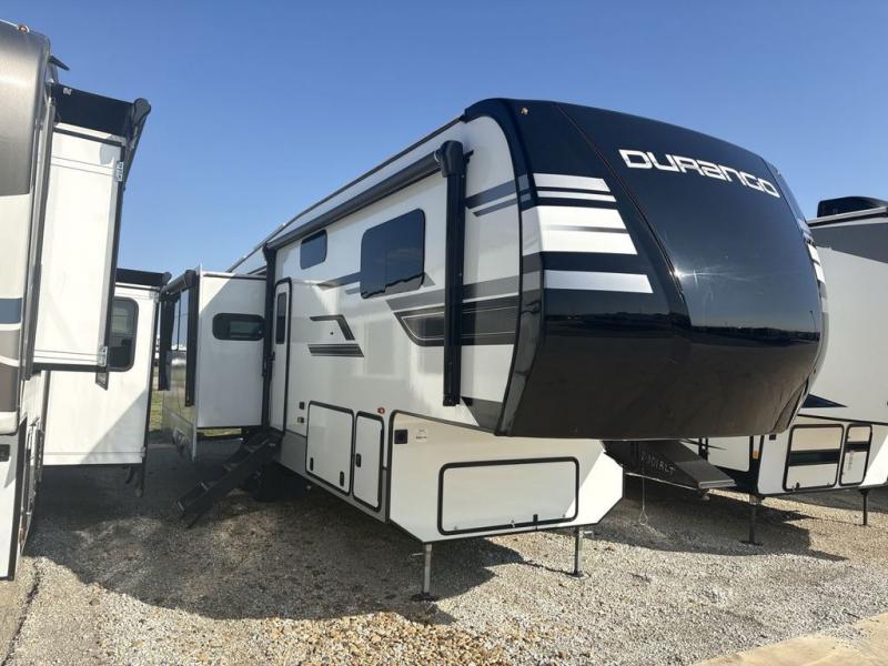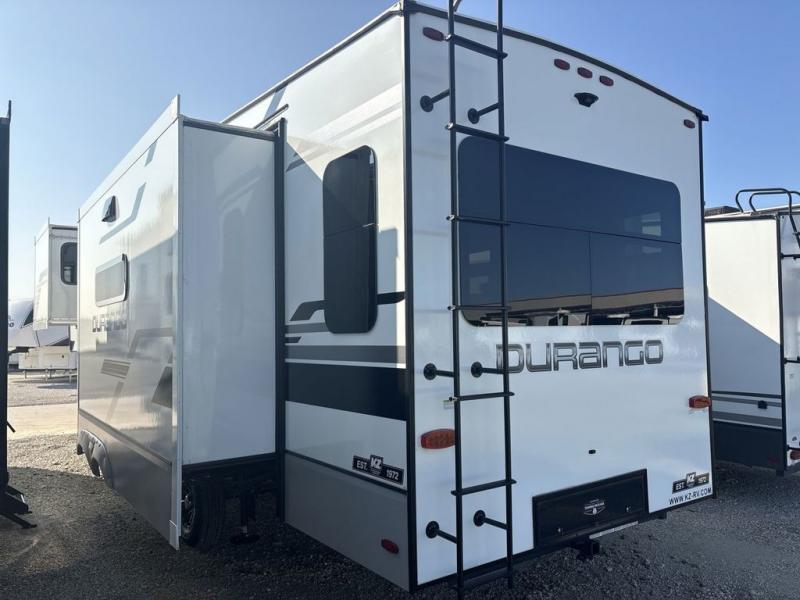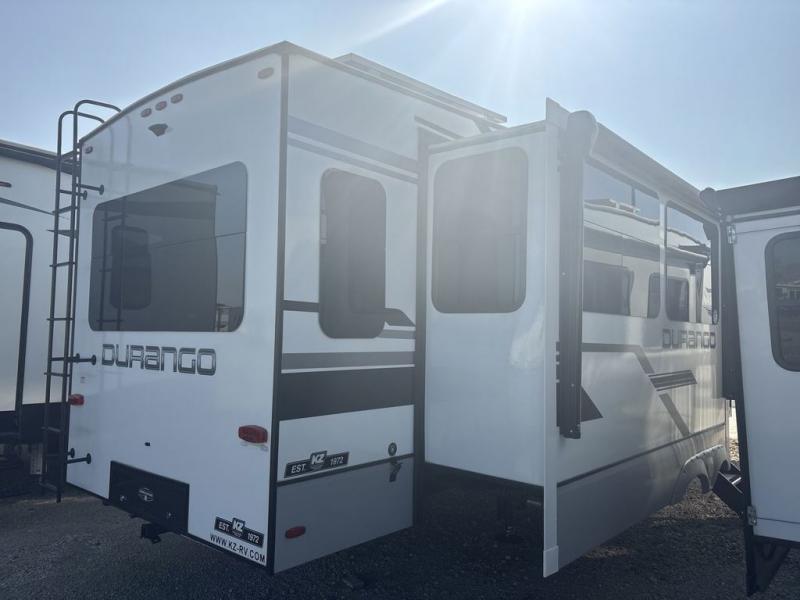 Enjoy full time living, an affordable price, and a wide body construction for more living space with every one of these KZ Durango light high-profile fifth wheels! These luxury units can be used all year round with the all-weather insulation package, the 3" x 14" foam-core in-floor straight-line heating system with a 35,000 BTU furnace, and the 15,000 BTU ducted roof A/C which optimizes the airflow by an average of 40% for better performance, cooling time, and reduction of noise. A few other construction features you will appreciate include a one piece, seamless walk-on Tufflex roofing material, Pex® in-floor heated waterlines, a Lamilux® gelcoat fiberglass exterior, and Dexter® axles with self adjusting brakes and height adjusting hangers. You can even venture off the beaten path with the now standard Off-The-Grid Solar Package that comes with two 220W solar panels. Inside, modern farmhouse cabinetry, a king size bed, and smart TVs will have you feeling like you never left home!
