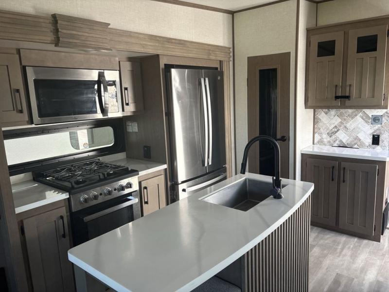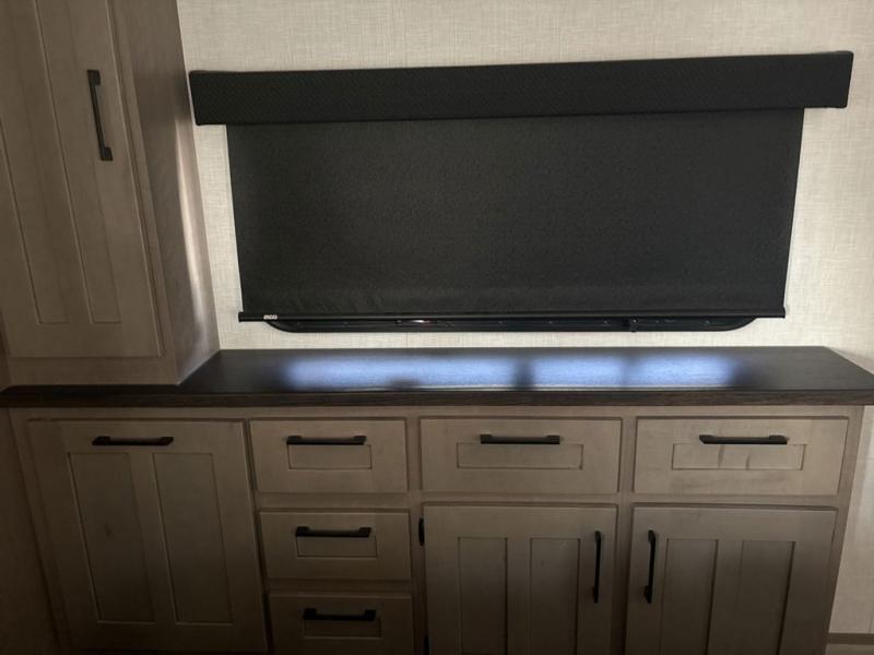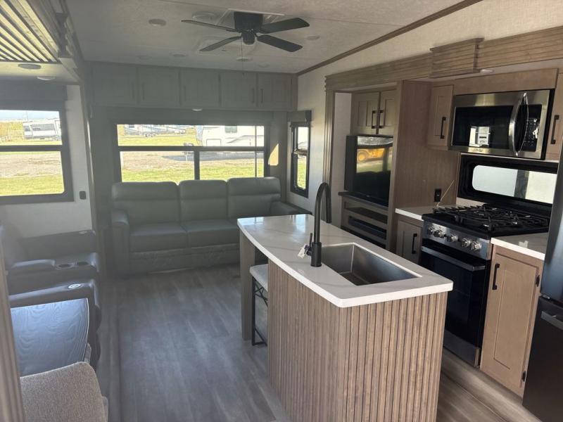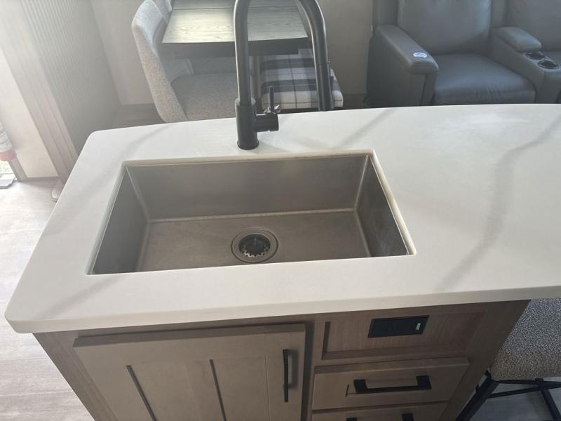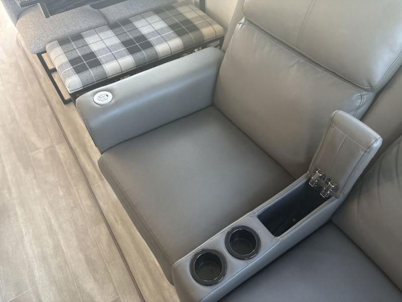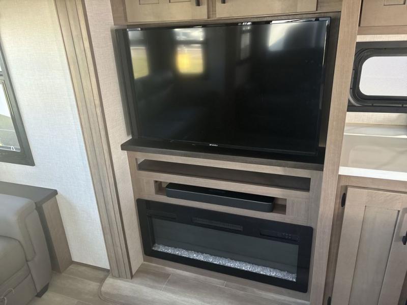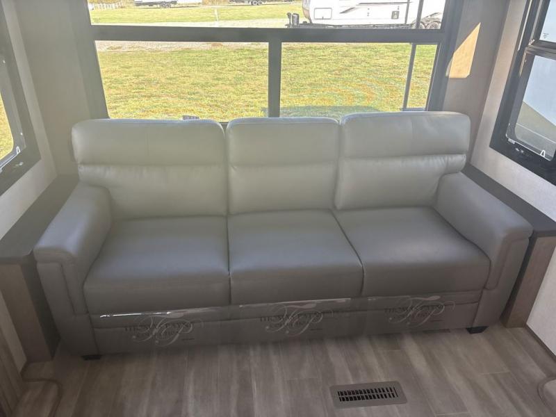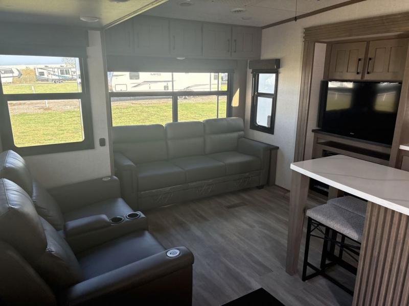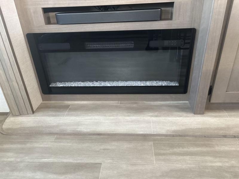 Start camping in luxury with this fifth wheel! The front private bedroom has a king bed slide which can be switched for an optional queen instead, a dresser with a built-in hamper, and a front wardrobe with washer and dryer prep. Start each morning feeling clean and fresh after showering in the 48" x 30" residential shower with a seat in the full bathroom. The kitchen has an island with two bar stools to enjoy your morning coffee while reading the newspaper and socializing with the chef whipping up some scrambled eggs on the four burner range. The hutch can store your dishes, the pantry can store your canned goods, and the 18 cu. ft. refrigerator will keep your perishables fresh. If mother nature is raining on your parade then read a book on the rear hide-a-bed sofa or relax in the theater seating which has USB charging. And the entertainment center with a fireplace and 43" smart LED TV will keep you entertained!