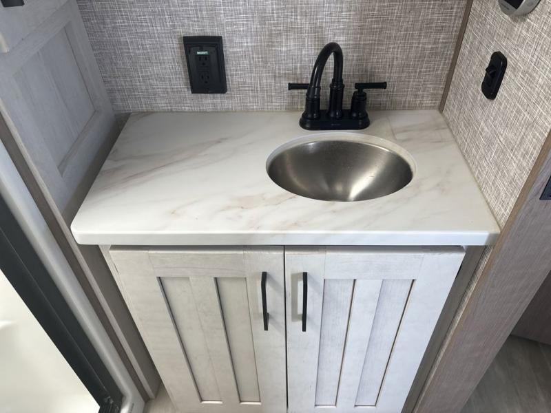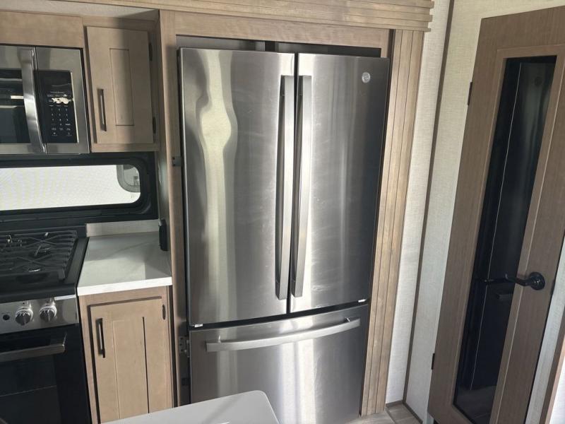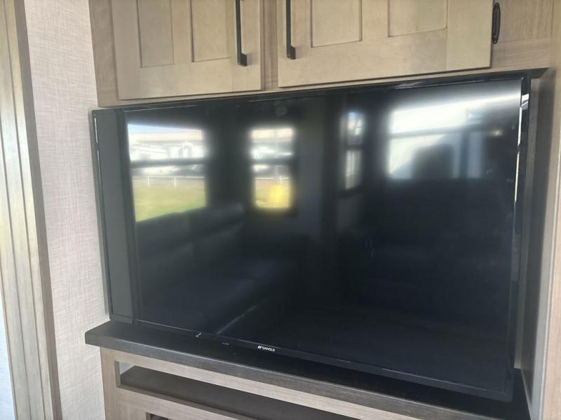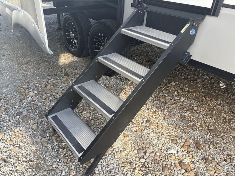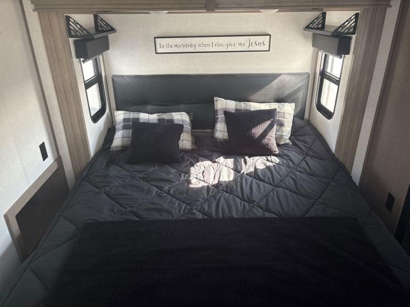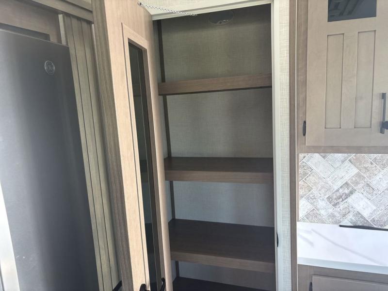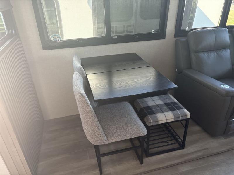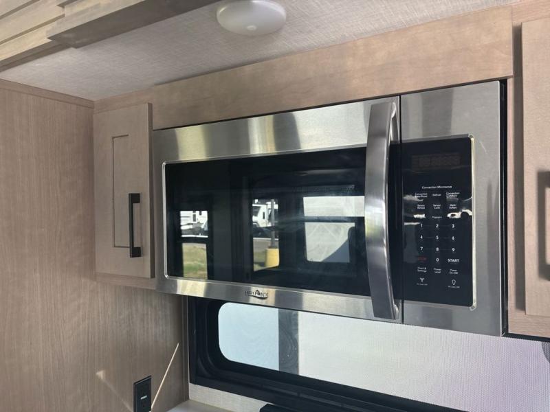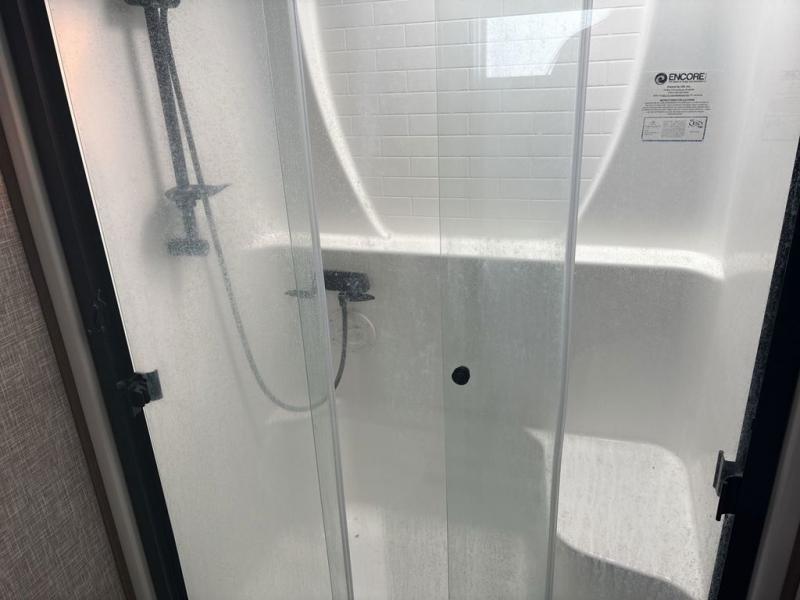 Start camping in luxury with this fifth wheel! The front private bedroom has a king bed slide which can be switched for an optional queen instead, a dresser with a built-in hamper, and a front wardrobe with washer and dryer prep. Start each morning feeling clean and fresh after showering in the 48" x 30" residential shower with a seat in the full bathroom. The kitchen has an island with two bar stools to enjoy your morning coffee while reading the newspaper and socializing with the chef whipping up some scrambled eggs on the four burner range. The hutch can store your dishes, the pantry can store your canned goods, and the 18 cu. ft. refrigerator will keep your perishables fresh. If mother nature is raining on your parade then read a book on the rear hide-a-bed sofa or relax in the theater seating which has USB charging. And the entertainment center with a fireplace and 43" smart LED TV will keep you entertained!