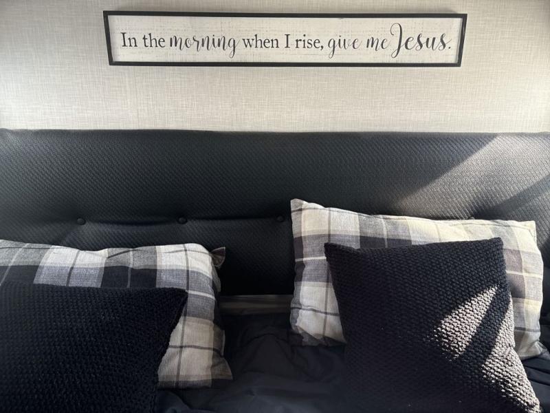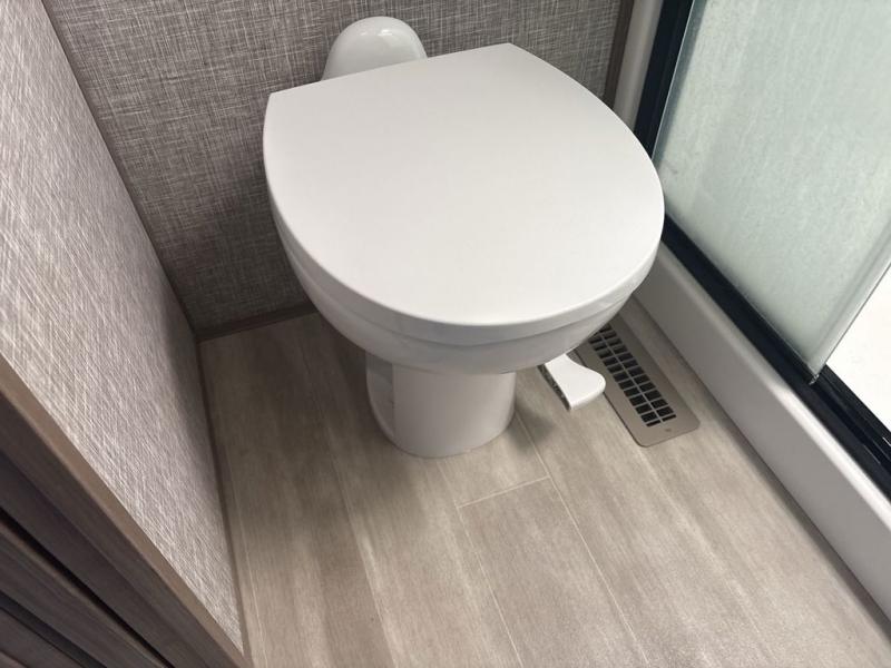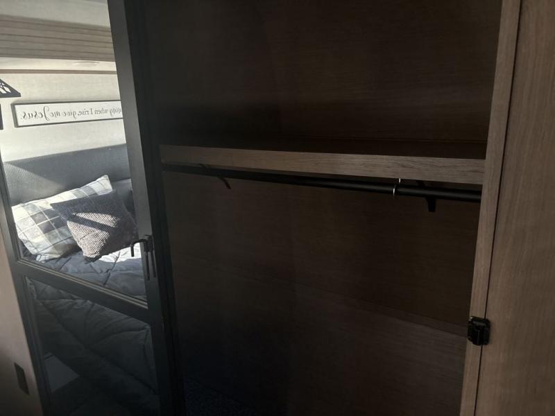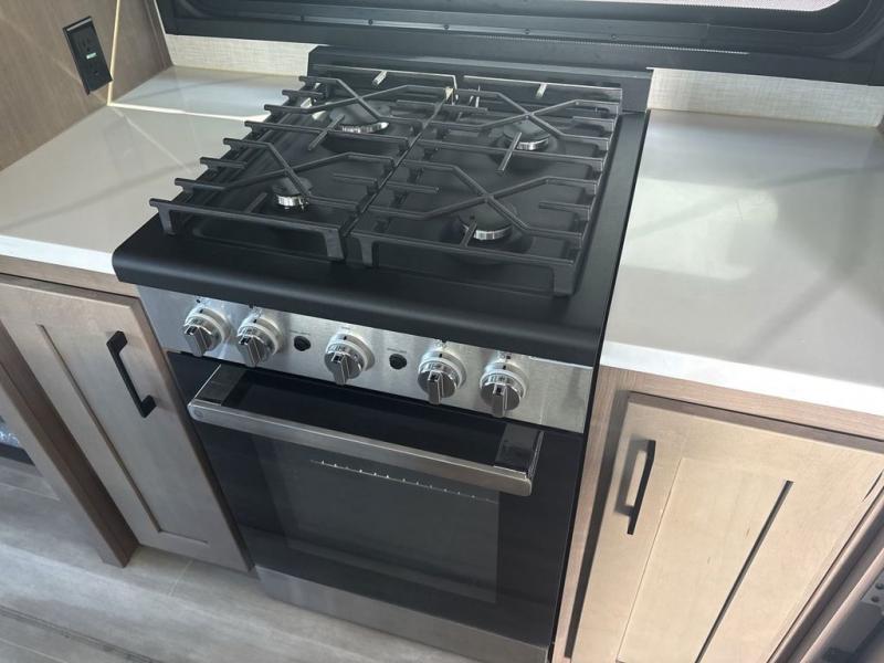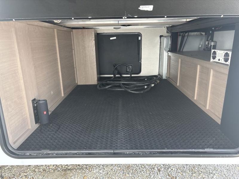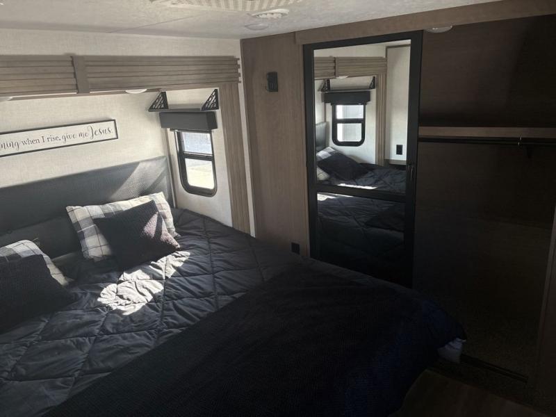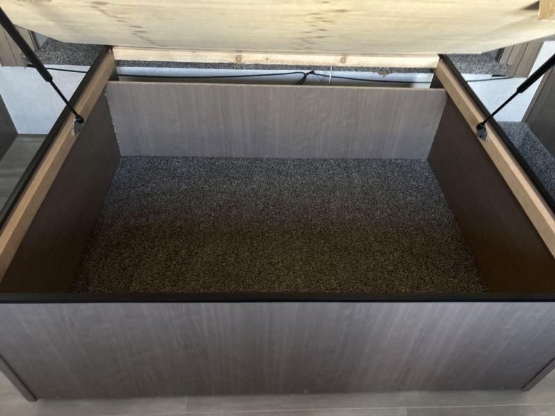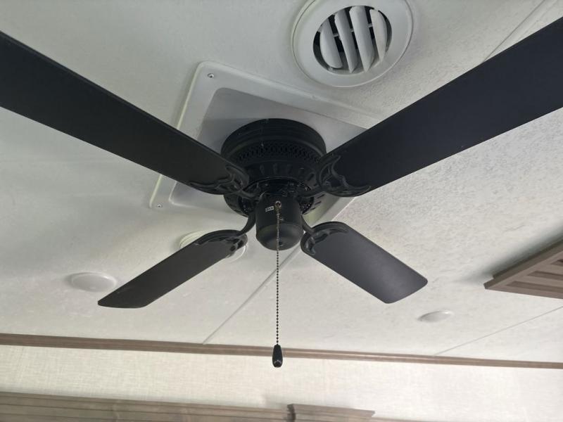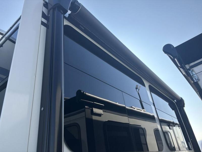 Start camping in luxury with this fifth wheel! The front private bedroom has a king bed slide which can be switched for an optional queen instead, a dresser with a built-in hamper, and a front wardrobe with washer and dryer prep. Start each morning feeling clean and fresh after showering in the 48" x 30" residential shower with a seat in the full bathroom. The kitchen has an island with two bar stools to enjoy your morning coffee while reading the newspaper and socializing with the chef whipping up some scrambled eggs on the four burner range. The hutch can store your dishes, the pantry can store your canned goods, and the 18 cu. ft. refrigerator will keep your perishables fresh. If mother nature is raining on your parade then read a book on the rear hide-a-bed sofa or relax in the theater seating which has USB charging. And the entertainment center with a fireplace and 43" smart LED TV will keep you entertained!