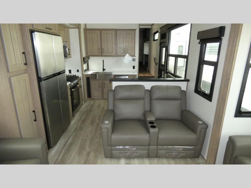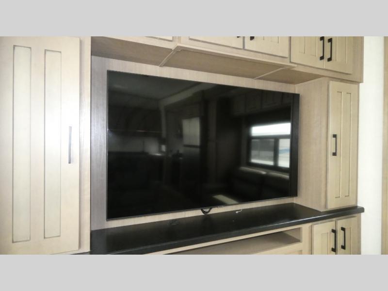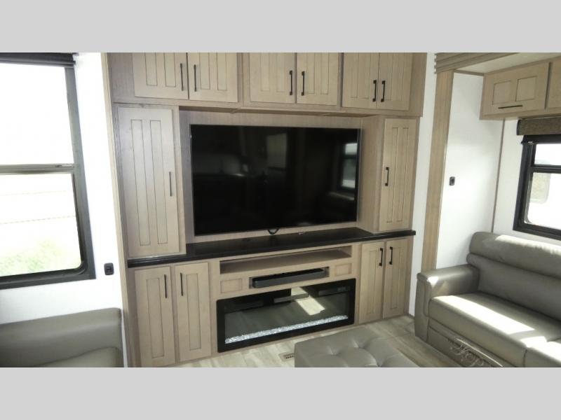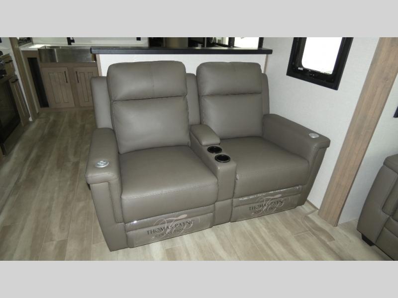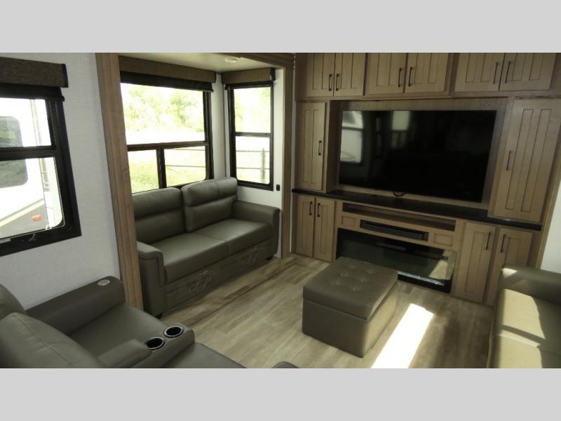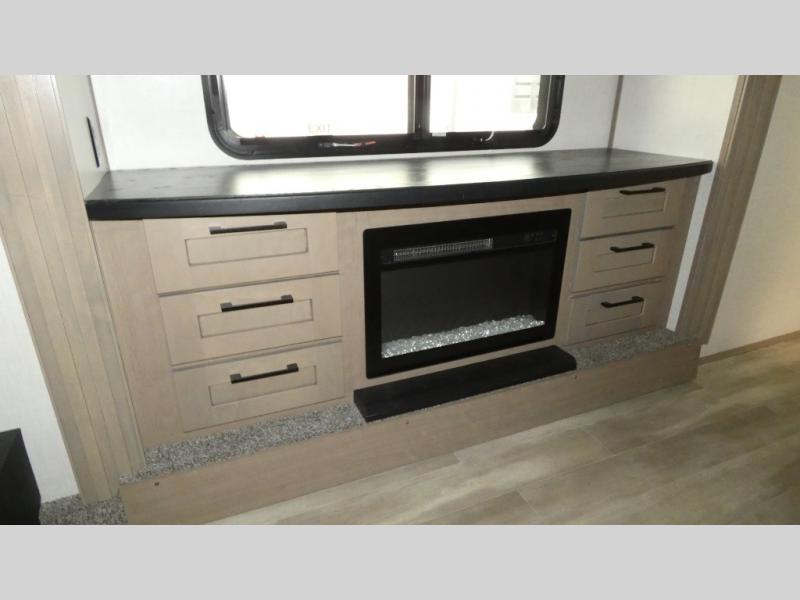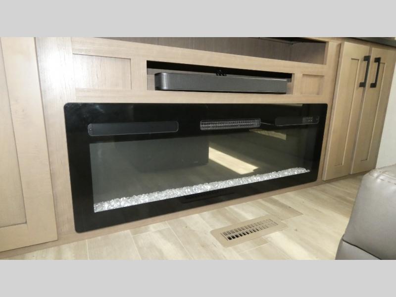 Enjoy a home away from home with this fifth wheel! The front private bedroom has an electric tilt king bed slide for extra comfort, a dresser with a TV, and a front closet with washer and dryer prep next to a built-in hamper so it will be easy to transfer your dirty clothes into the washer. Freshen up each morning in the full bathroom with the 48" x 30" residential shower with a seat. The chef will love cooking in the kitchen with the four burner range with 24" oven and love the dishwasher even more for easy clean ups. There is also a table with booth seating on one side and two chairs on the other to enjoy your meals. You could even cook at the outside griddle too. The rear living area offers a comfortable place to socialize together at night while relaxing on either one of the opposing hide-a-bed sofa slides or the theater seating with USB ports across from the 65" TV with 48" fireplace!