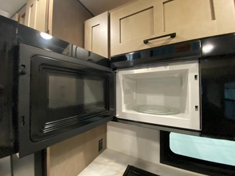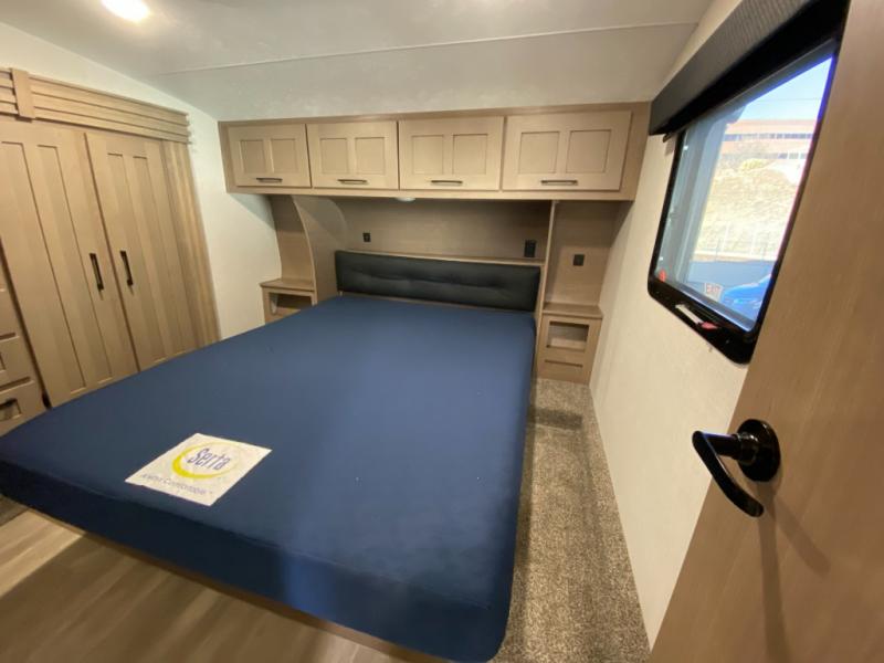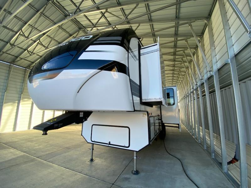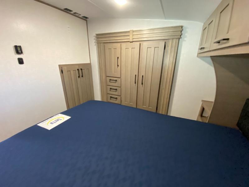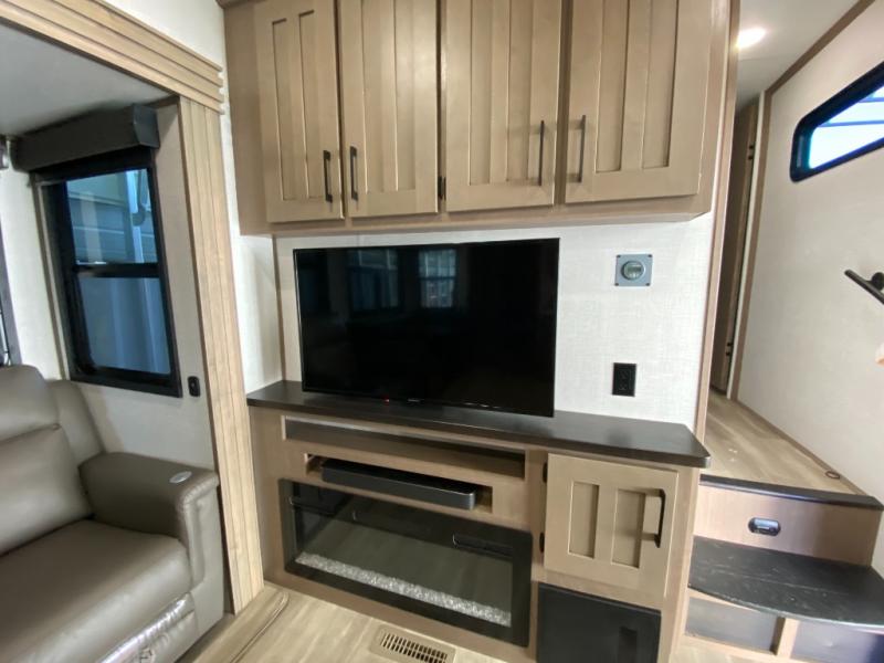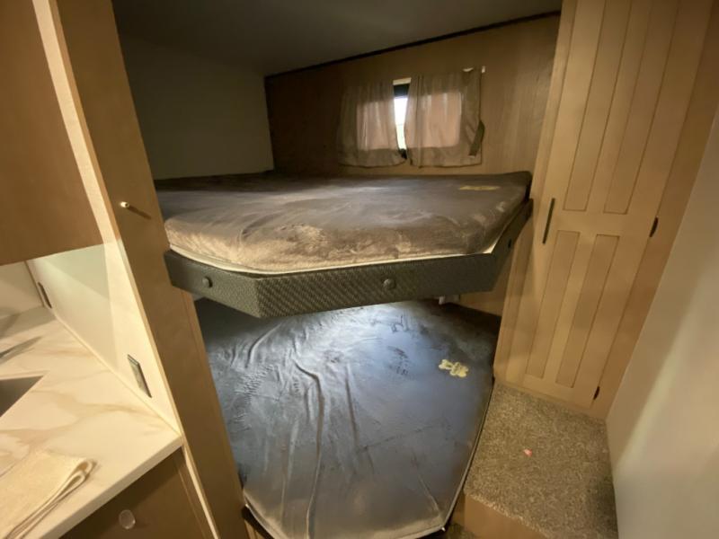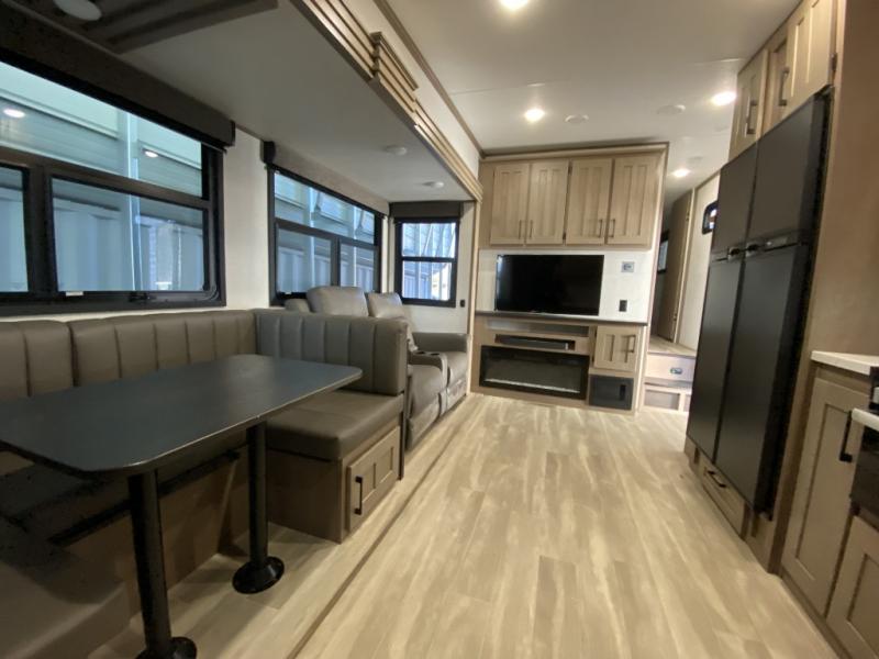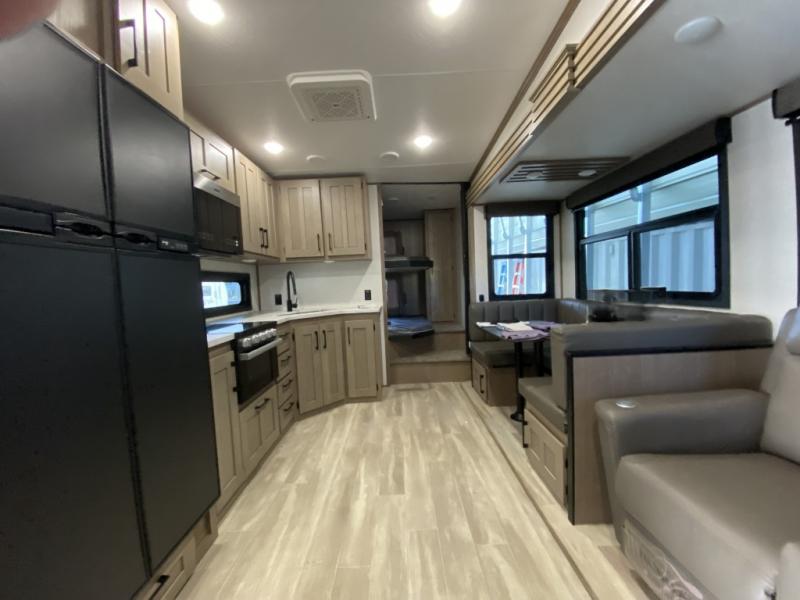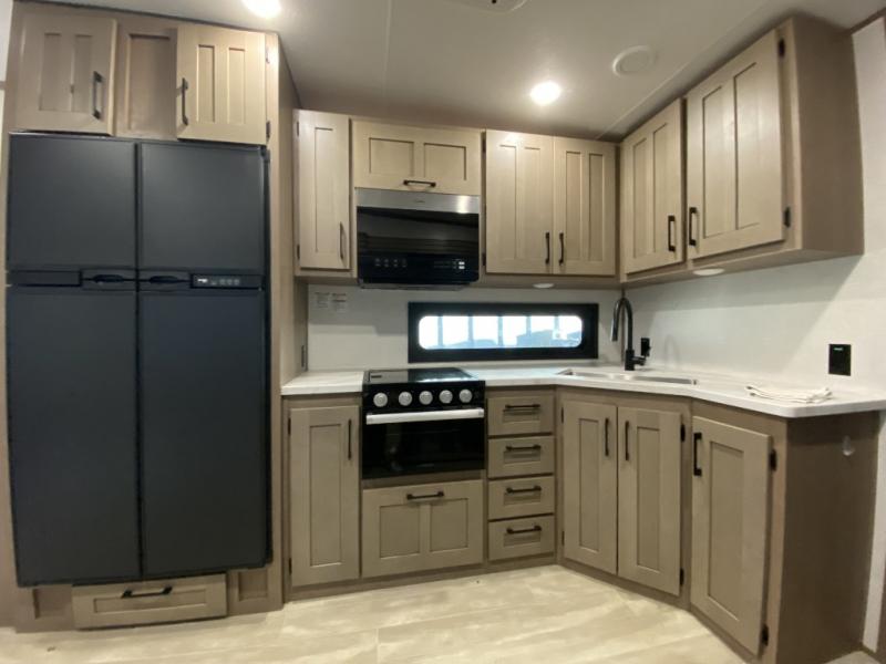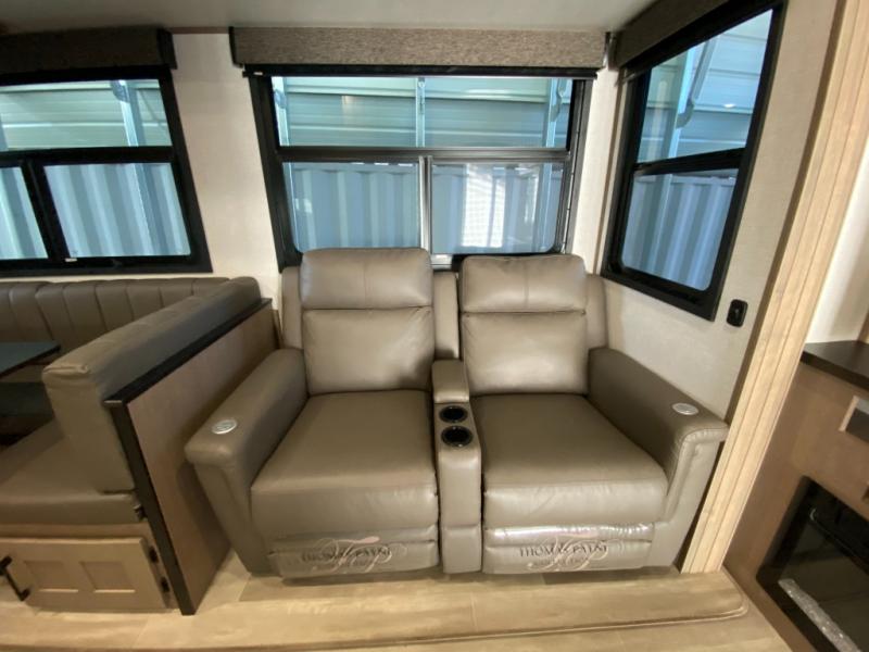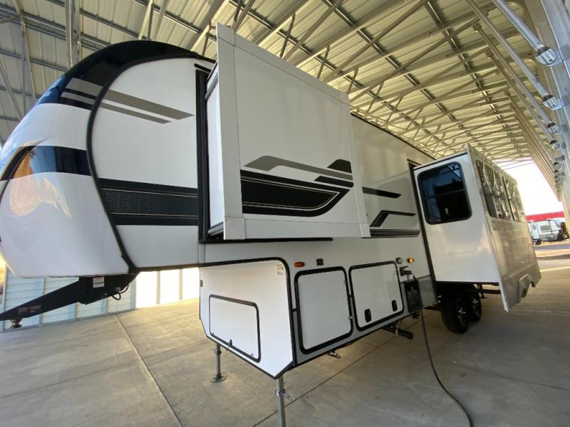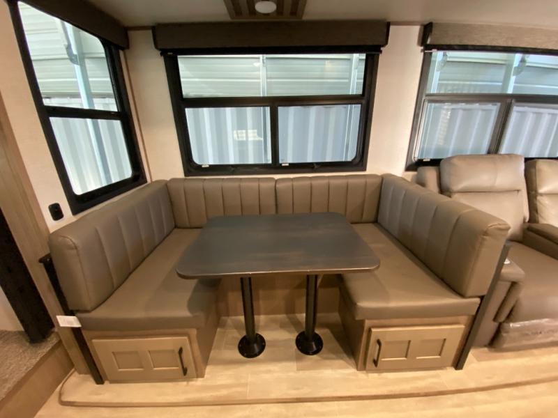 This fifth wheel is perfect for camping with a large group or family since it can sleep ten people each night! There are queen-size bunks, a U-shaped dinette, a hide-a-bed sofa, plus a queen bed in the front private bedroom. And if you'd rather have theater seating in place of the sofa, you can choose that option! The chef will have their choice to cook indoors on the three burner drop-in cooktop or outdoors on the outside griddle, plus there are two power awnings here for maximum shade. Don't let this fifth wheel slip away!
