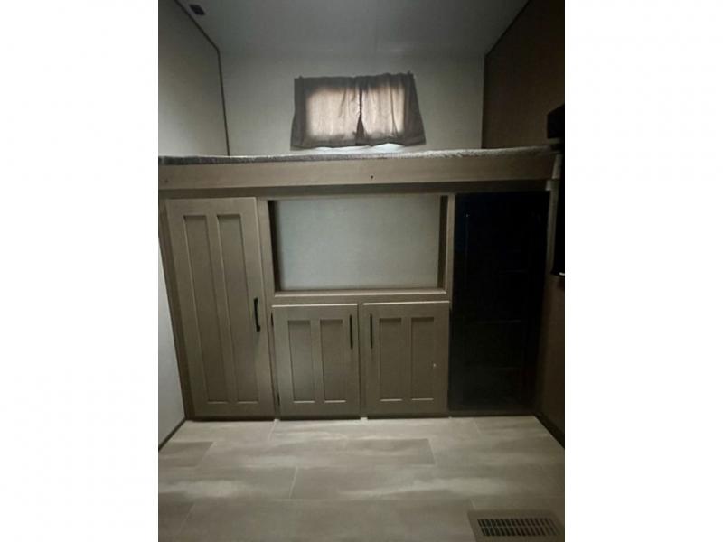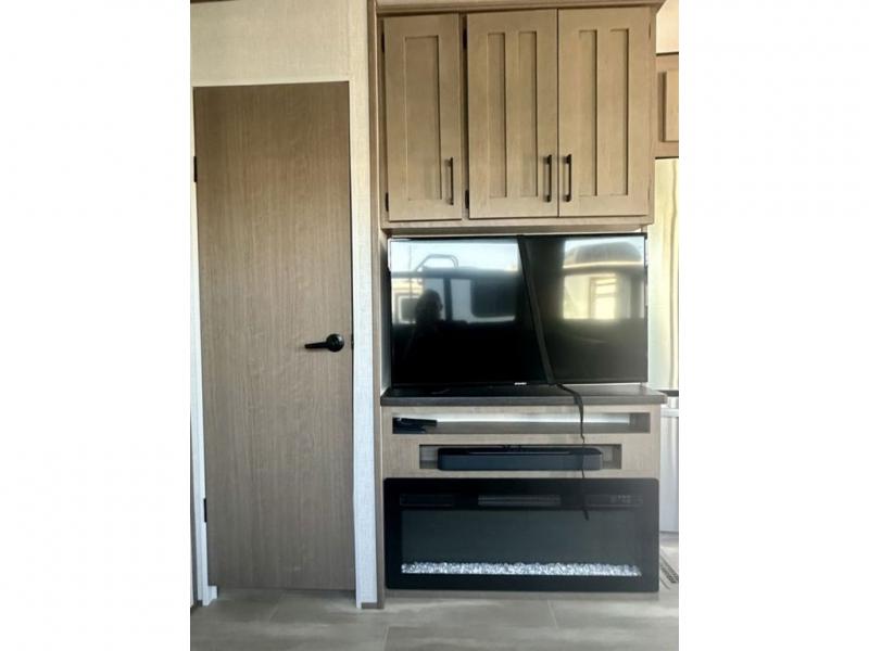 Your guests will feel right at home when they go camping with you since they will have their own bunkhouse suite with a half bath! There are three bunks here, plus an entertainment center if they choose to add a TV. The spacious full bath is up by the front private bedroom, and here you'll enjoy a queen bed, a slide out wardrobe, plus a closet with washer and dryer prep. Everyone can meet in the main living area at the booth dinette, or on the theater seating, plus this area includes a 43" Smart LED TV and an optional 40" fireplace can be added. Head outdoors to cook on the outside kitchen that includes a griddle, a sink, plus a refrigerator. There is also a 13' power awning here, and a second optional 11" awning can be added for even more shade!